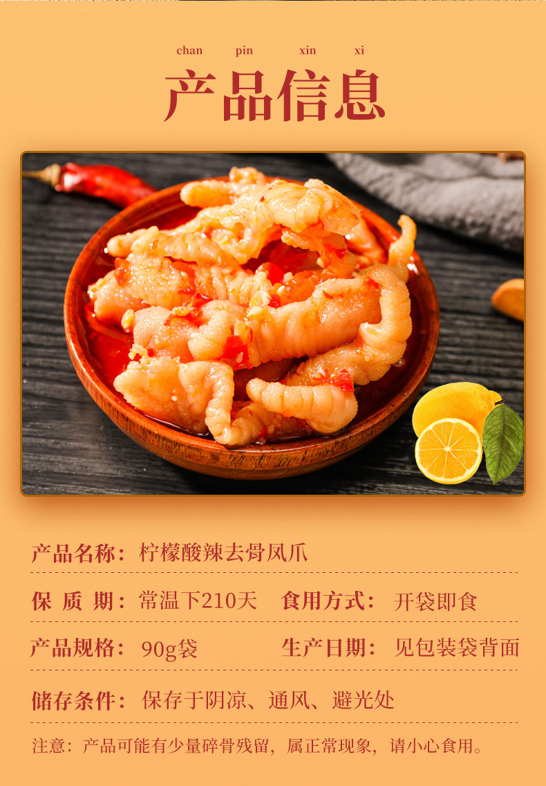 작은 오리 새콤달콤 레몬 닭발 90g 순살 고추장아찌 닭발 오리발 바삭한 델리카트슨 스낵 도매