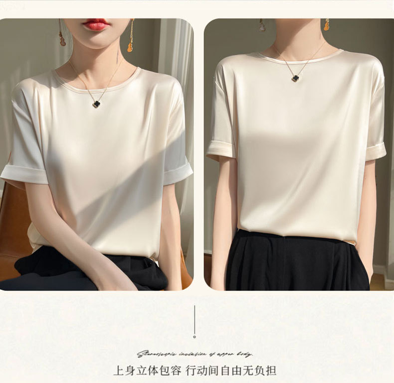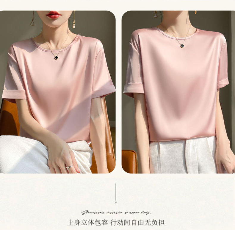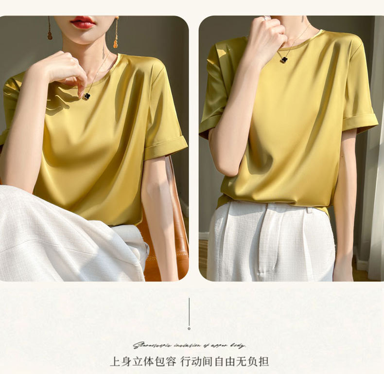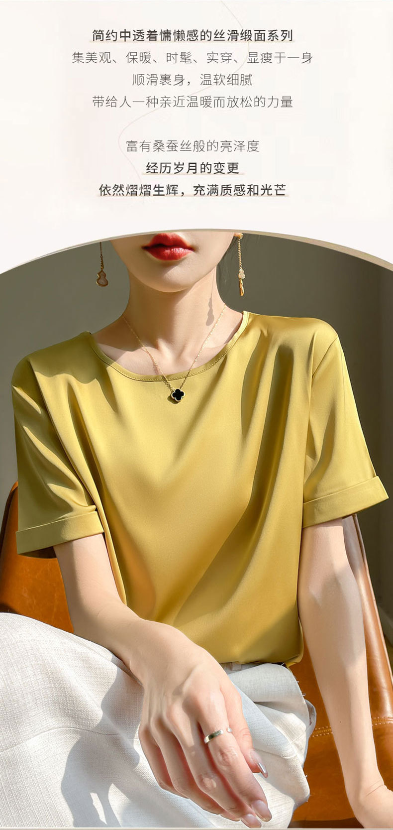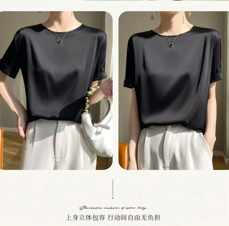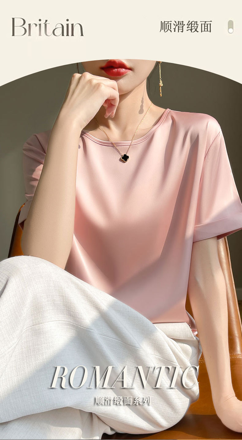 24 여름 새로운 새틴 모조 실크 반팔 여성용 느슨한 대형 V 넥 티셔츠 심플 스타일 아우터웨어 풀오버베이스 셔츠스토어 가기