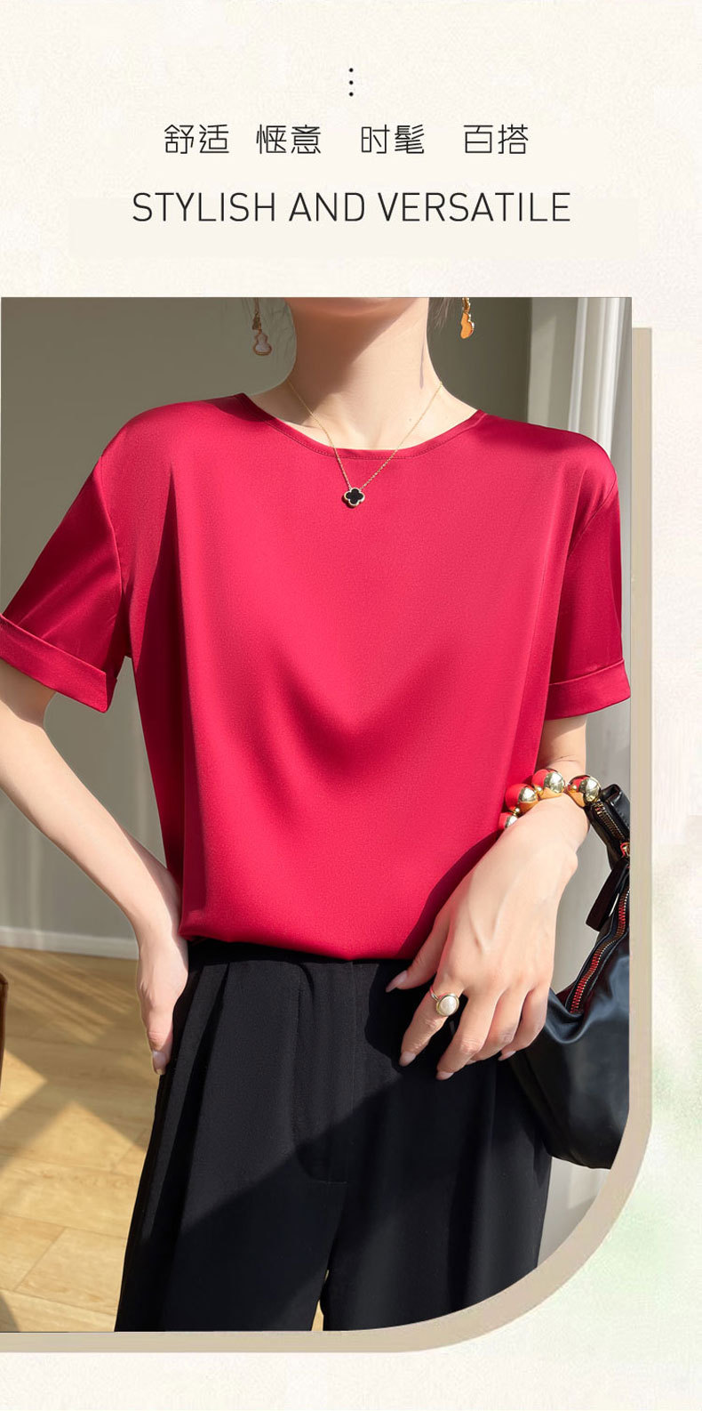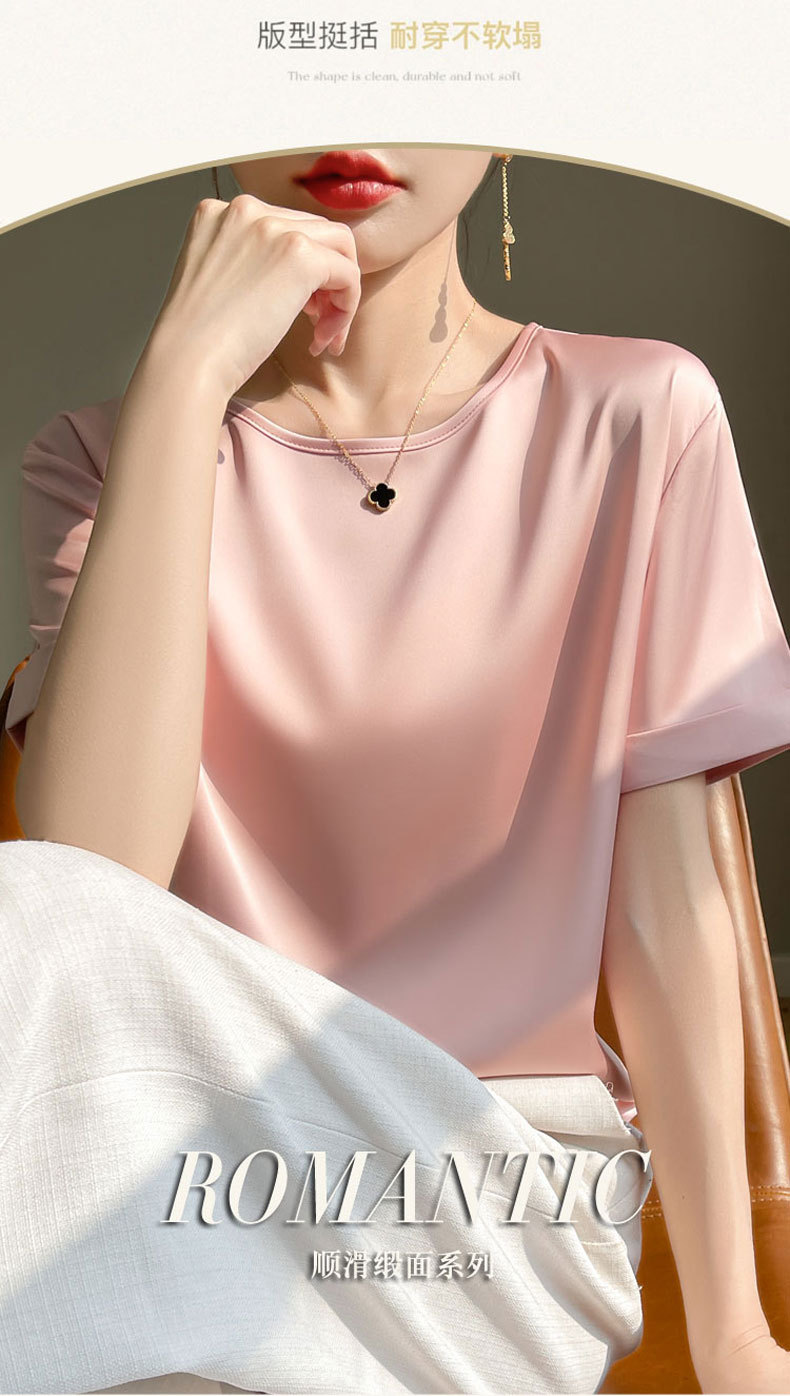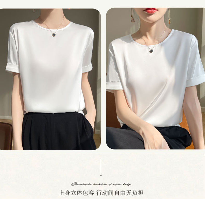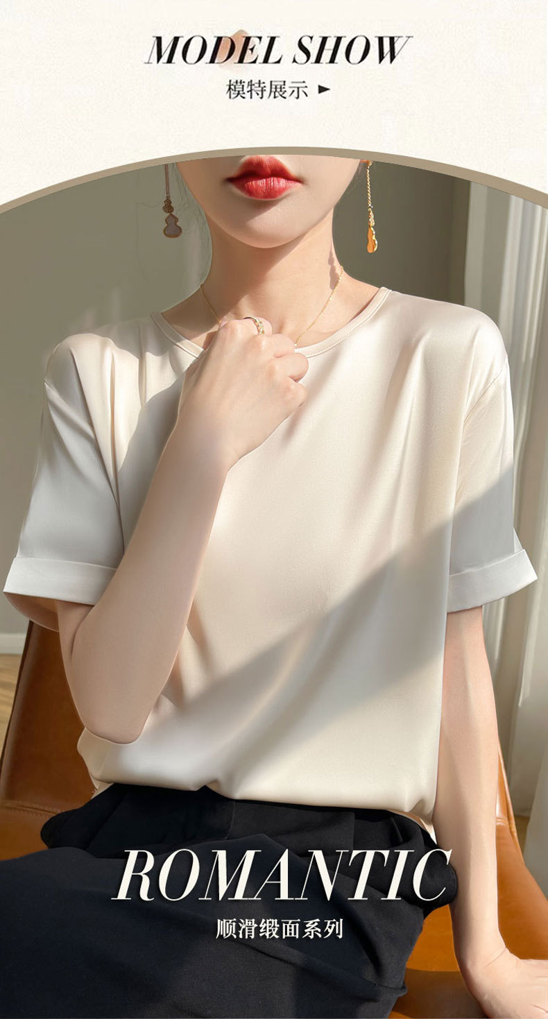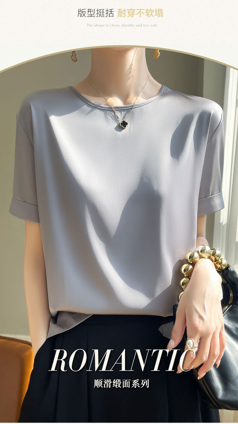 24 여름 새로운 새틴 모조 실크 반팔 여성용 느슨한 대형 V 넥 티셔츠 심플 스타일 아우터웨어 풀오버베이스 셔츠스토어 가기