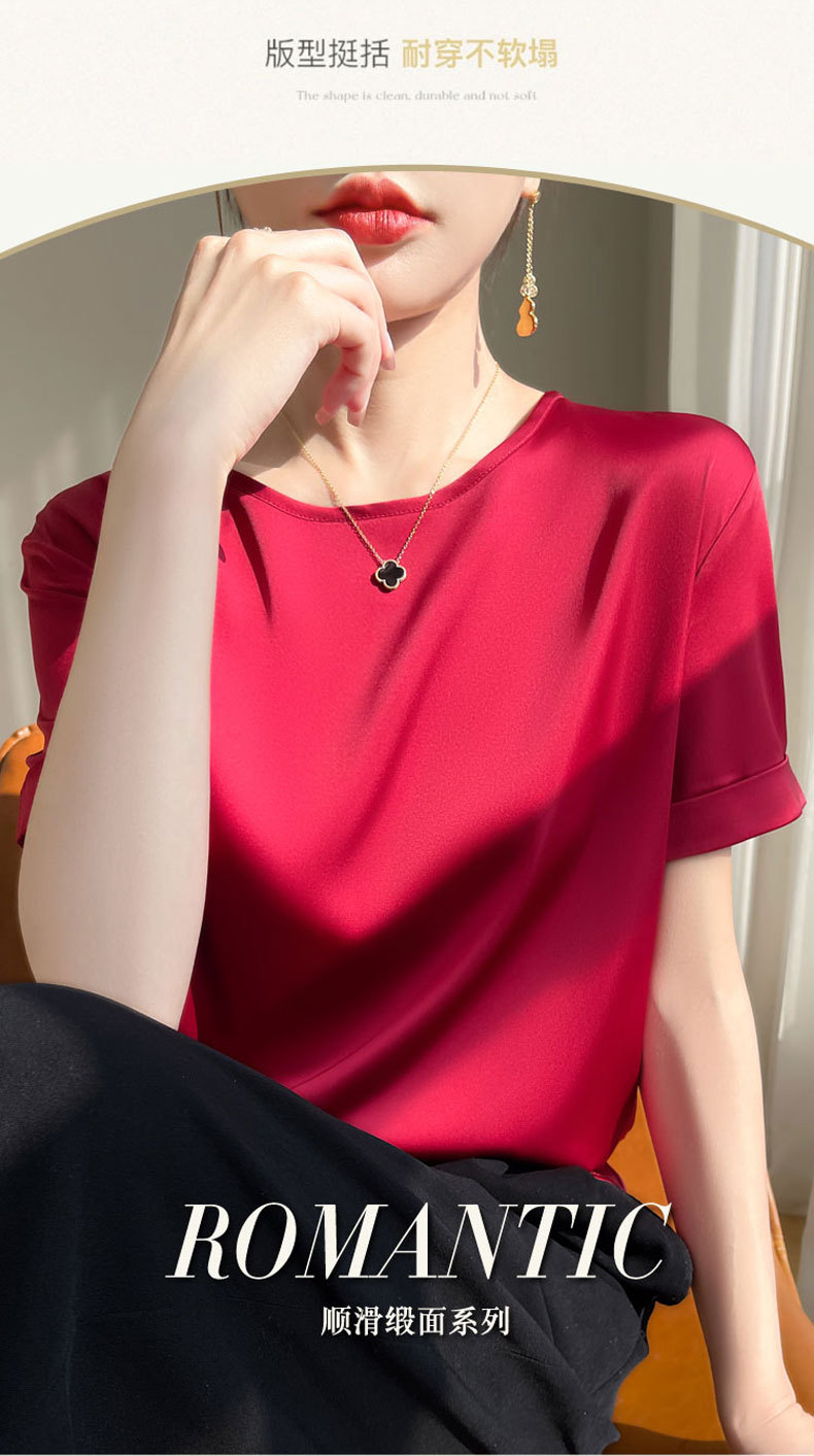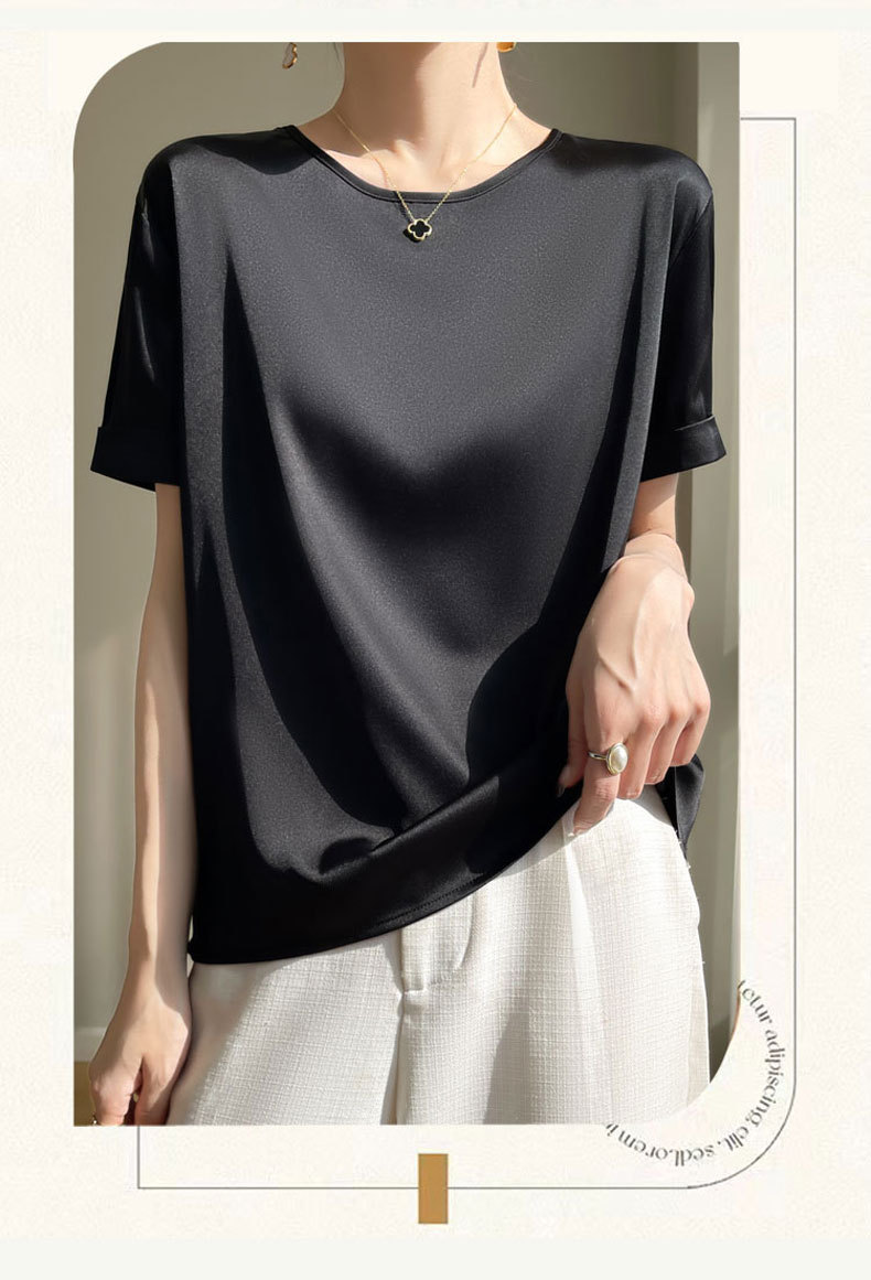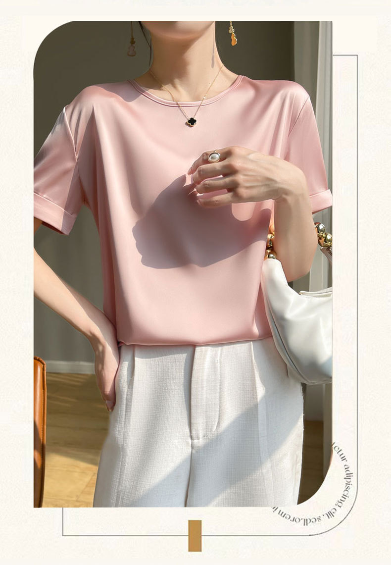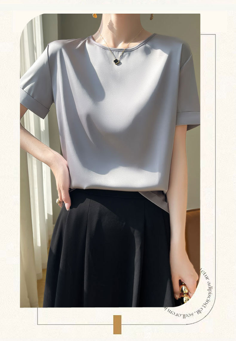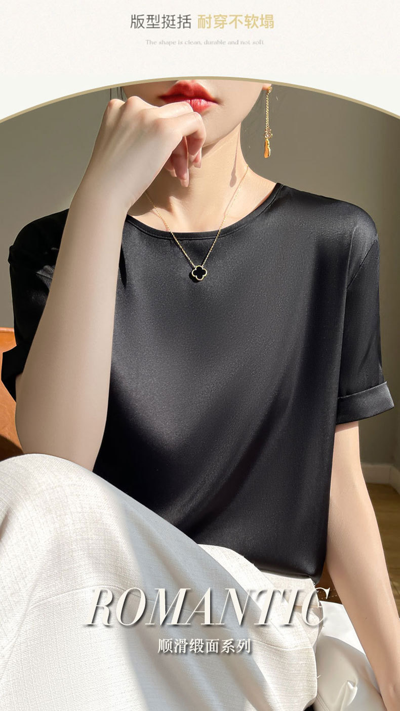 24 여름 새로운 새틴 모조 실크 반팔 여성용 느슨한 대형 V 넥 티셔츠 심플 스타일 아우터웨어 풀오버베이스 셔츠스토어 가기