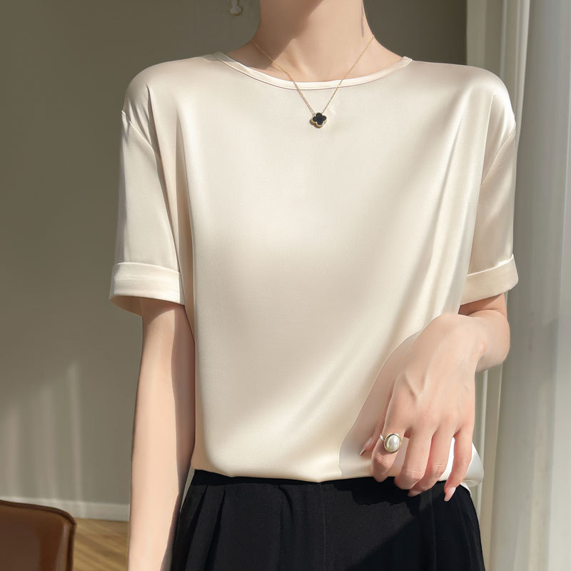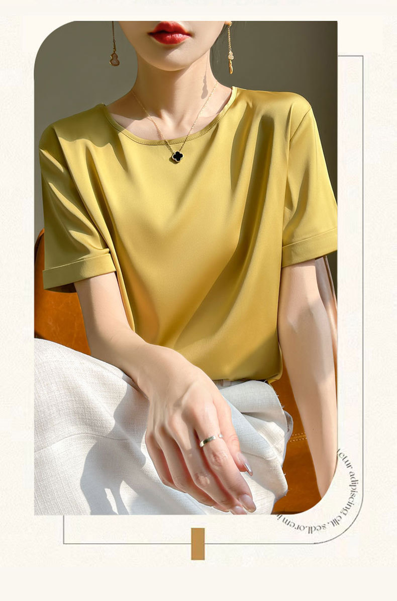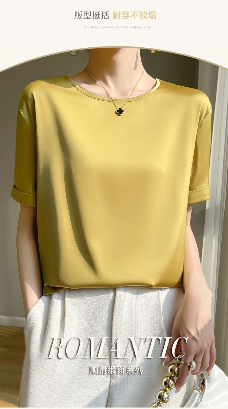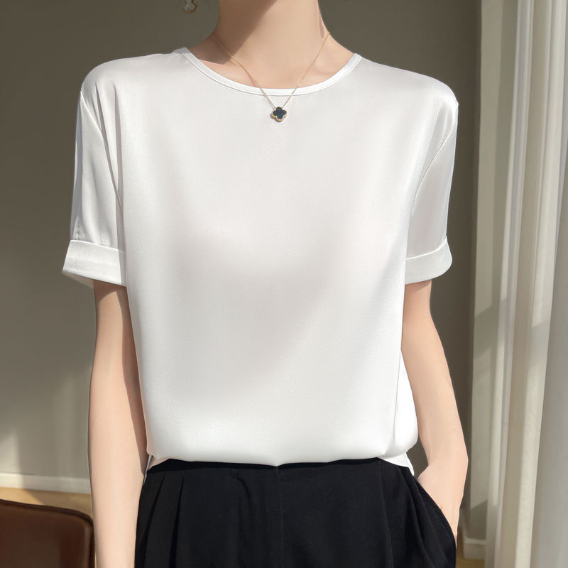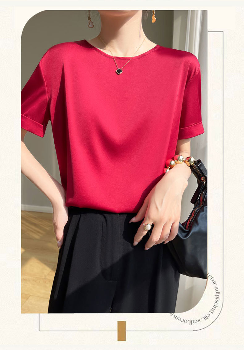 24 여름 새로운 새틴 모조 실크 반팔 여성용 느슨한 대형 V 넥 티셔츠 심플 스타일 아우터웨어 풀오버베이스 셔츠스토어 가기