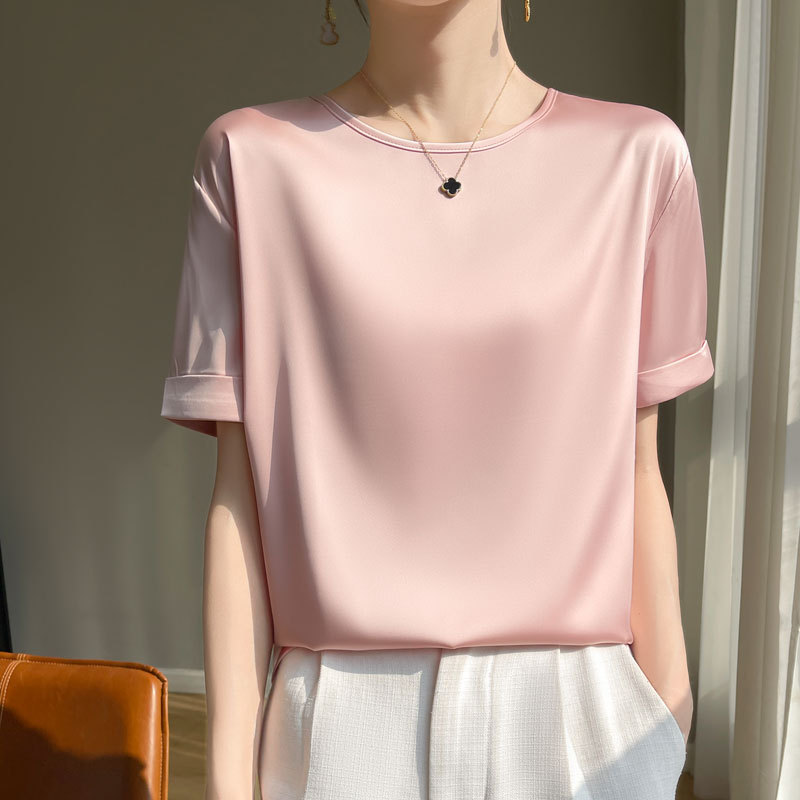 24 여름 새로운 새틴 모조 실크 반팔 여성용 느슨한 대형 V 넥 티셔츠 심플 스타일 아우터웨어 풀오버베이스 셔츠