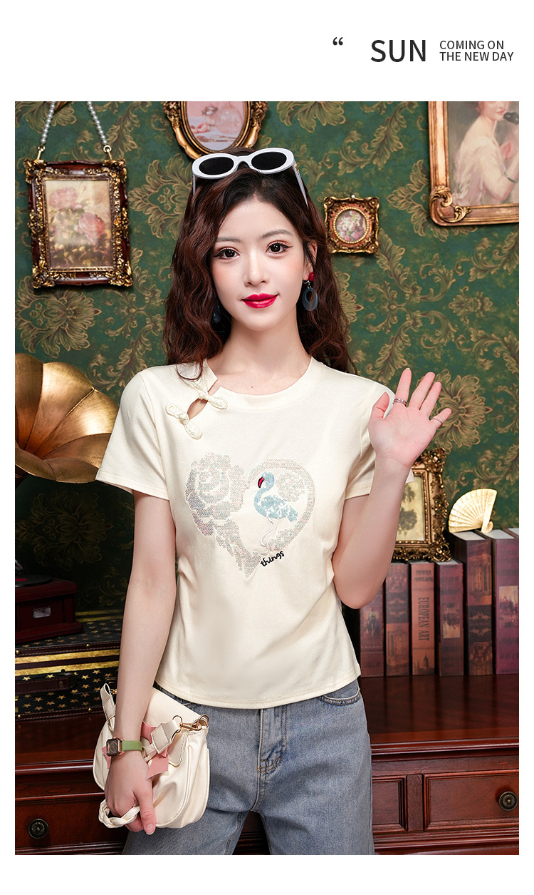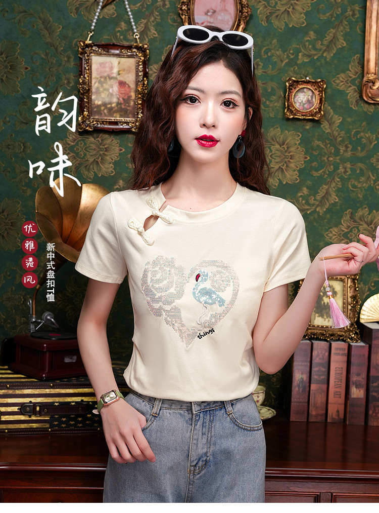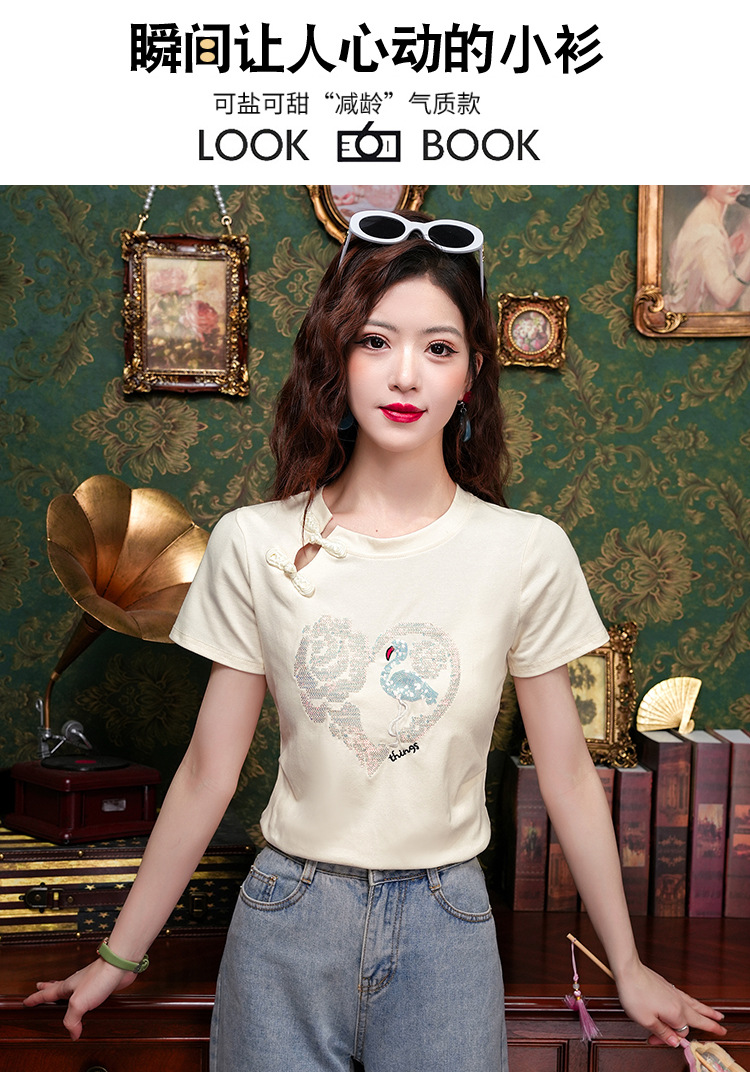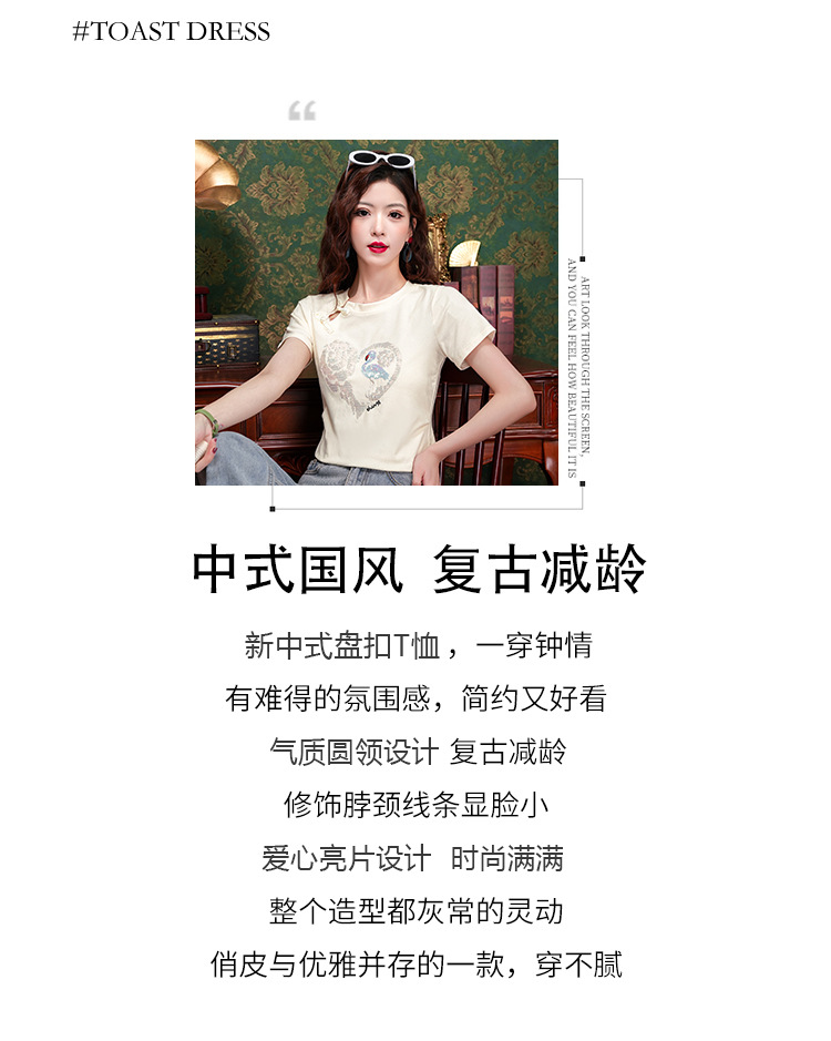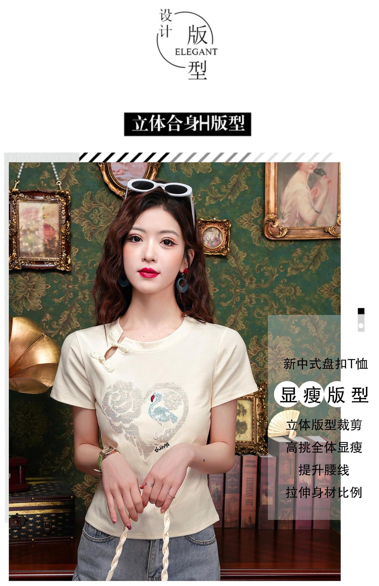 살구색 반팔 티셔츠 여자 둥근 목 2024 여름 불규칙한 어깨 주름 허리 슬리밍 빈티지 버클 탑스토어 가기