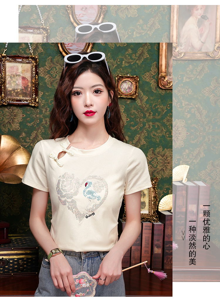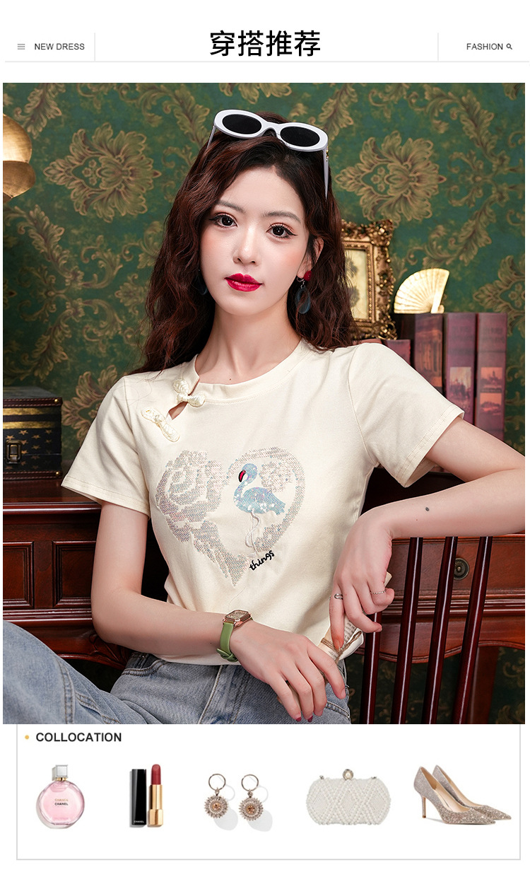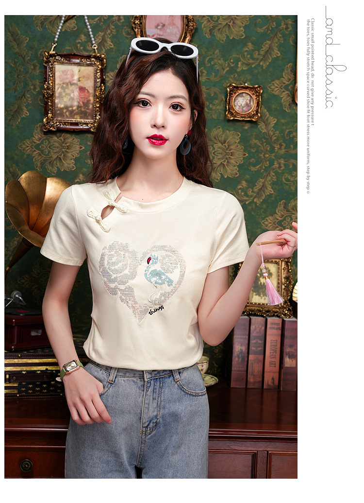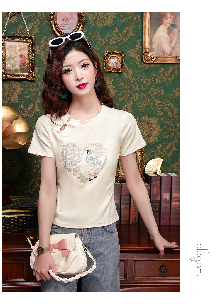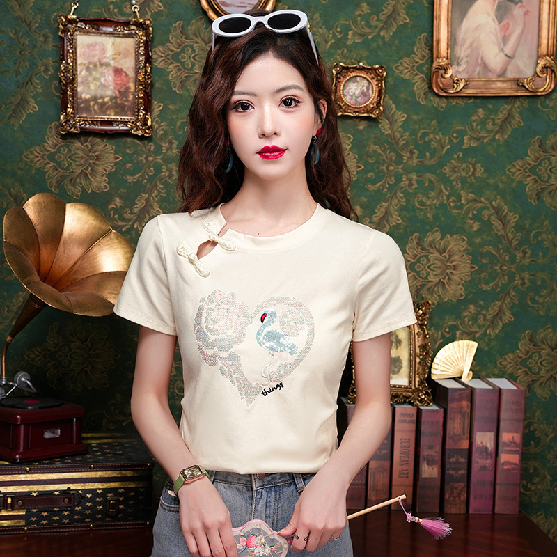 살구색 반팔 티셔츠 여자 둥근 목 2024 여름 불규칙한 어깨 주름 허리 슬리밍 빈티지 버클 탑스토어 가기