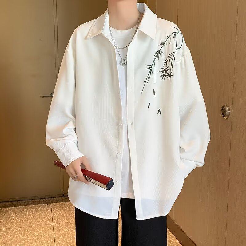 Guofeng 대나무 흰색 셔츠 남자의 긴 소매 봄과 가을 새로운 중국 스타일 레트로 트렌디 브랜드 십대 Plagianist 잘 생긴 셔츠 재킷