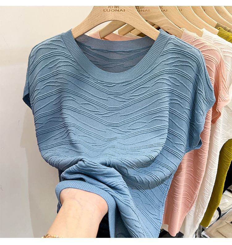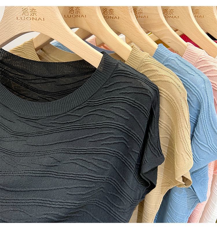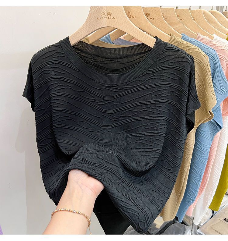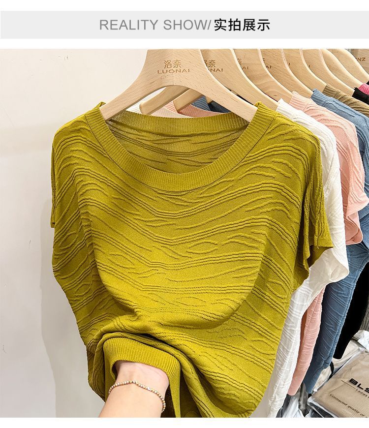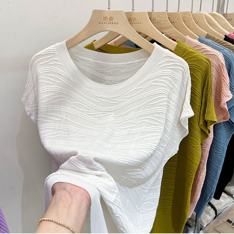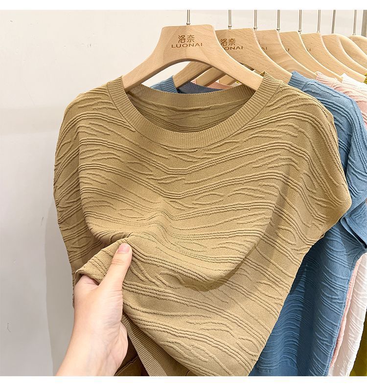 아이스 실크 니트 반팔 여자 여름 새로운 라운드 넥 텐셀 탑 니트 스웨터 루즈 올 매치 티셔츠