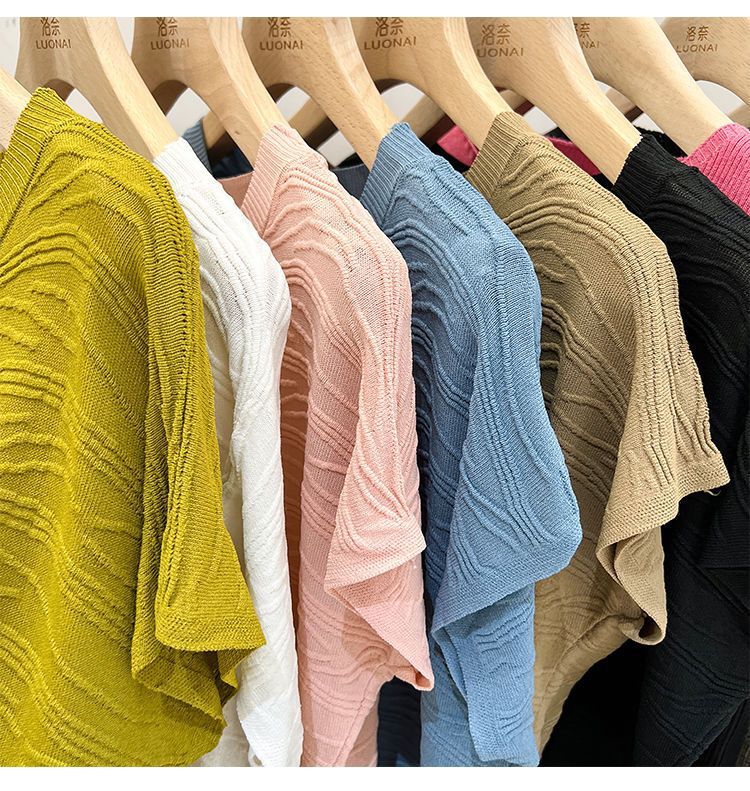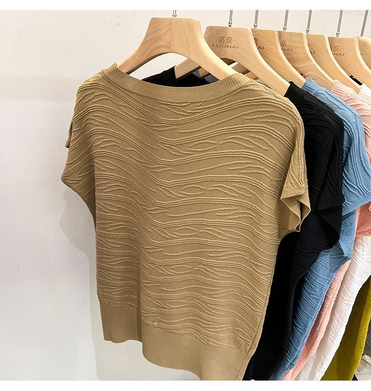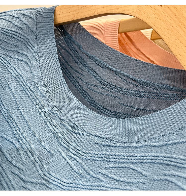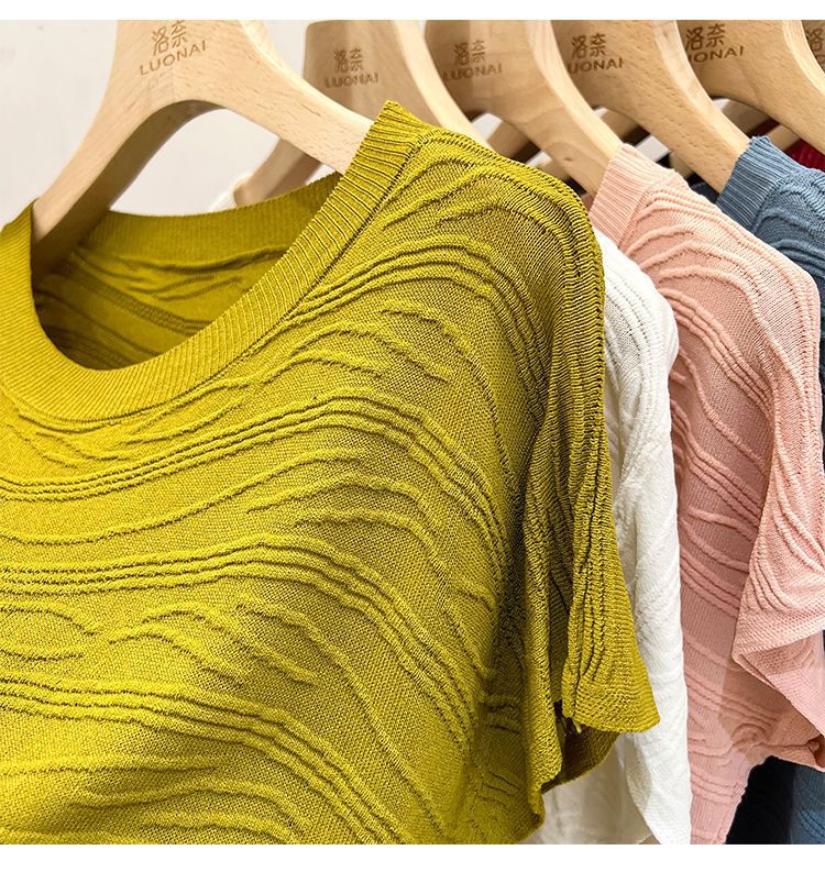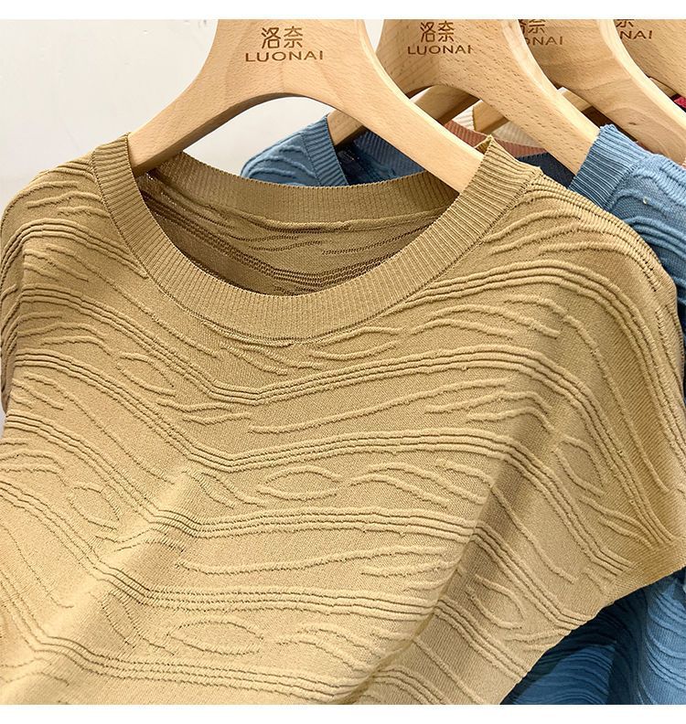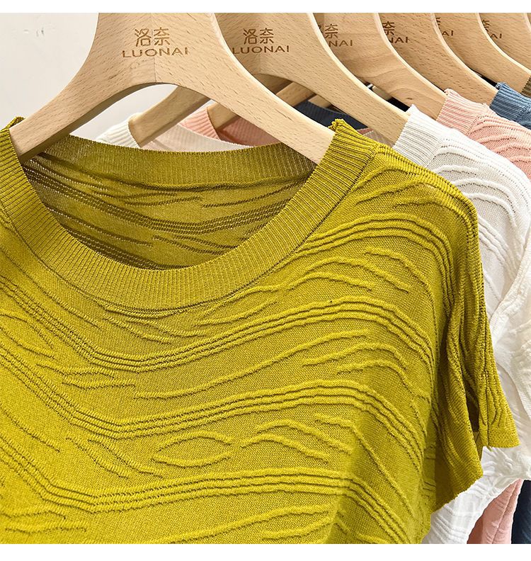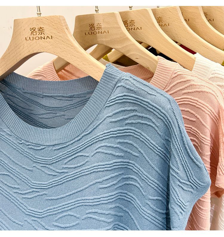 아이스 실크 니트 반팔 여자 여름 새로운 라운드 넥 텐셀 탑 니트 스웨터 루즈 올 매치 티셔츠