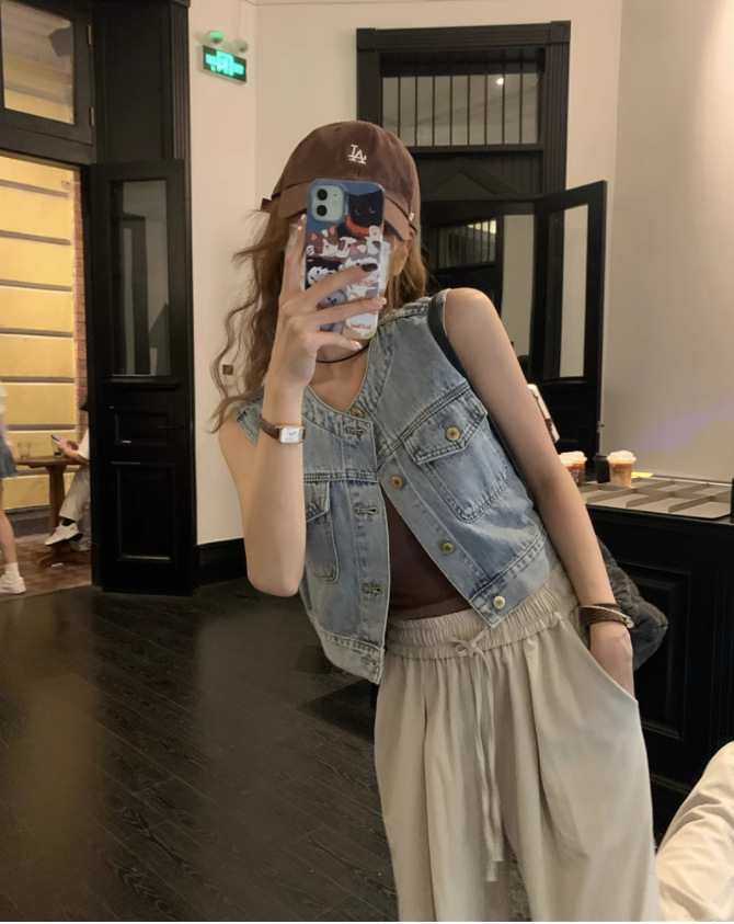 인터넷으로 유명한 데님 조끼 조끼 재킷 여성 2024 년 여름 새로운 민소매 아우터 쇼트탑 여성 웨이스트코트스토어 가기