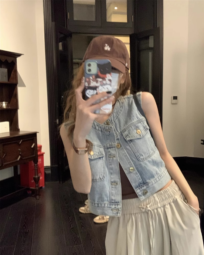 인터넷으로 유명한 데님 조끼 조끼 재킷 여성 2024 년 여름 새로운 민소매 아우터 쇼트탑 여성 웨이스트코트