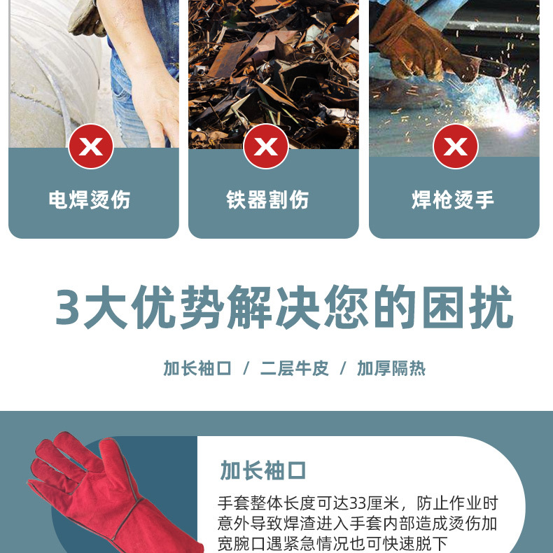 공장 도매 용접기 장갑 젖소 2 층 가죽 길쭉한 두꺼운 단열재 내마모성 노동 보호 용접 장갑스토어 가기