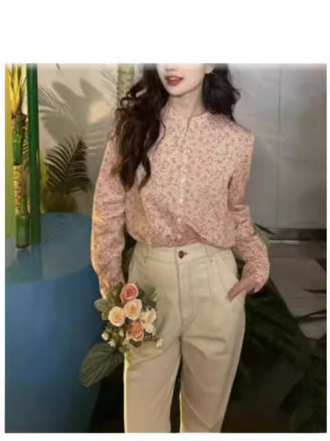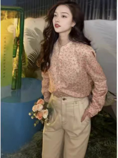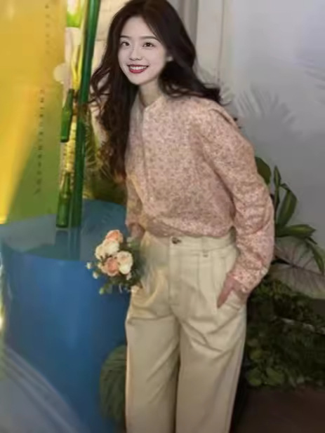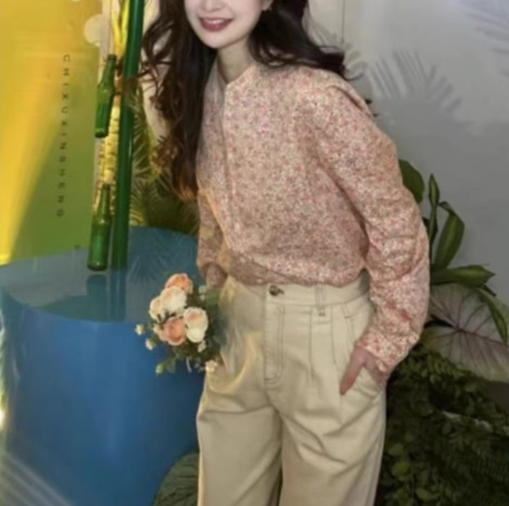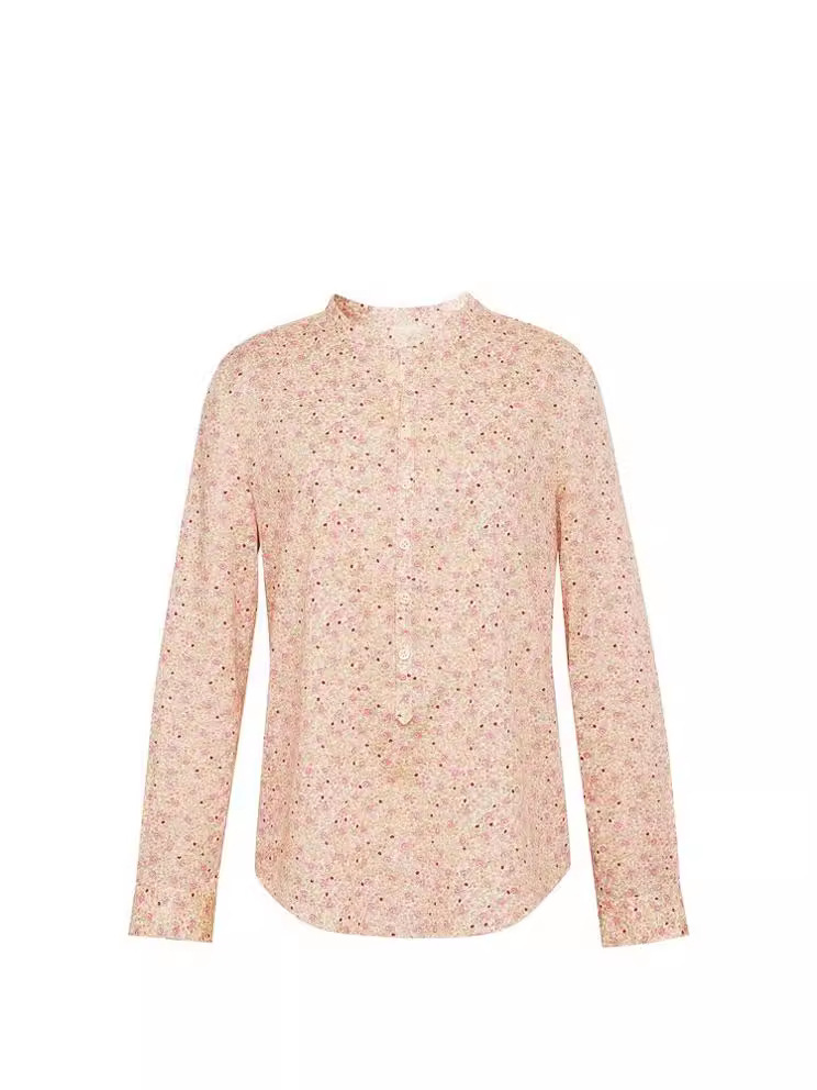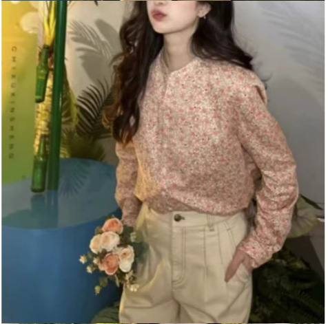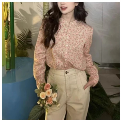 형제의 새로운 여성 2024 년 여름 핑크 새로운 중국 스타일 칼라 작은 꽃 면화 하프 라켓 긴 소매 셔츠