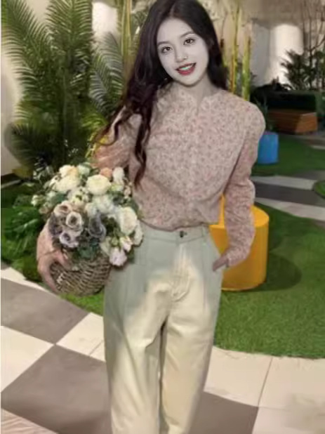 형제의 새로운 여성 2024 년 여름 핑크 새로운 중국 스타일 칼라 작은 꽃 면화 하프 라켓 긴 소매 셔츠스토어 가기