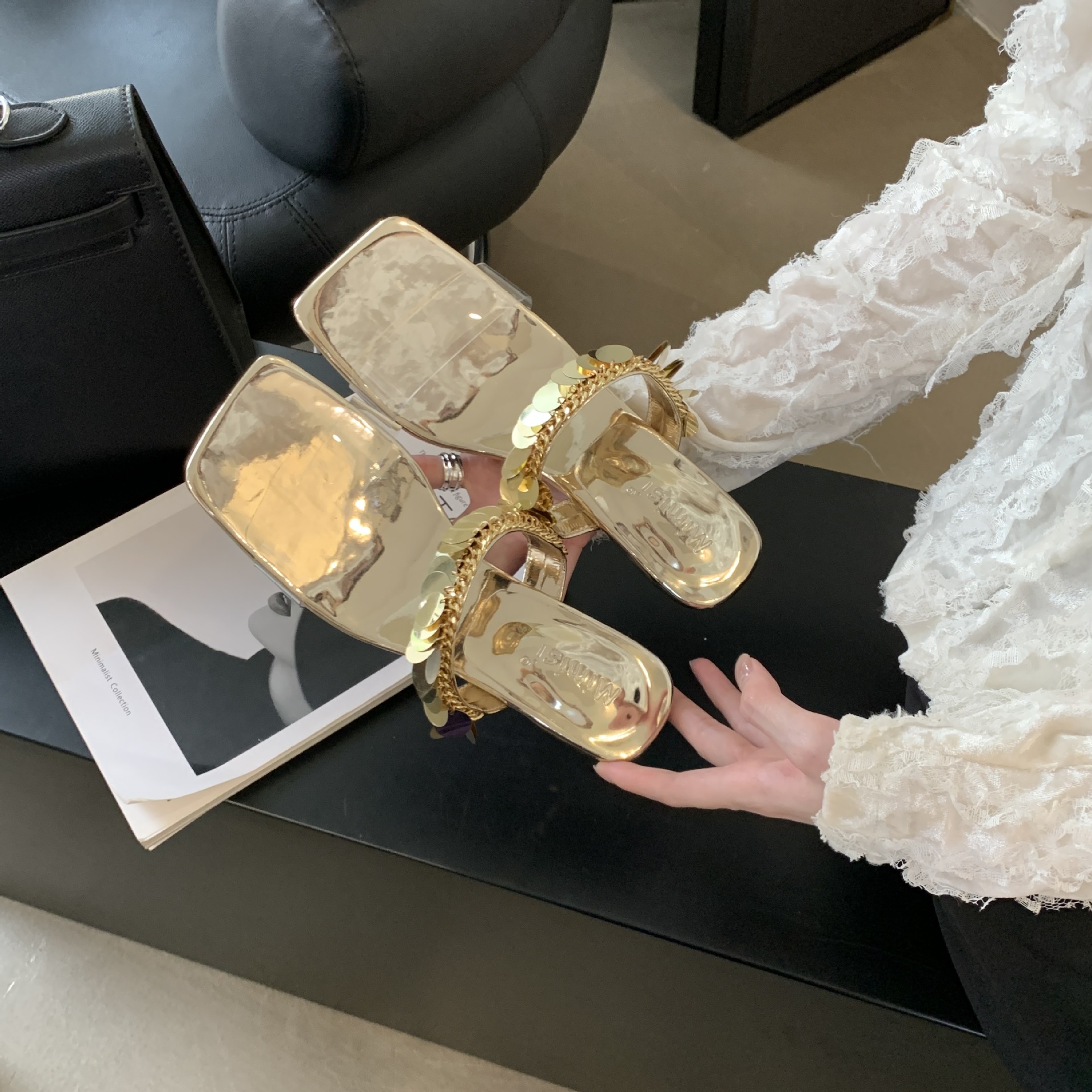 2024 새로운 스타일 스퀘어 토 여성용 여성용 샌들, 주름 세트 발가락 투명 얇은 뒤꿈치 외부 착용 반 드래그