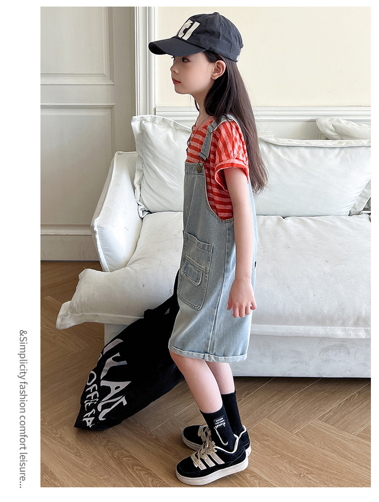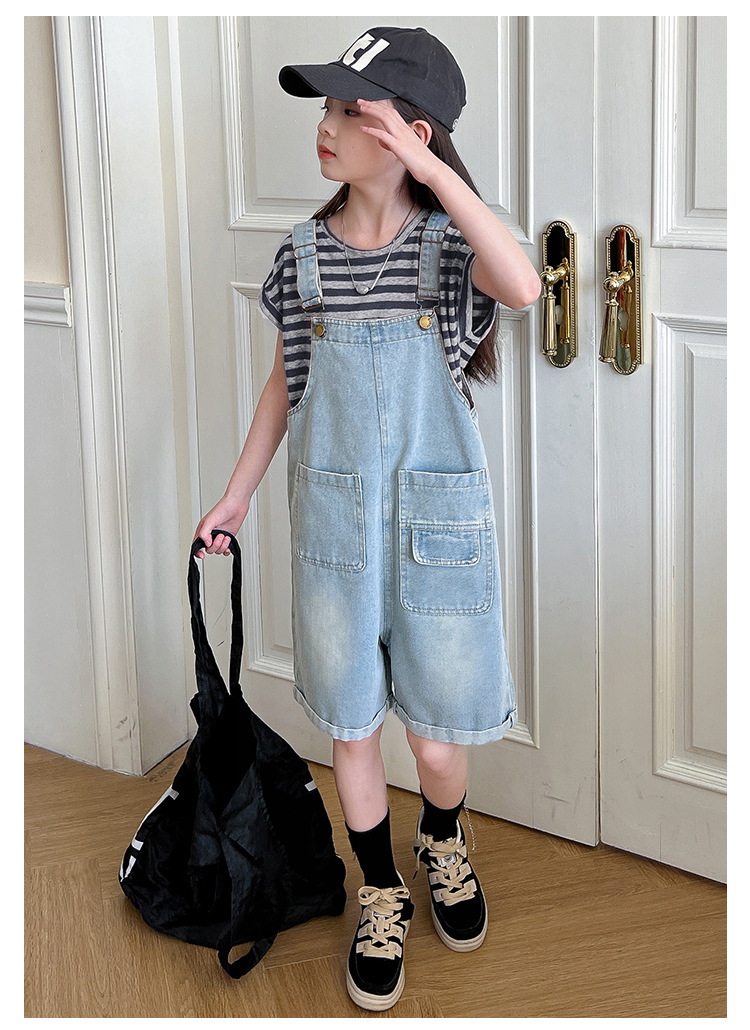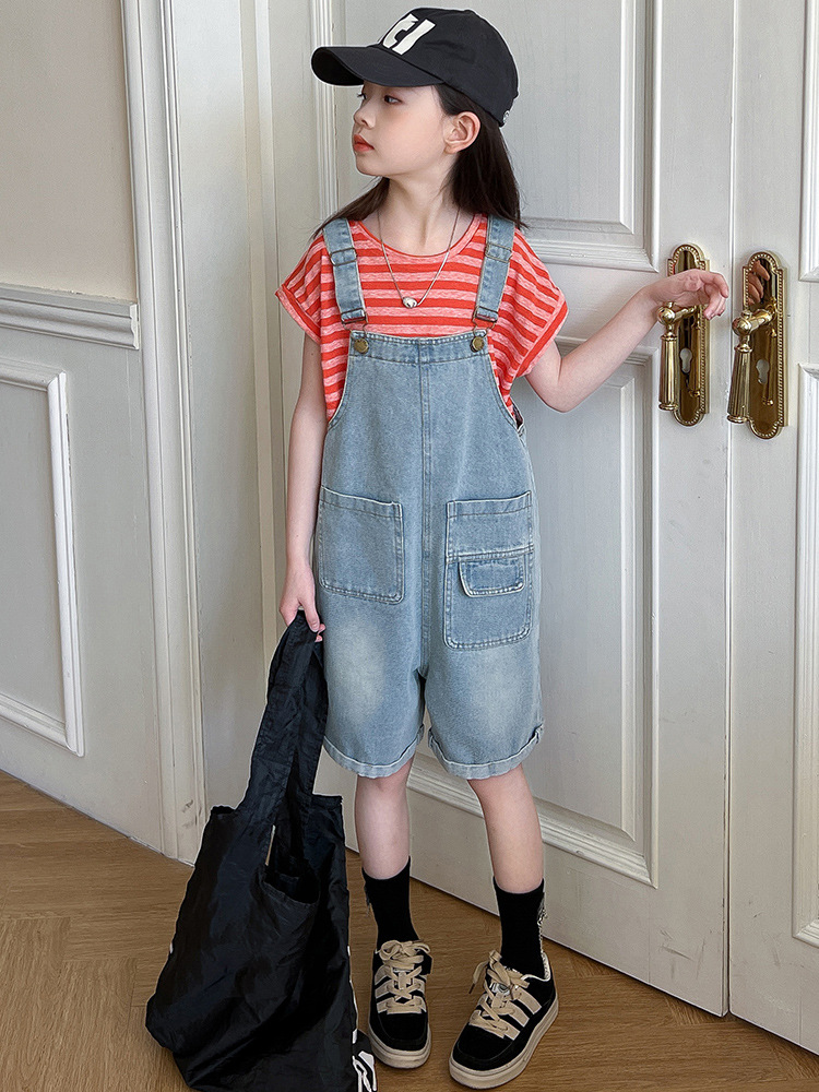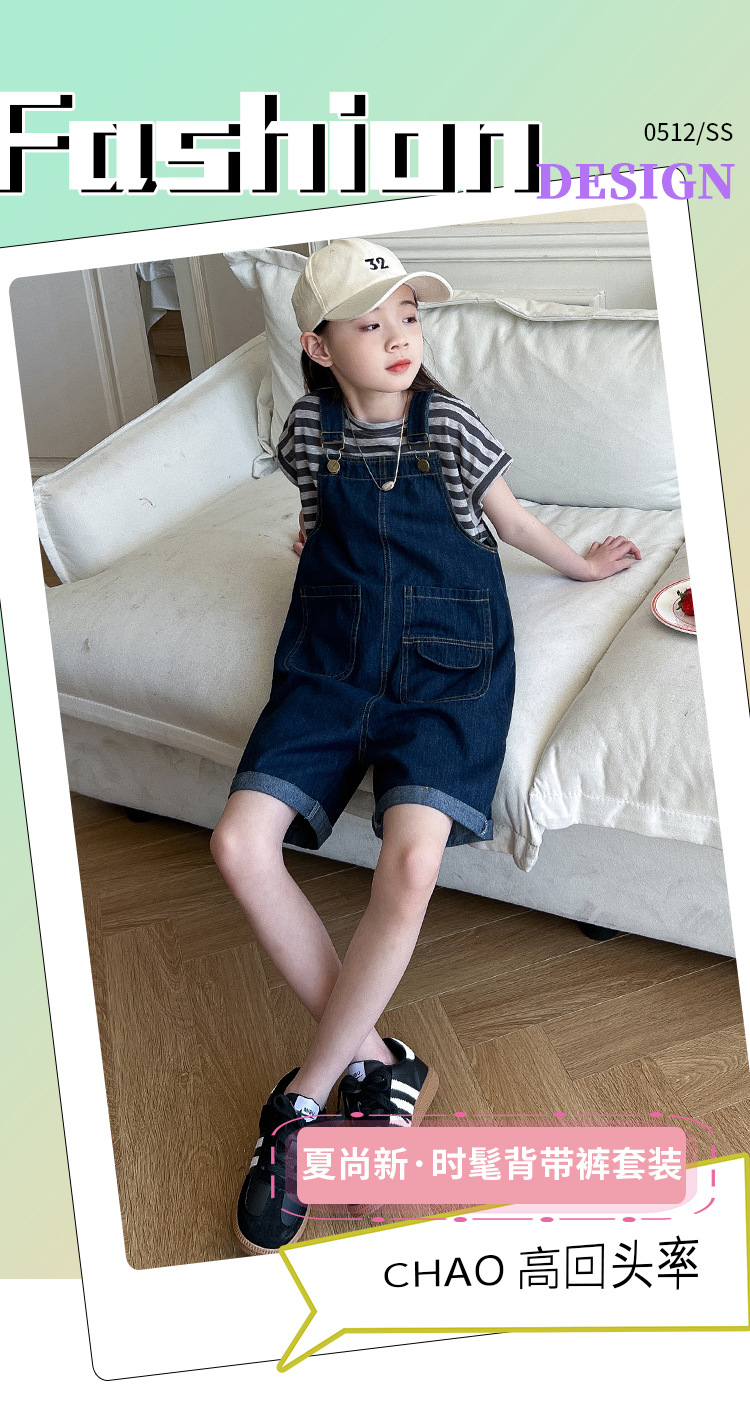 소녀 여름 스트랩 바지 세트 24 새로운 큰 어린이 패셔너블 서양식 한국 줄무늬 반팔 청바지 투피스 세트스토어 가기
