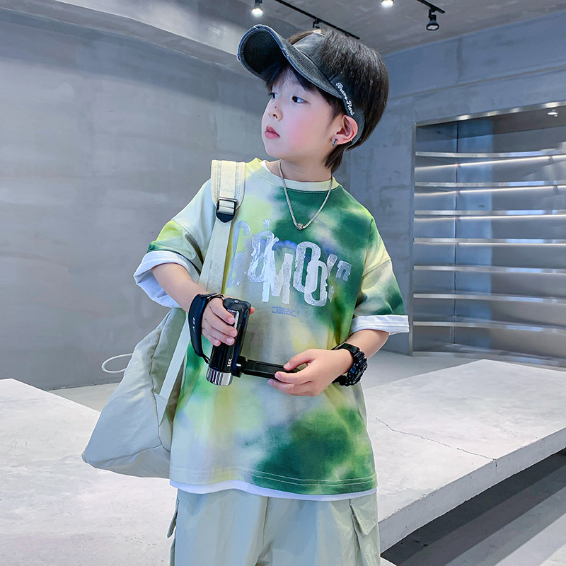 소년 여름 타이 염색 얼음 실크 반팔 티셔츠 2025 새로운 어린이 소년 여름 옷 잘 생긴 느슨한 탑 유행