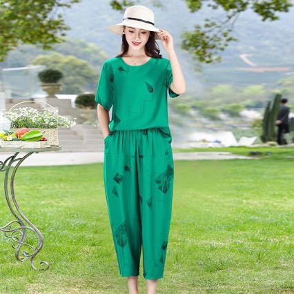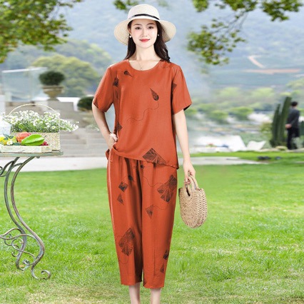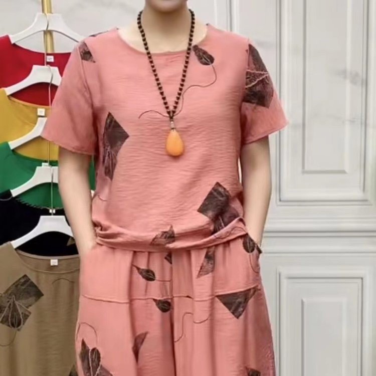 TikTok 패션 캐주얼 세트 여성 2024 년 여름 새 어머니의 반팔 티셔츠 카프리 캐주얼 바지