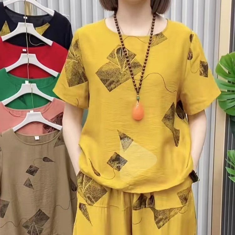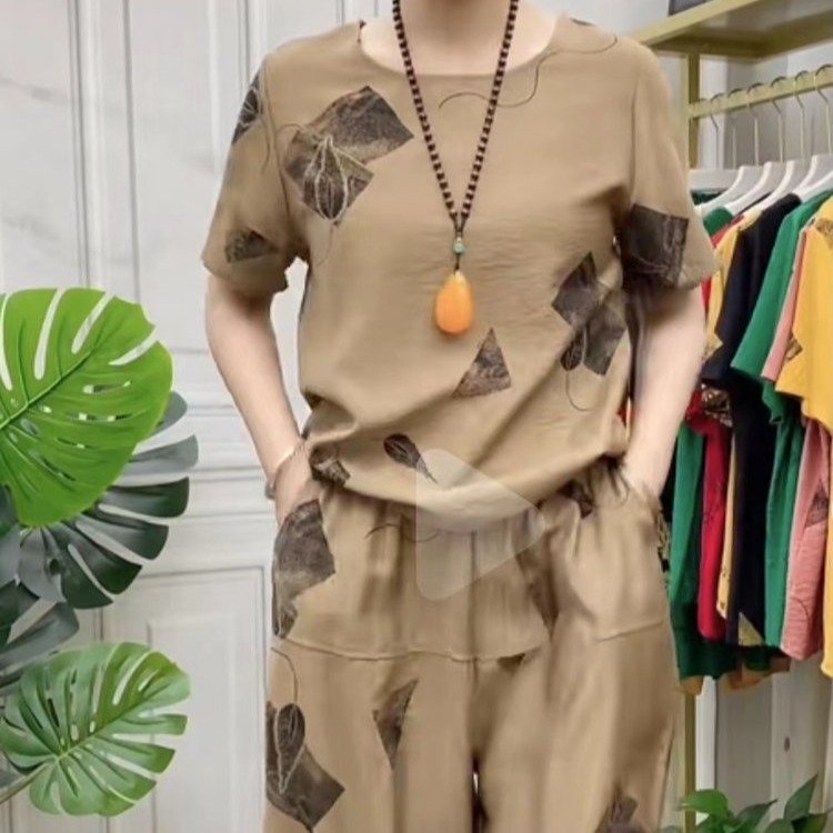 TikTok 패션 캐주얼 세트 여성 2024 년 여름 새 어머니의 반팔 티셔츠 카프리 캐주얼 바지스토어 가기
