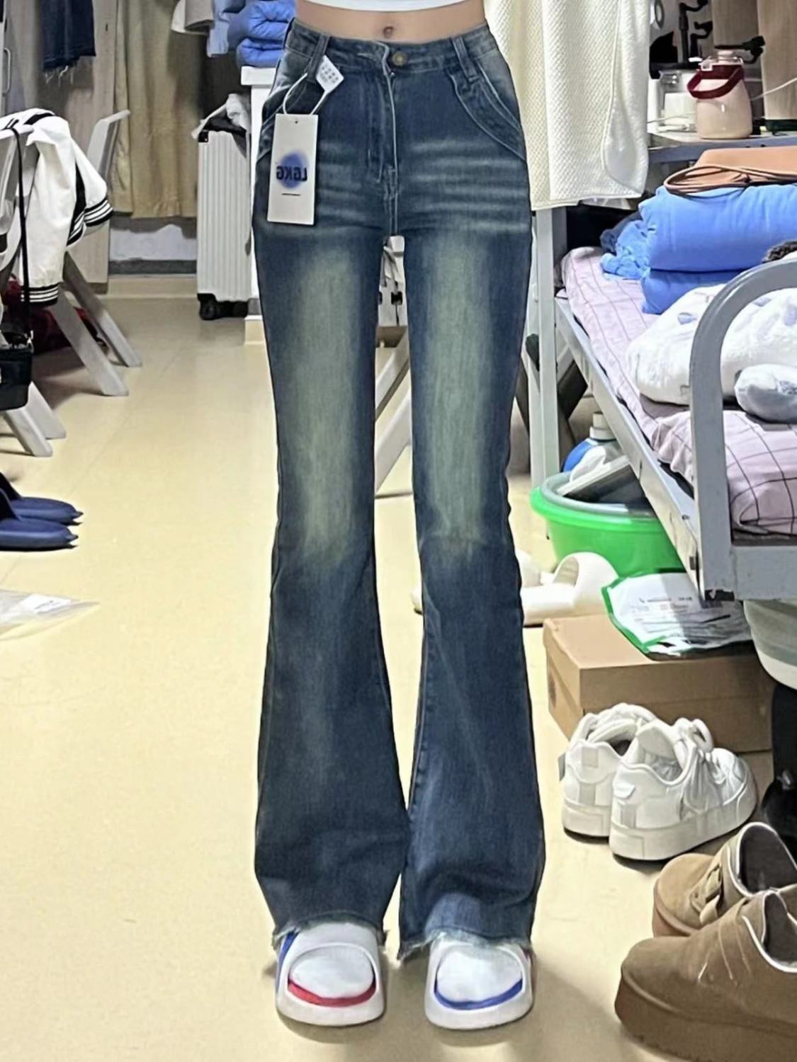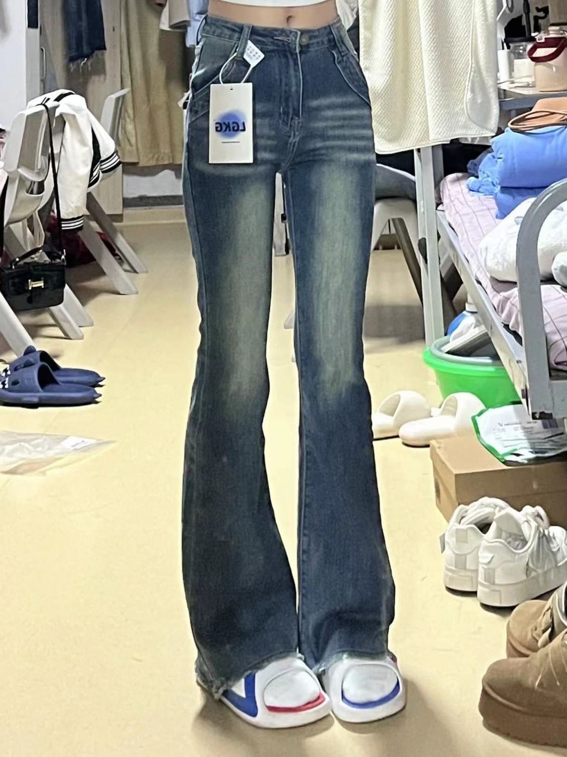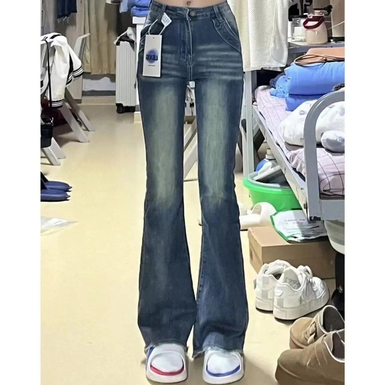 아메리칸 스타일 레트로 고민 하이 스트리트 마이크로 플레어 청바지 여성의 2024 년 여름 새로운 틈새 디자인 올 매치 바지스토어 가기