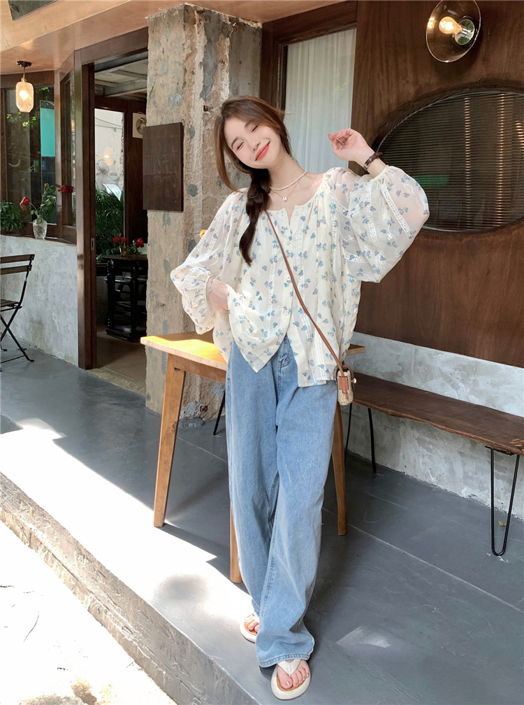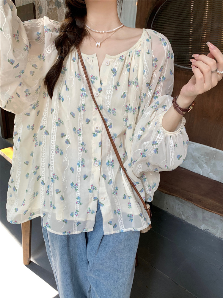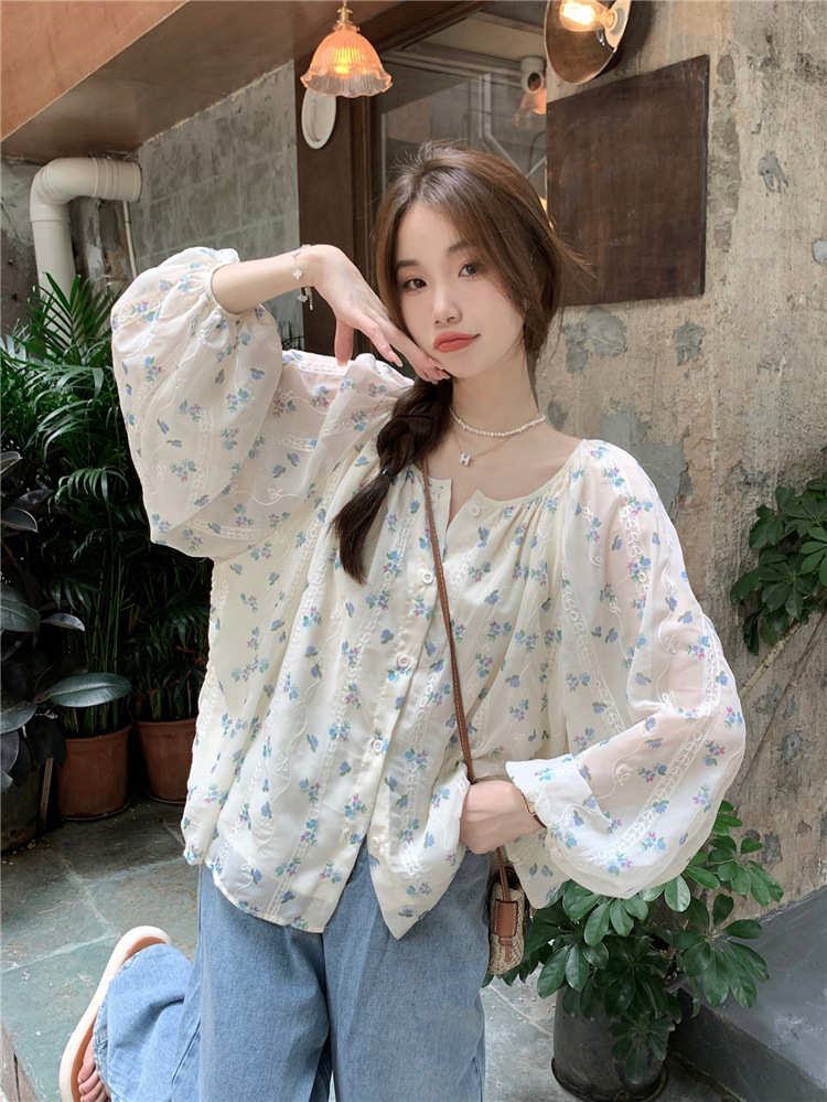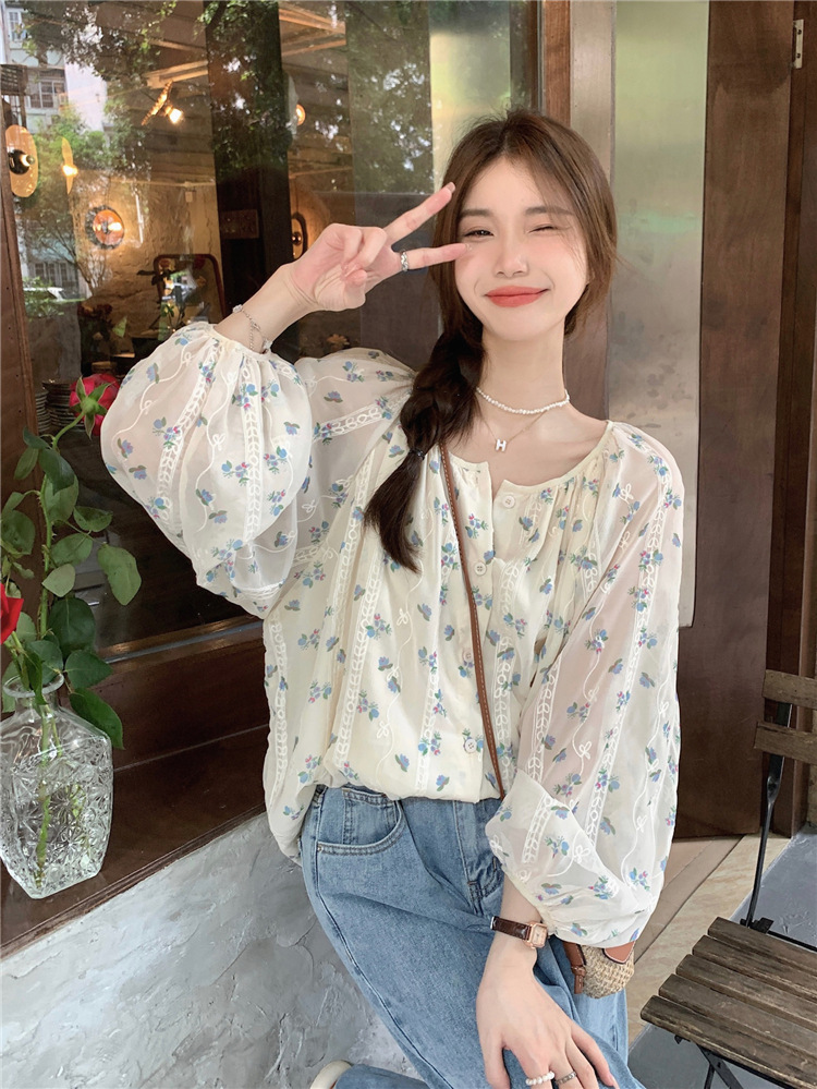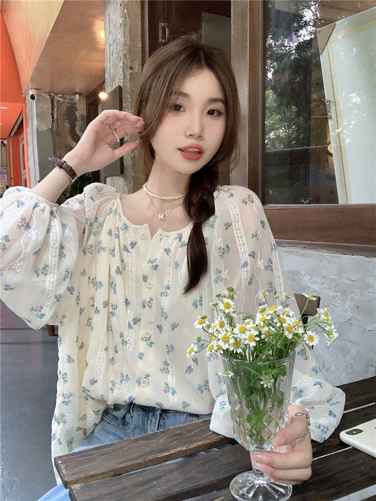 진짜 샷 작은 신선한 꽃 긴 소매 셔츠 느슨한 슬리밍 둥근 목 달콤한 여자 올 매치 쉬폰 셔츠스토어 가기