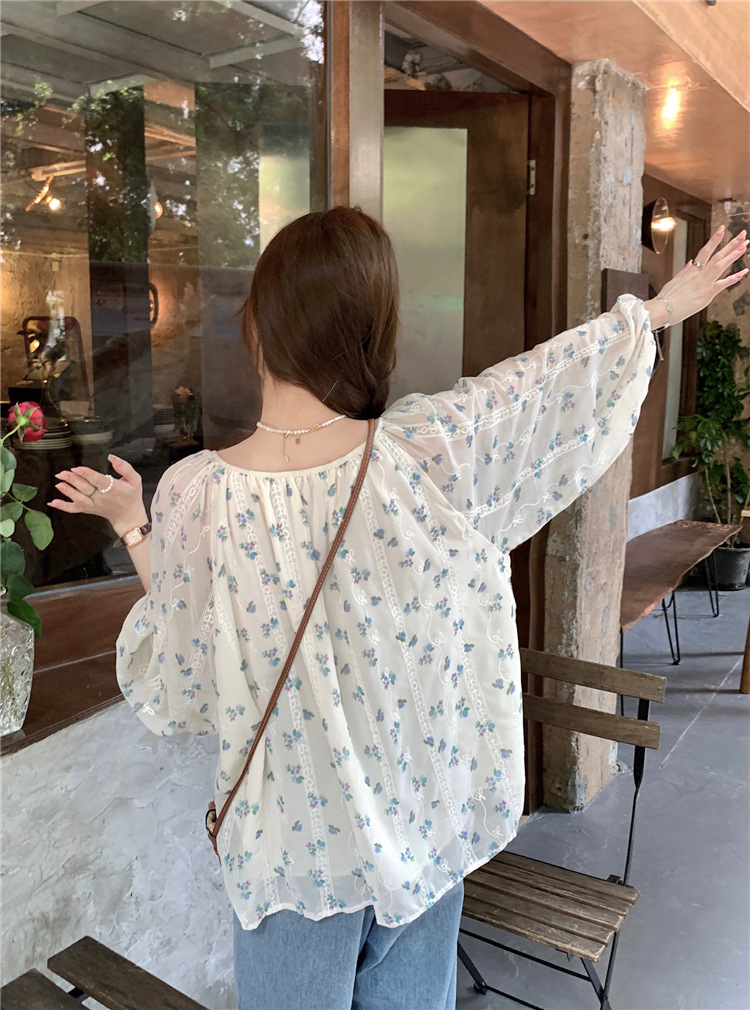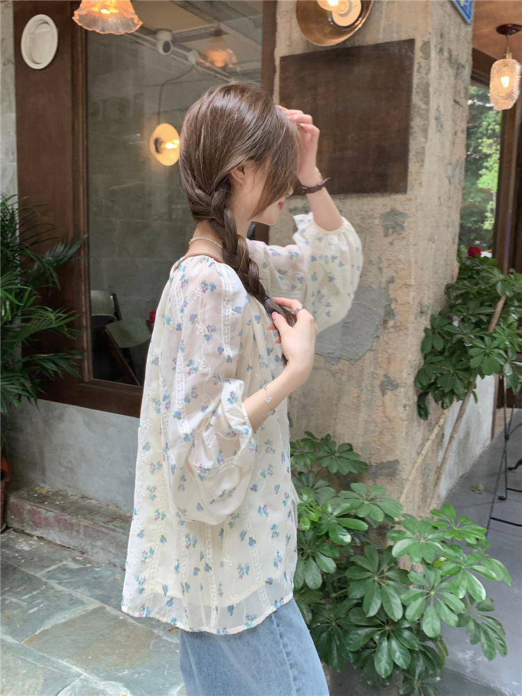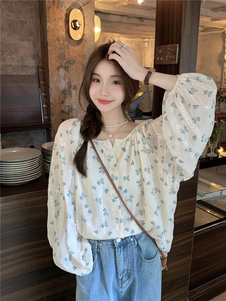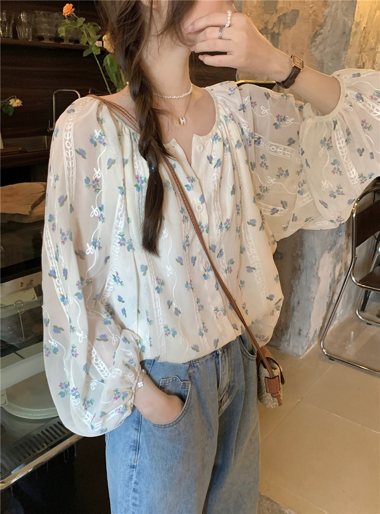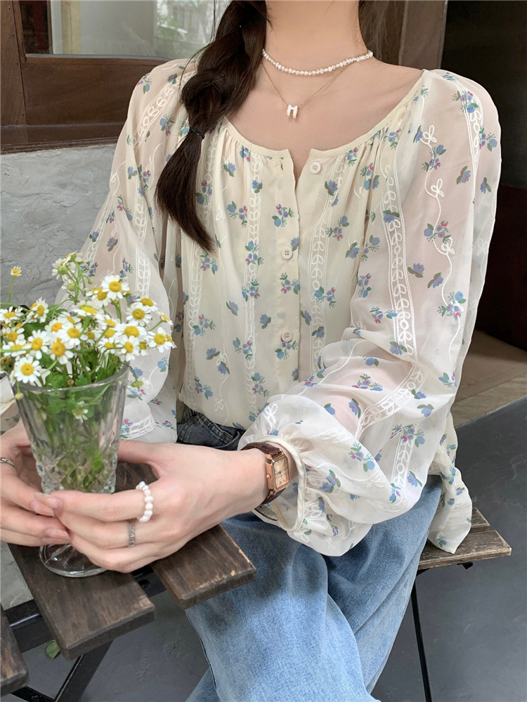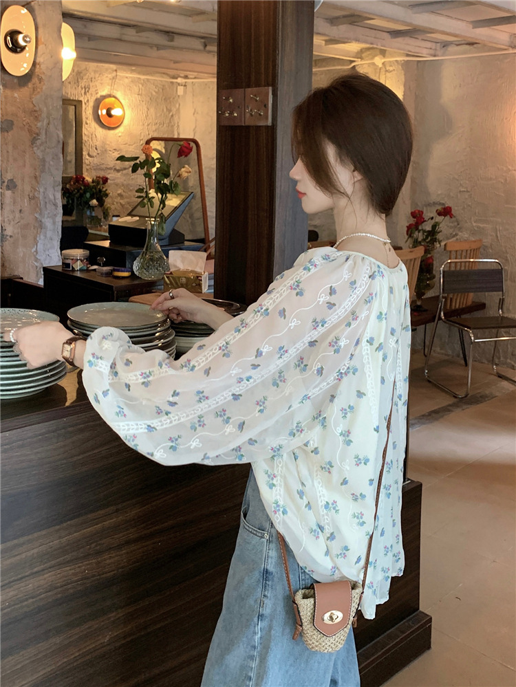 진짜 샷 작은 신선한 꽃 긴 소매 셔츠 느슨한 슬리밍 둥근 목 달콤한 여자 올 매치 쉬폰 셔츠