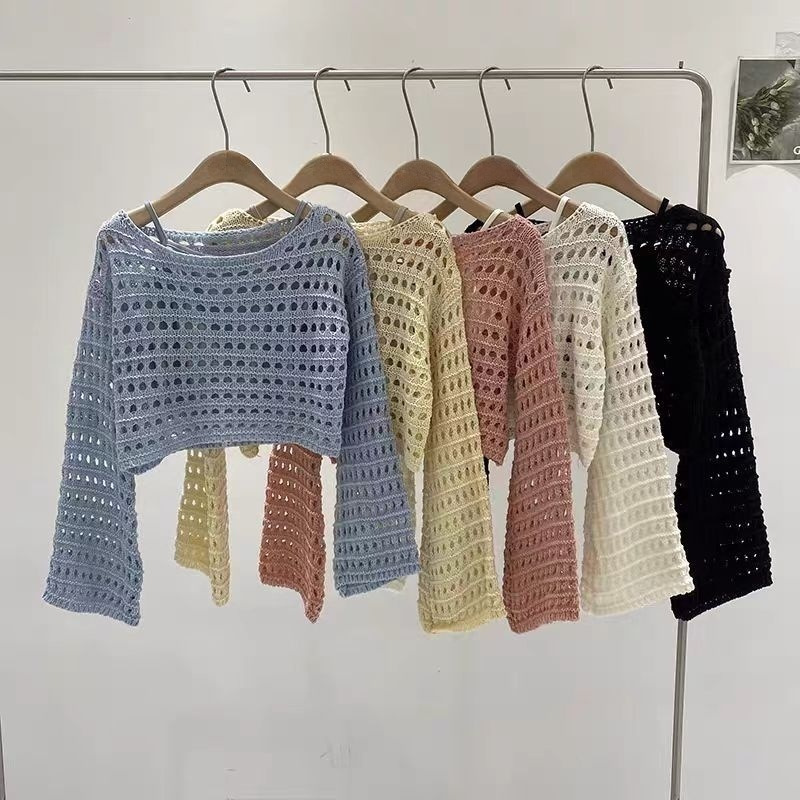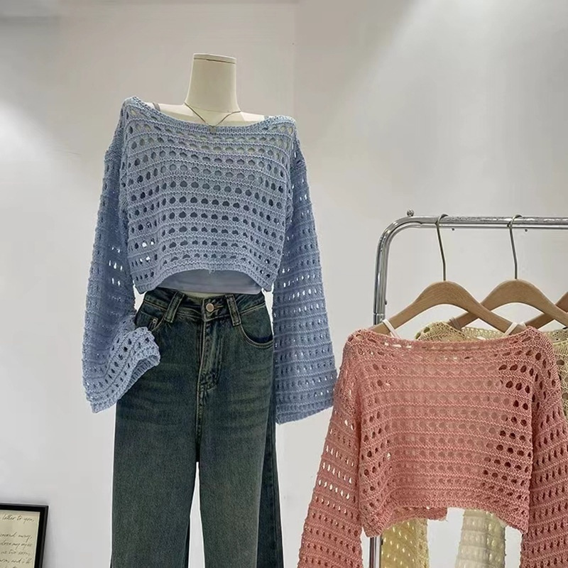 2025 봄과 여름 새로운 프랑스어 짧은 긴팔 중공 스웨터 여성 디자인 얇은 태양 보호 블라우스 탑스토어 가기