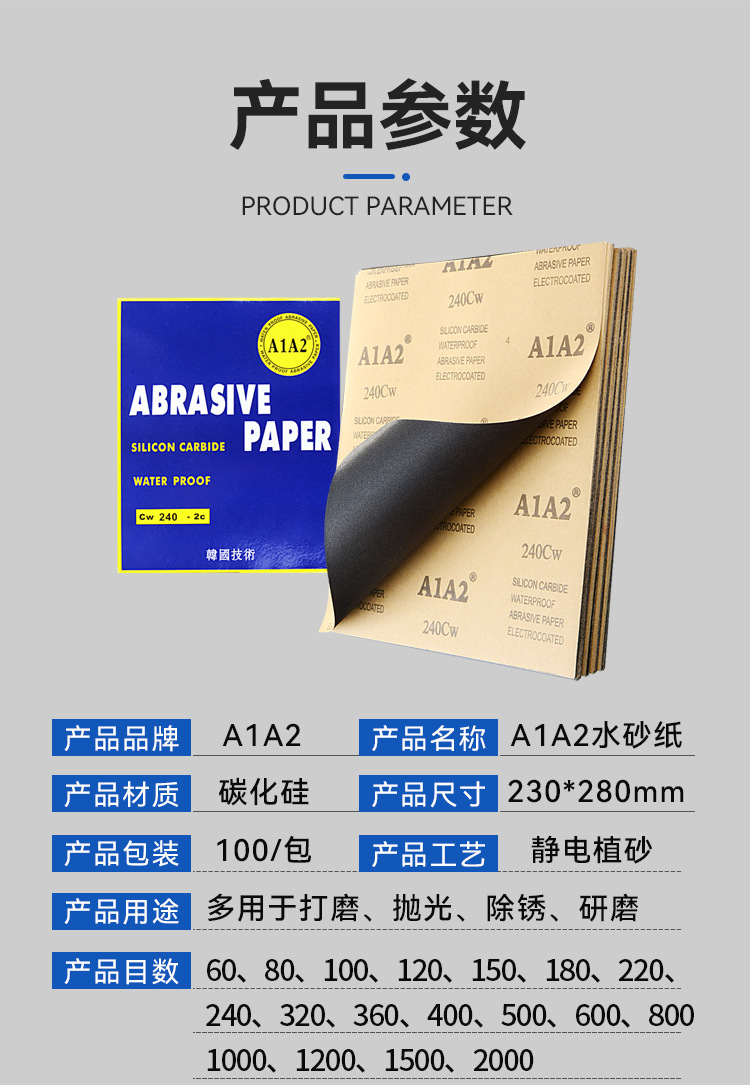 A1A2 물 사포를 사용자 정의 할 수 있습니다 연마 된 사각형 건조 및 습식 이중 사용 60 # ~ 2000 검은 모래 공장 도매스토어 가기