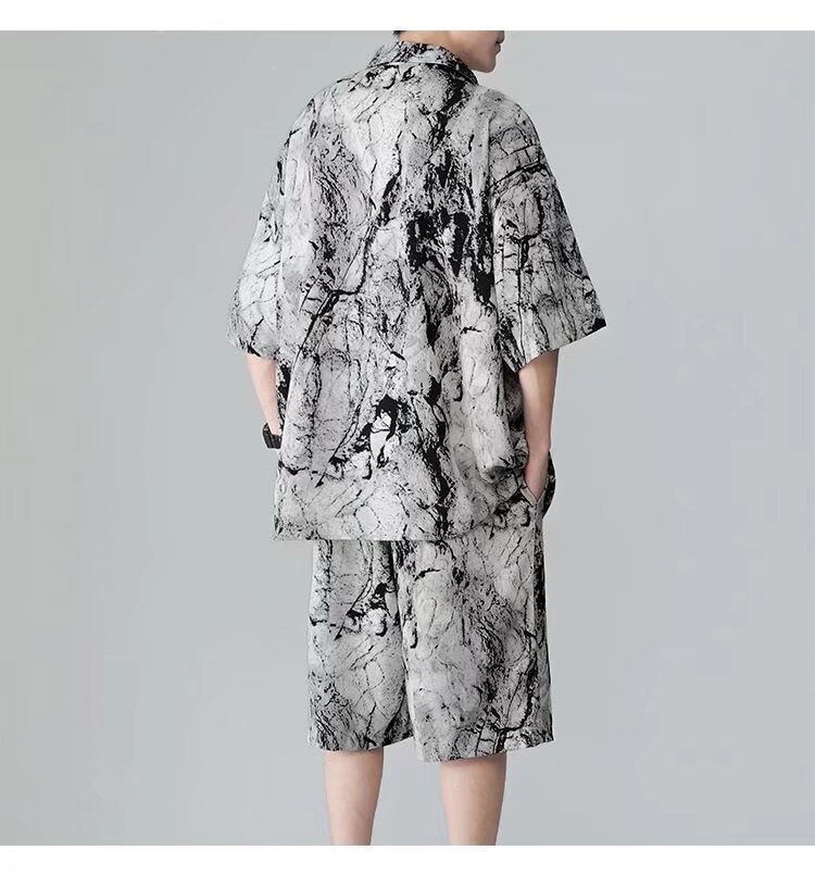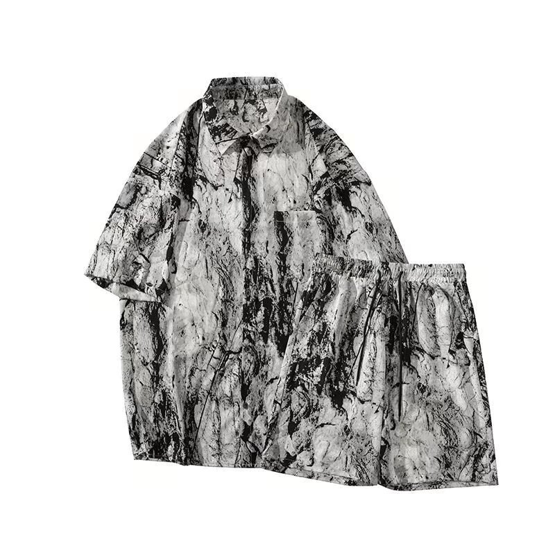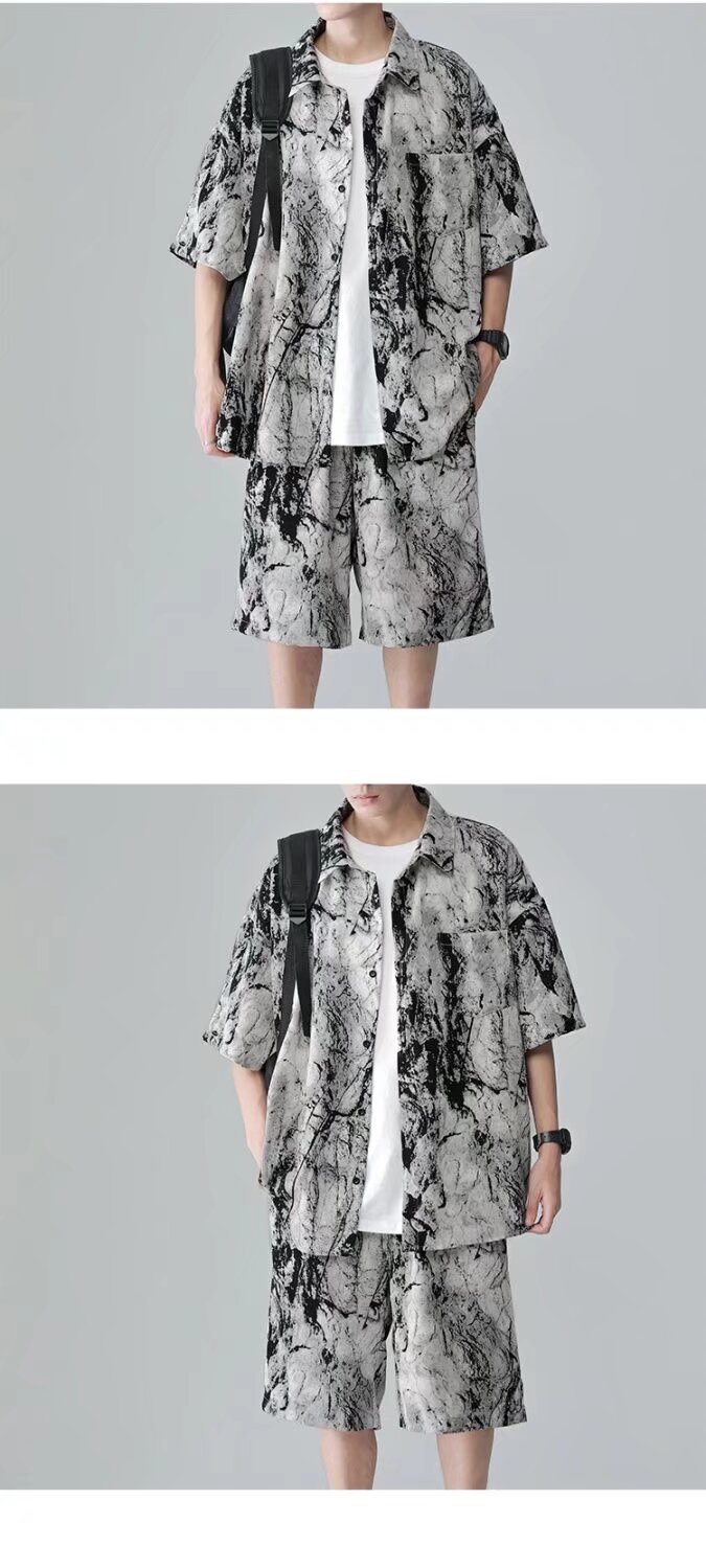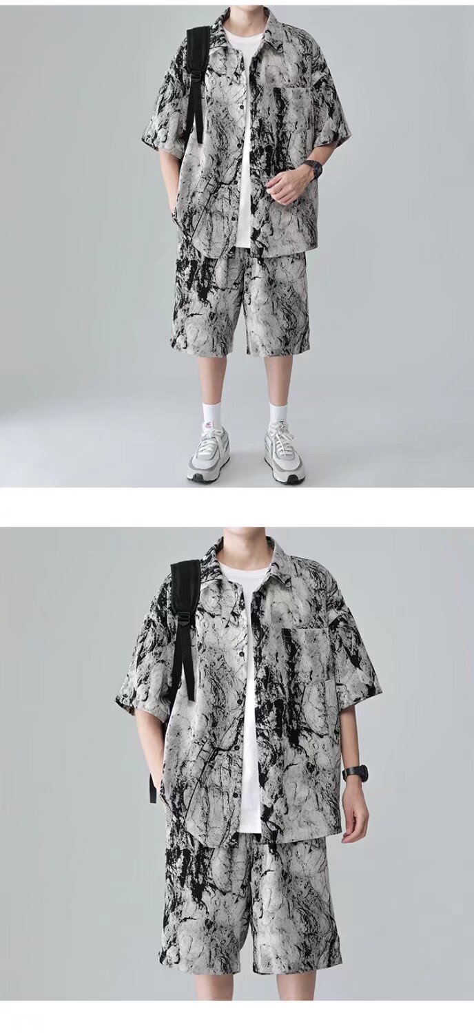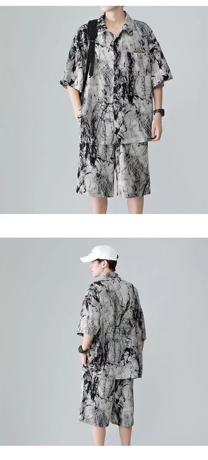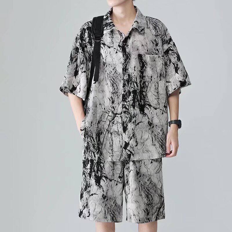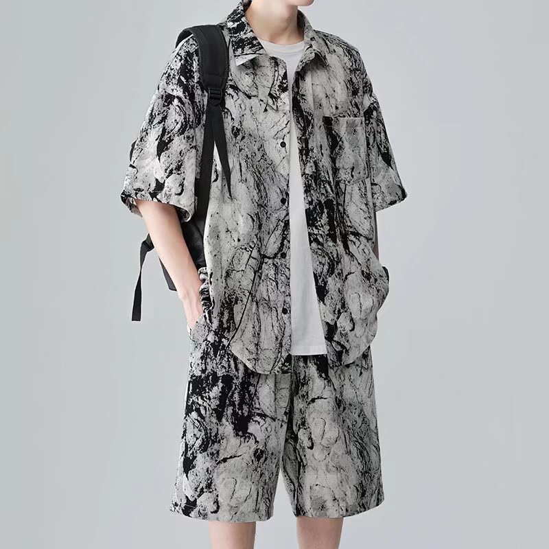 넥타이 염료 아이스 실크 스포츠 투피스 남성 반팔 셔츠 십대 성격 틈새 디자인 센스 캐주얼 Planky 핸섬 세트스토어 가기