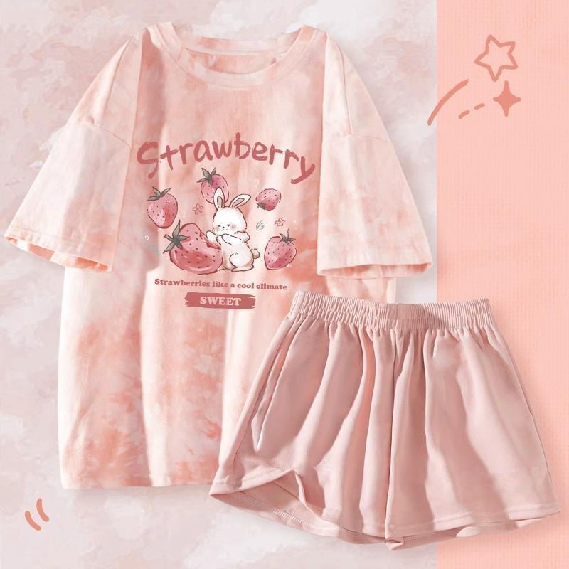 • 02 딸기 토끼 G-타이-염료 더블 짧은 세트