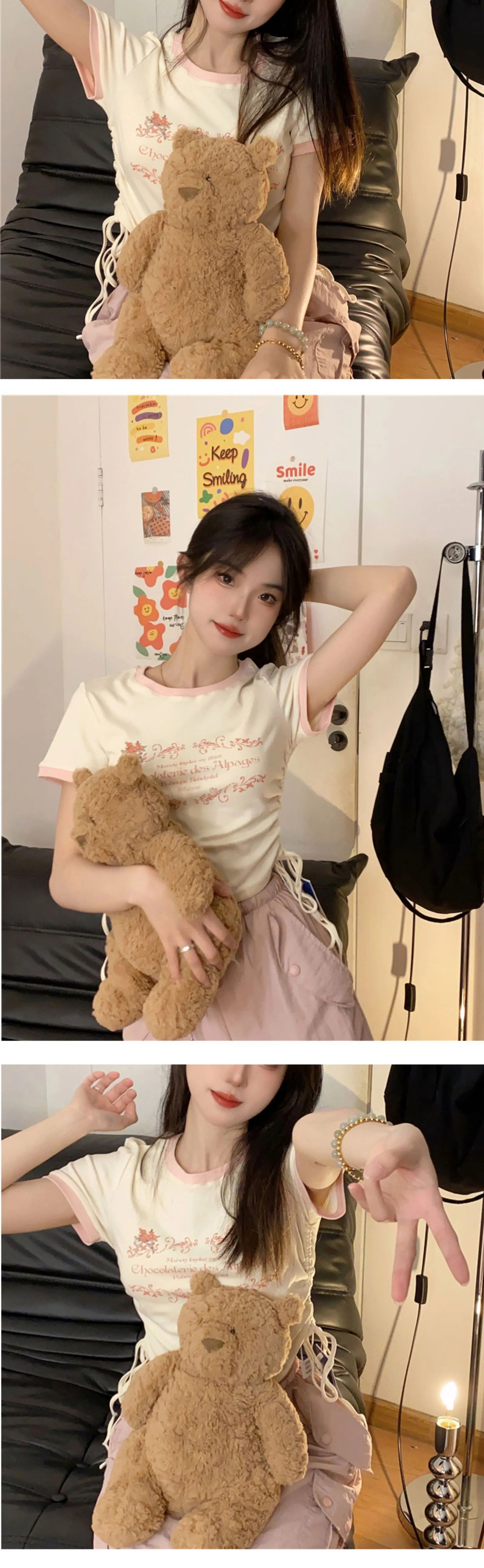 달콤하고 매운 스타일 배꼽 노출 반팔 티셔츠 여성용 여름 틈새 디자인 센스 드로우 스트링 슬림 핏 쇼트베이스 탑 Ins