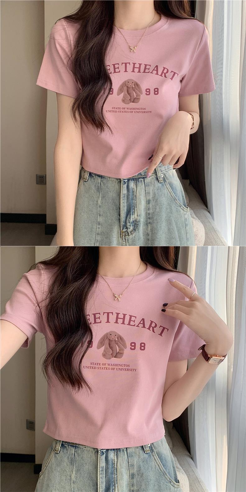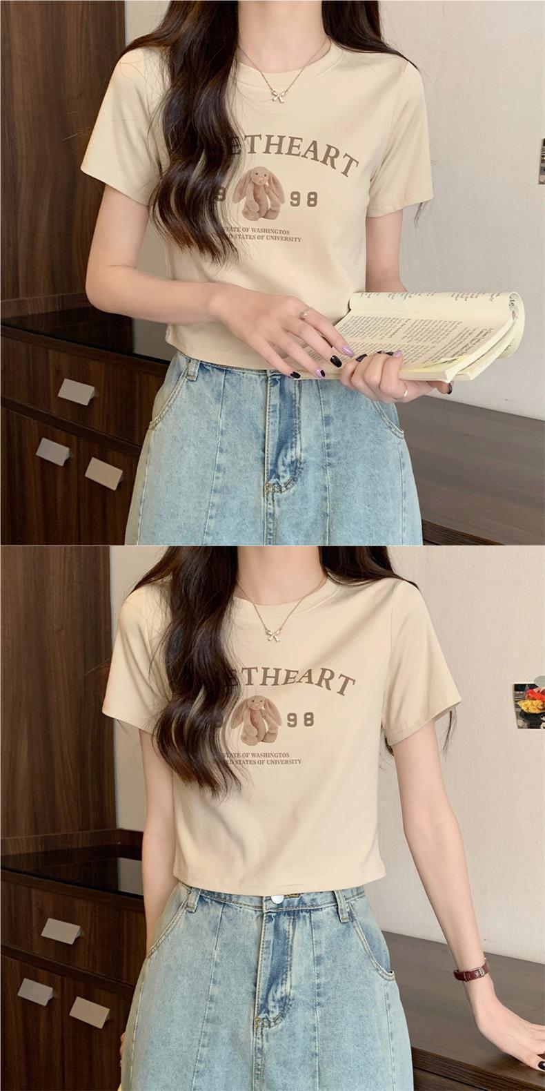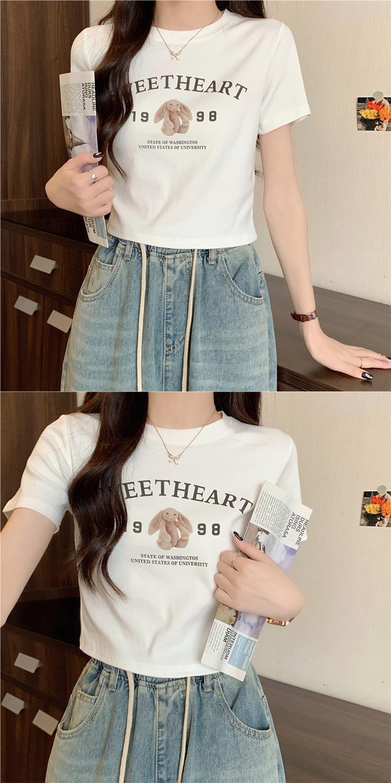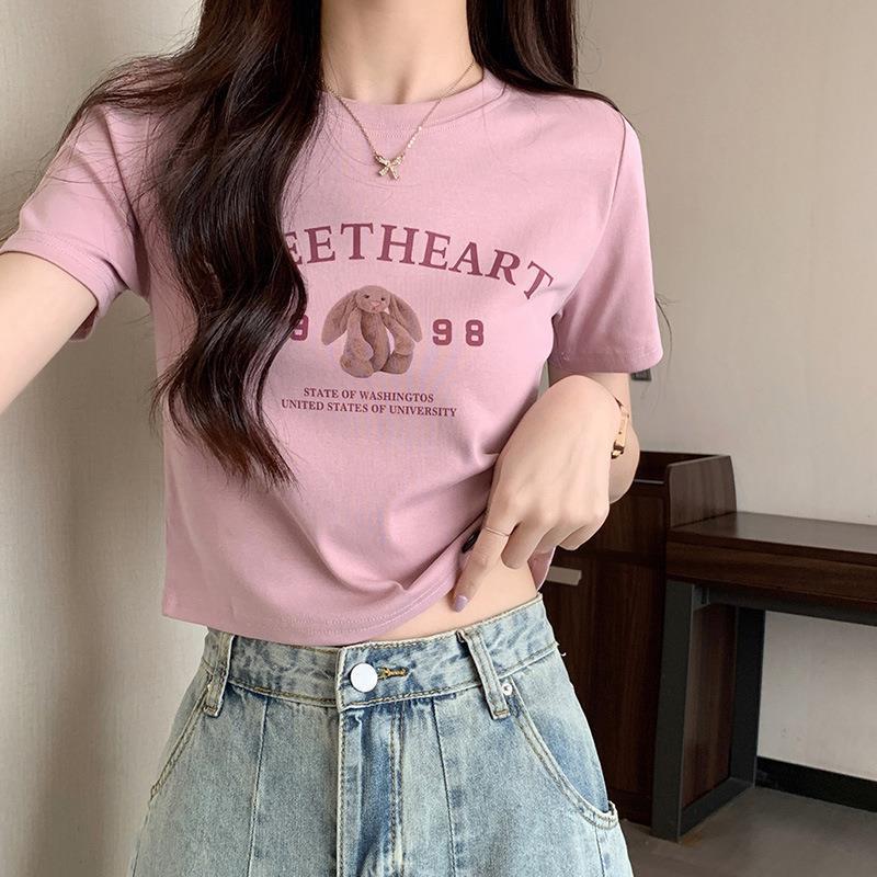 여성용 레터 프린트 반팔 티셔츠 여름 2025 새로운 스타일 오른쪽 어깨 짧은 스타일 슬리밍 한국 스타일 하이 엔드 이너 탑스토어 가기