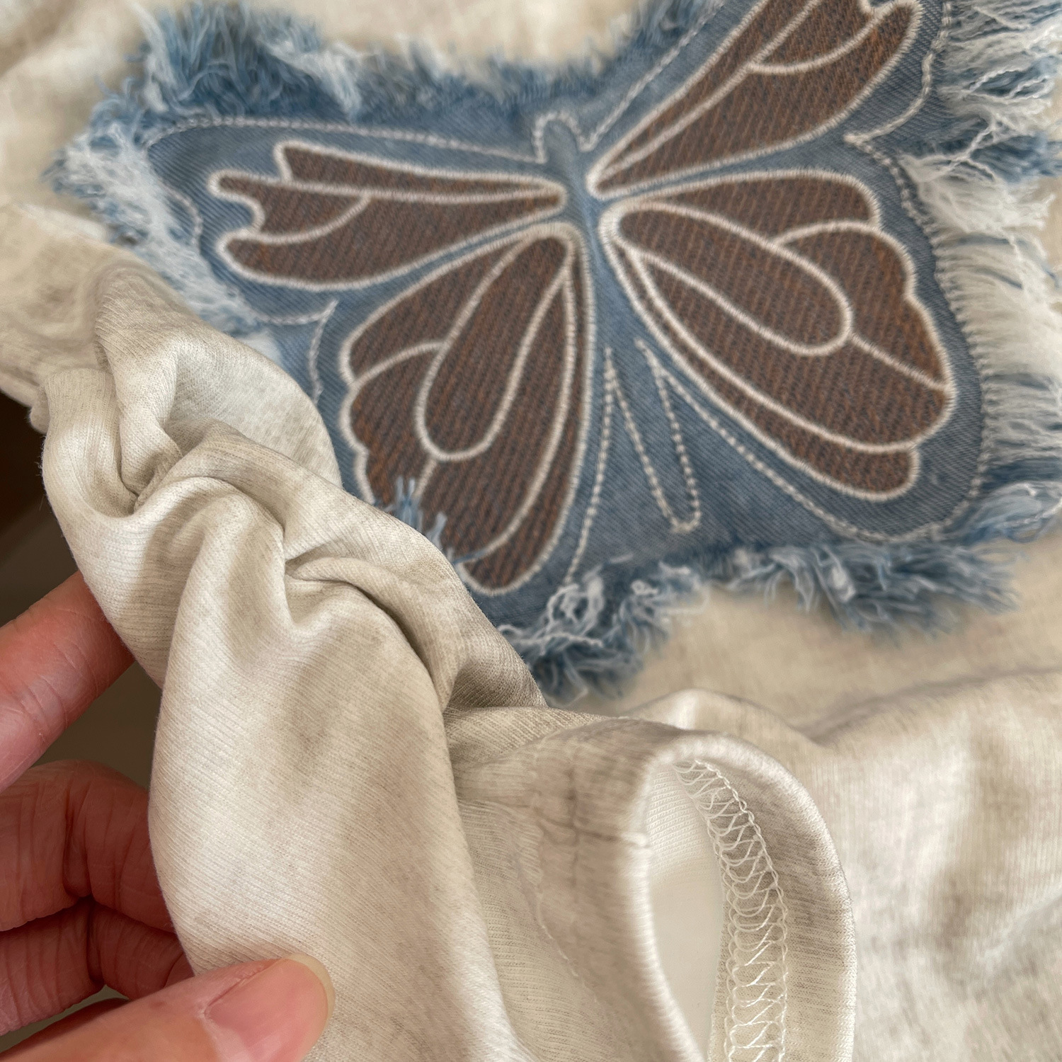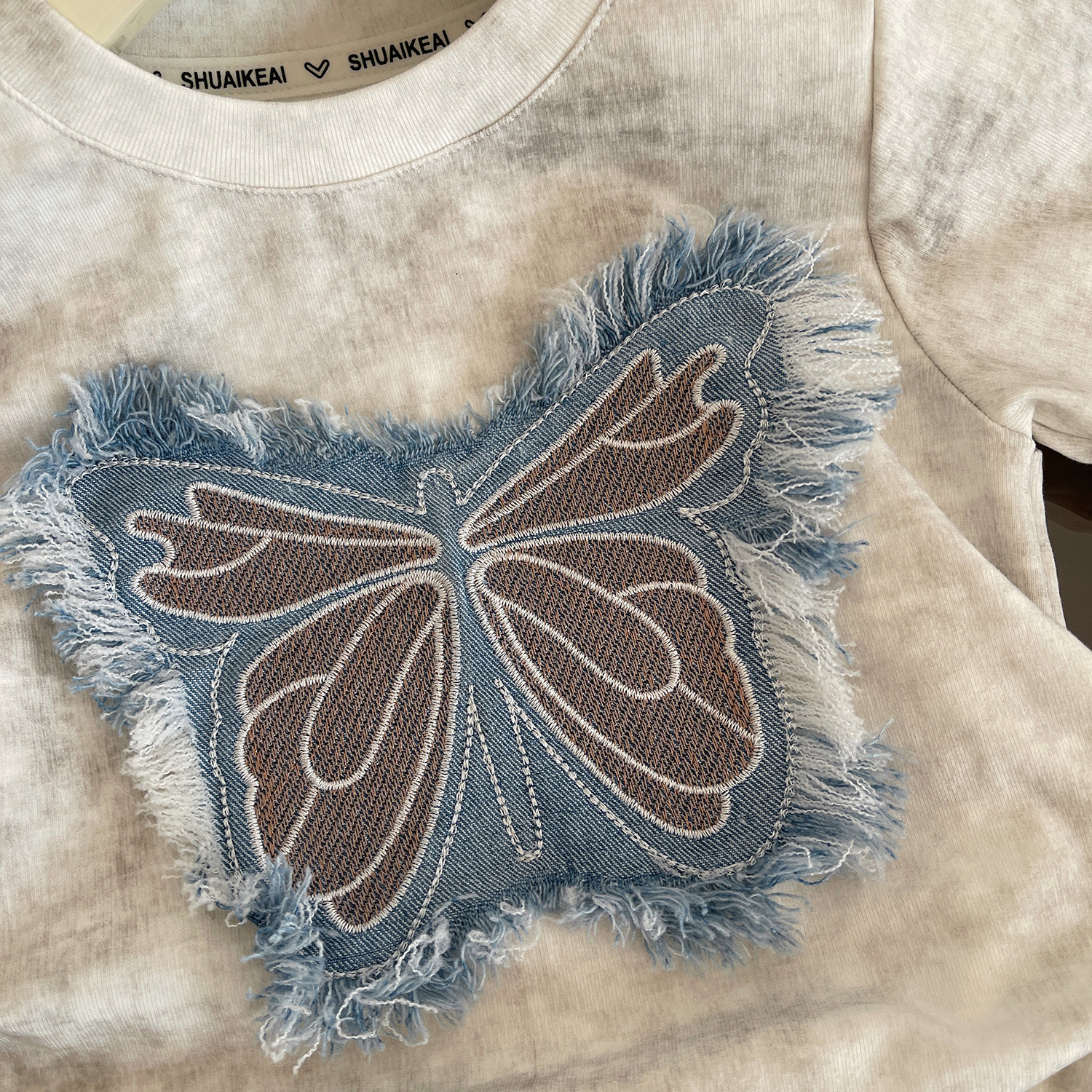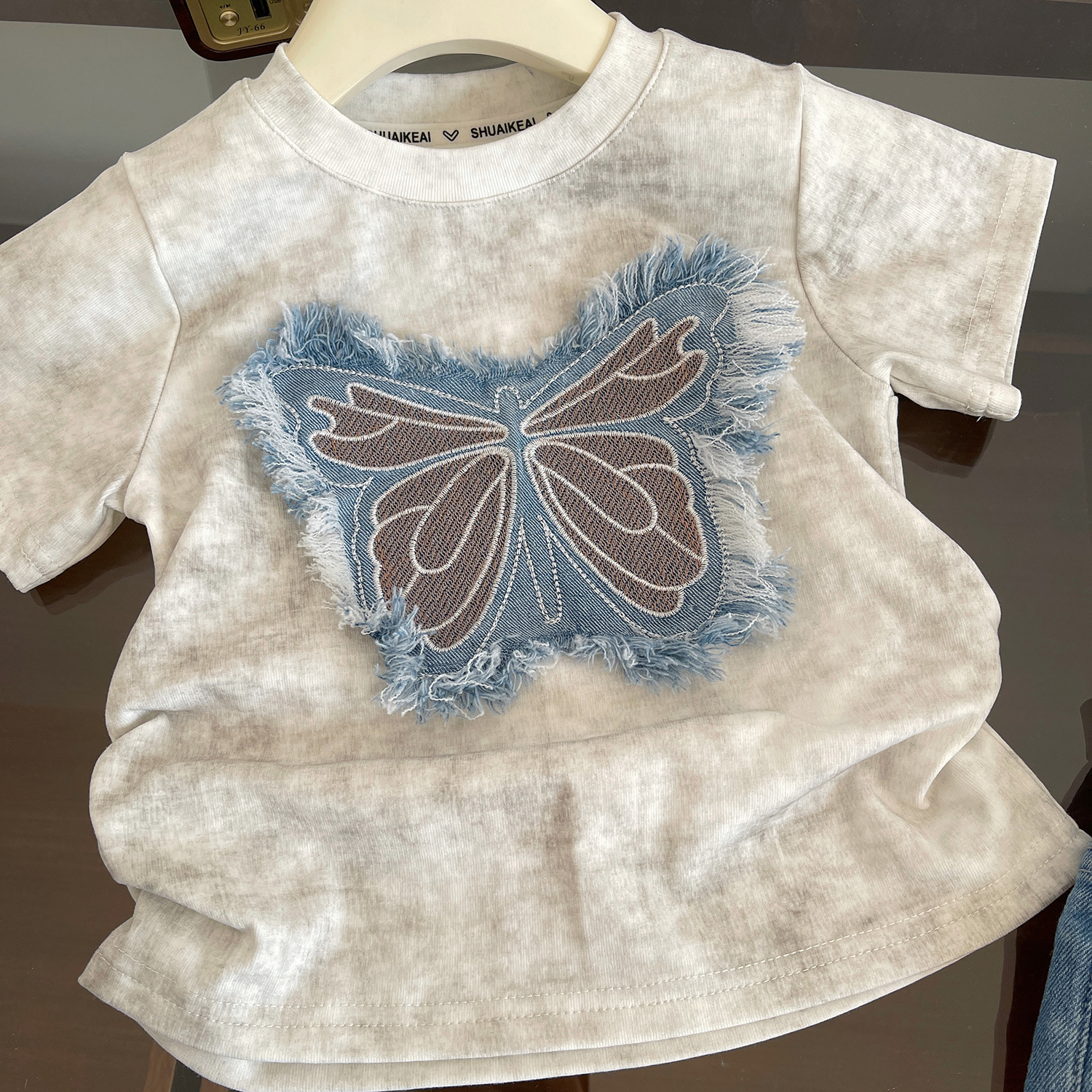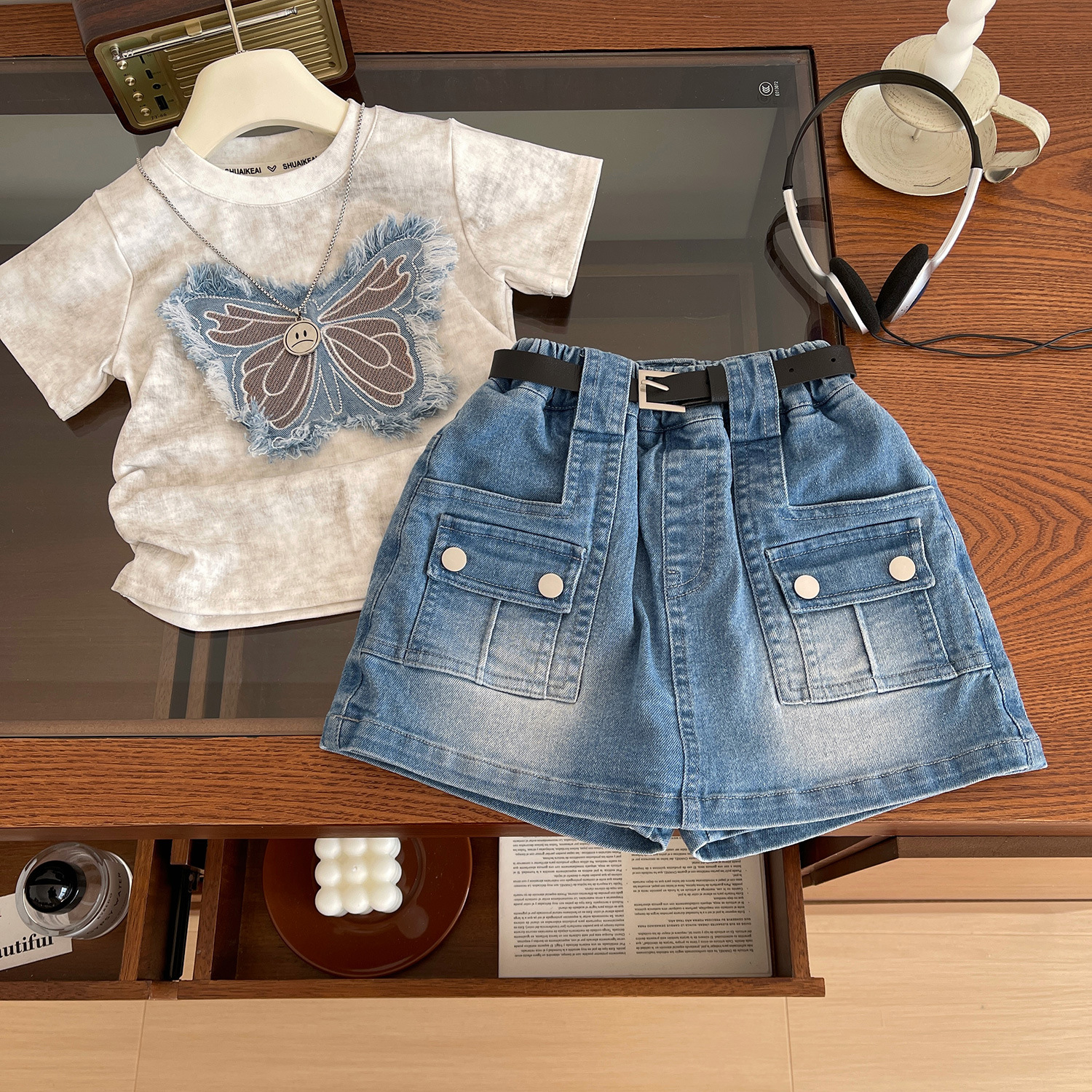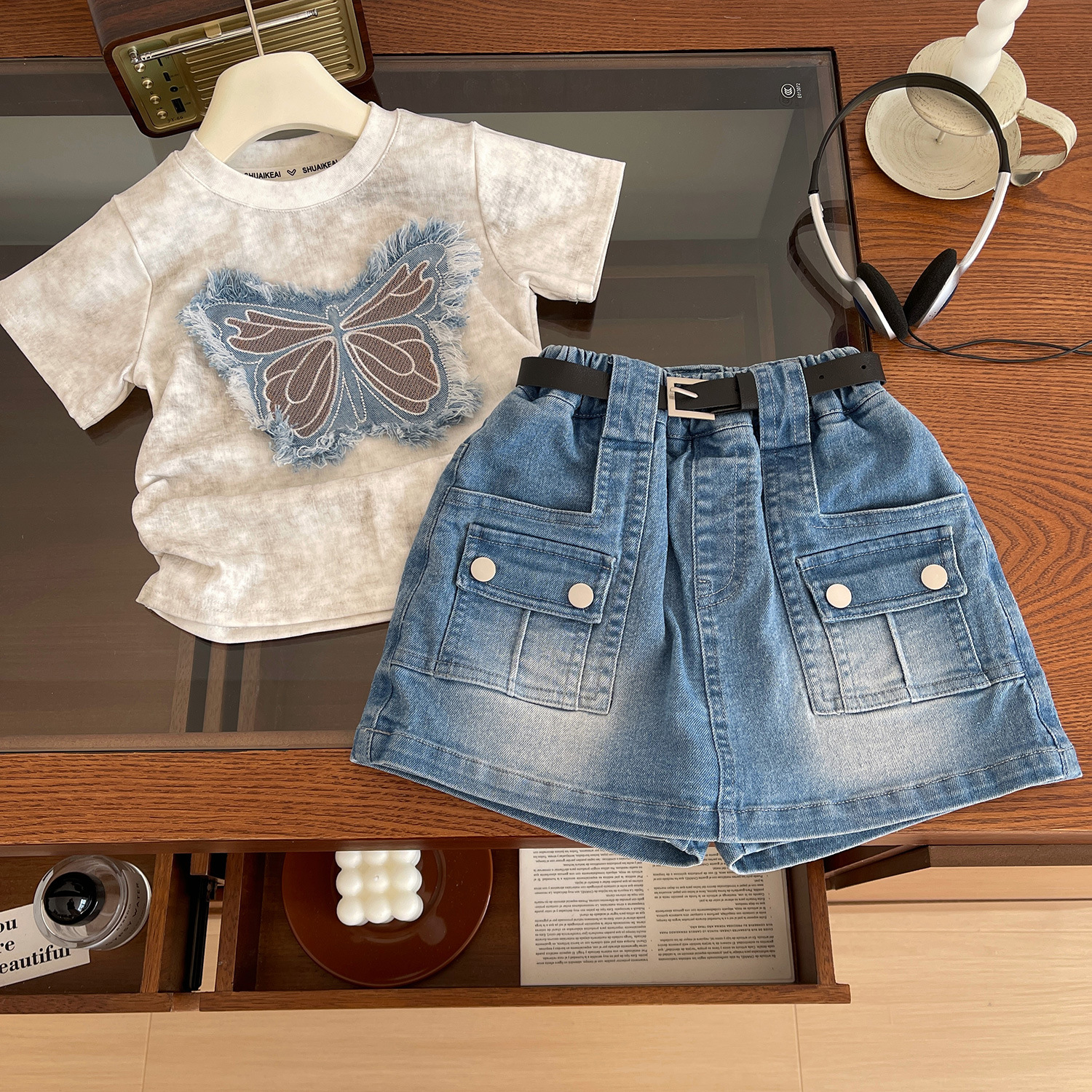 2025 새로운 여름 한국 스타일 소녀 데님 나비 패치 반팔 티셔츠 + 데님 치마바지 투피스 슈트