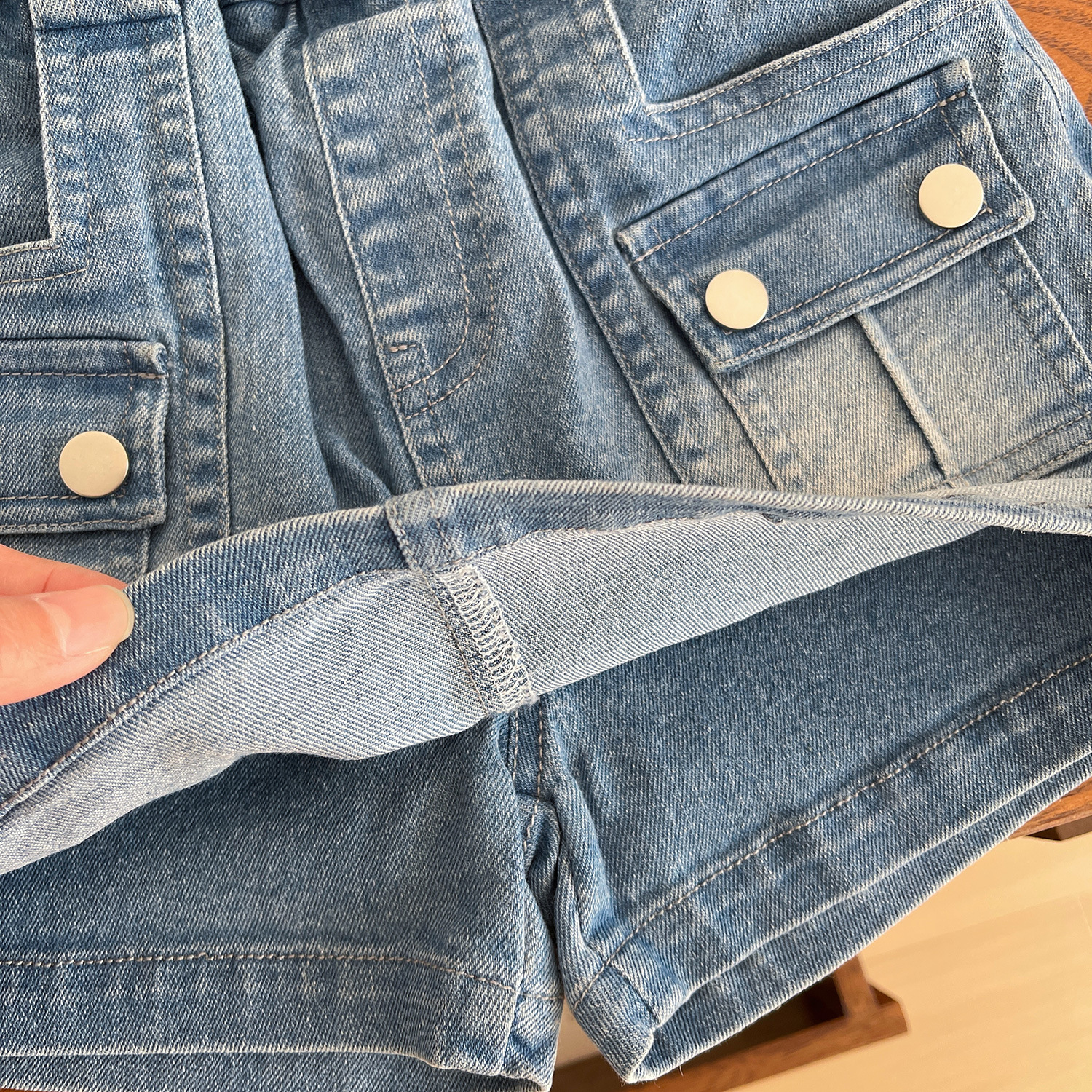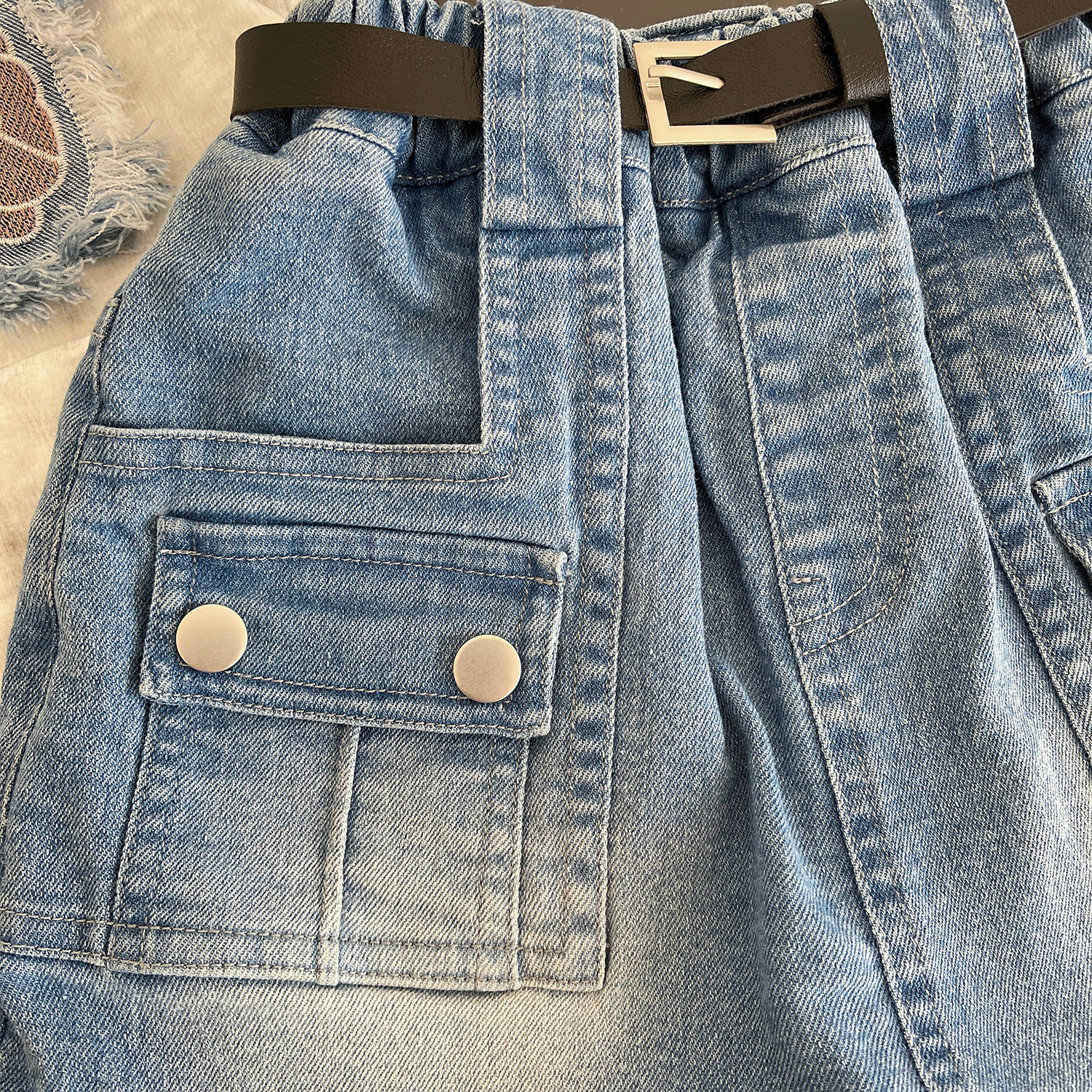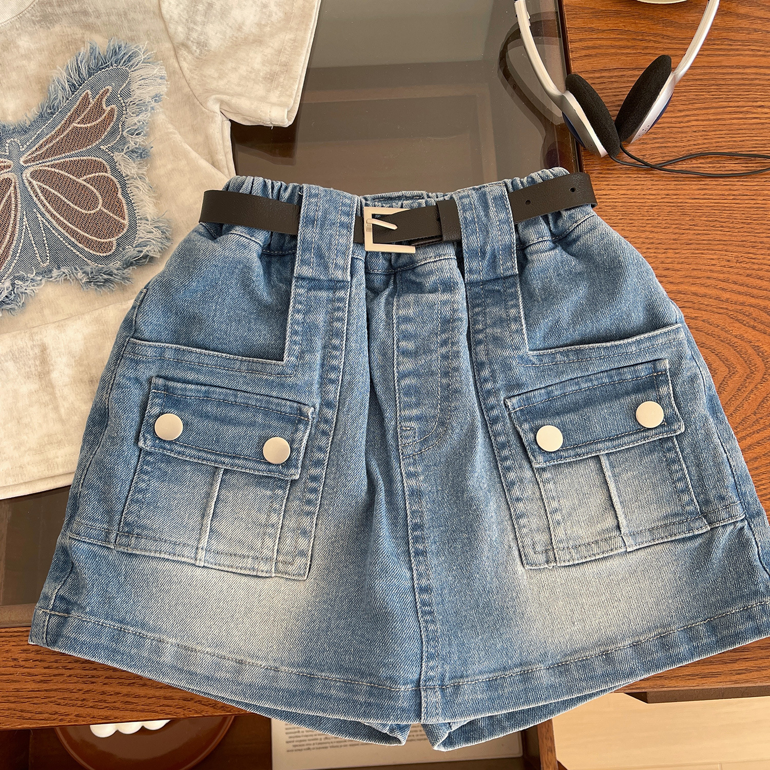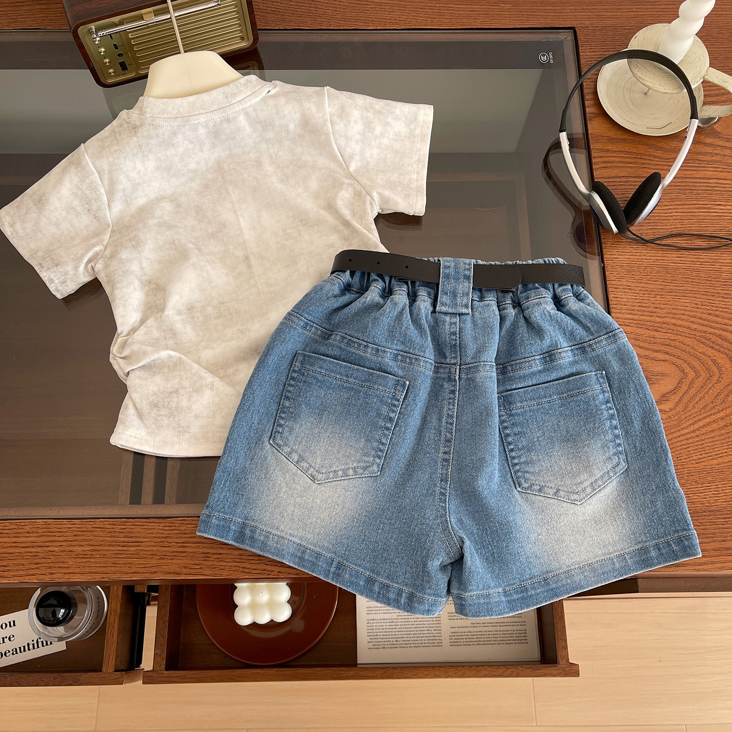 2025 새로운 여름 한국 스타일 소녀 데님 나비 패치 반팔 티셔츠 + 데님 치마바지 투피스 슈트스토어 가기