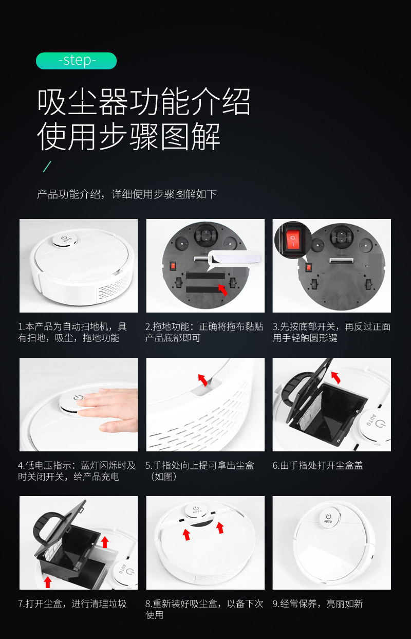 清扫原理:扫吸拖一体设计。碰到障碍物会转弯,依靠底部吸附细小颗粒物、灰尘、瓜子壳、狗狗毛发、地板的头发,这款扫地机是不能跟上千元(如科沃斯,追觅,石头)的扫地机作比较的。