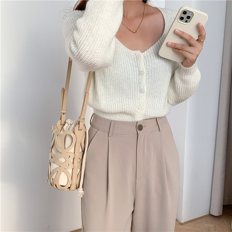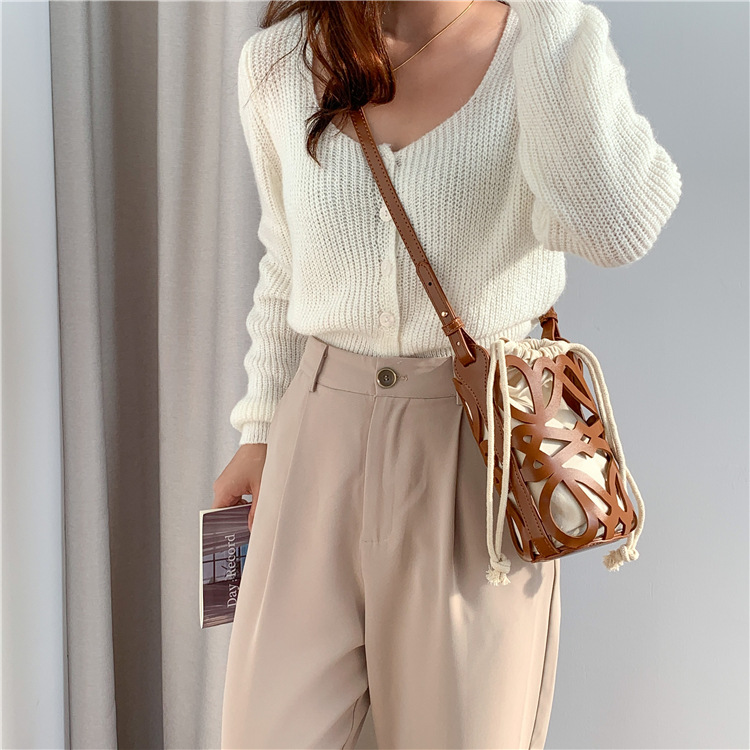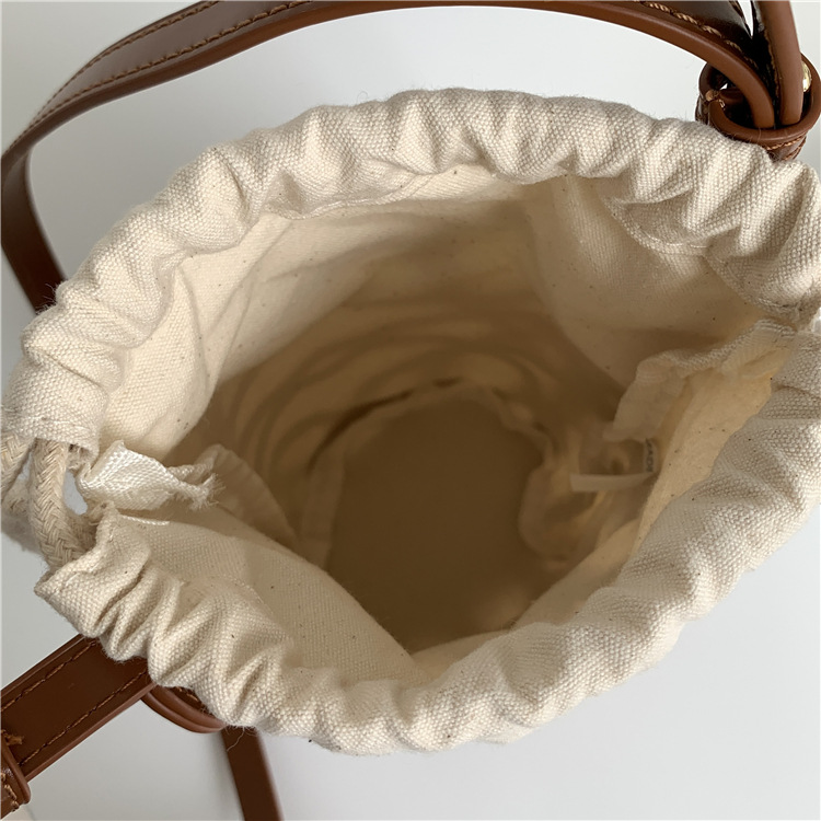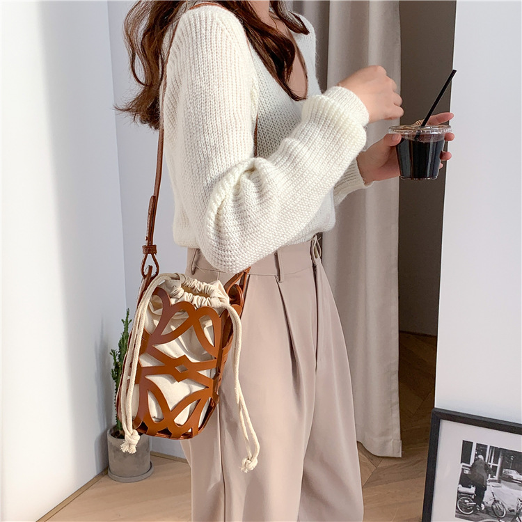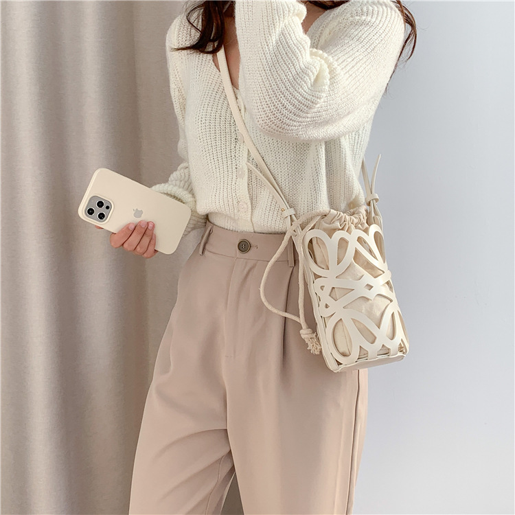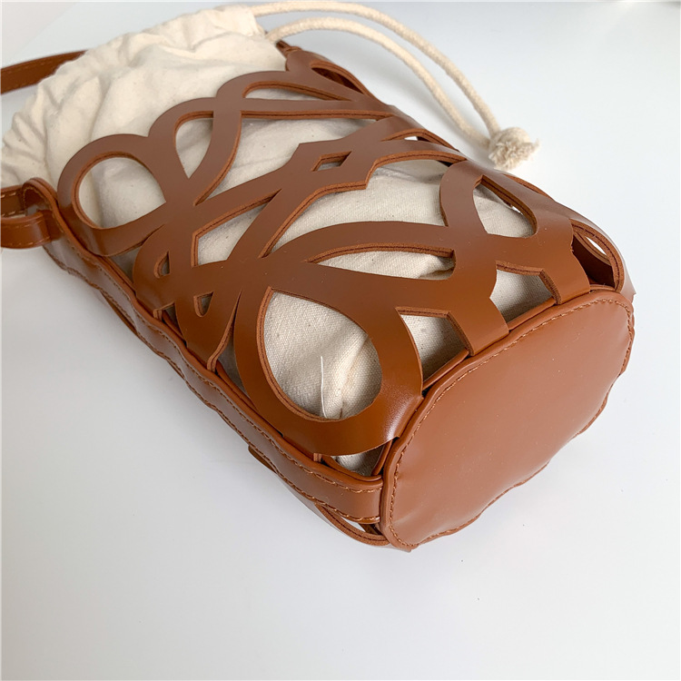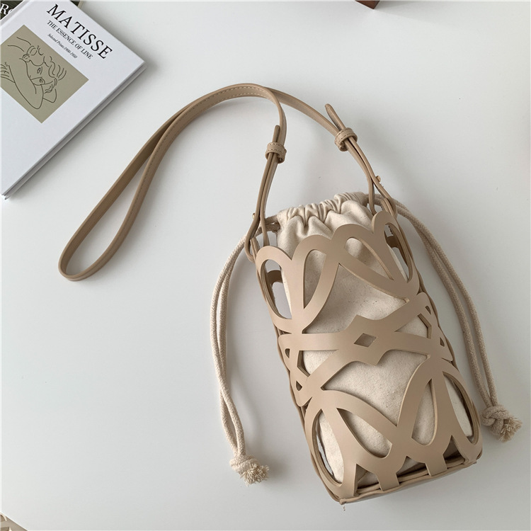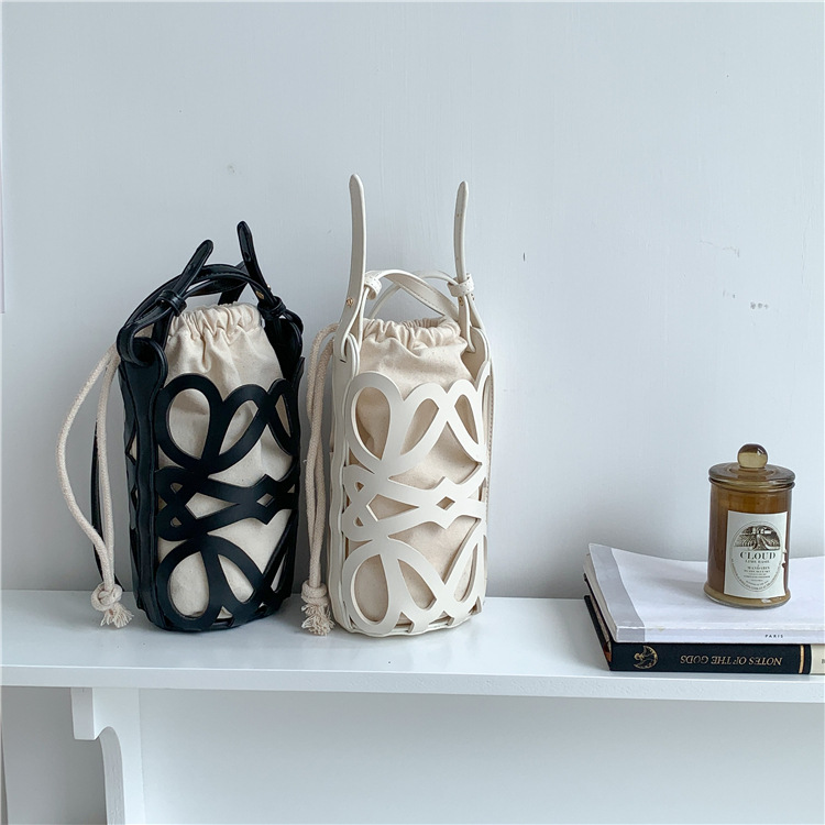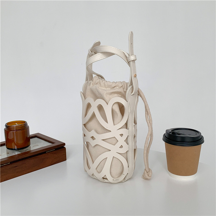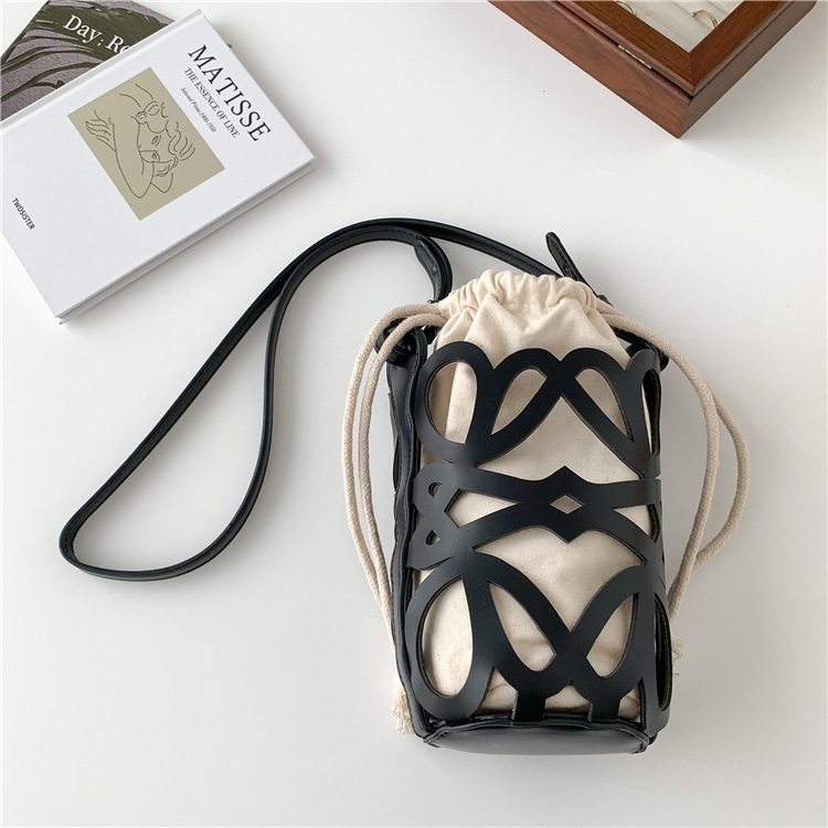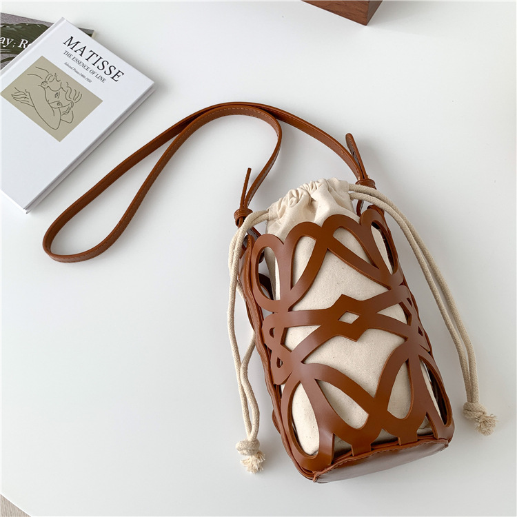 여성용 크로스보더 니치 디자인 중공 원통형 버킷백, PU 다용도 크로스바디 휴대폰 가방, 캔버스 숄더백, 여성용 가방스토어 가기