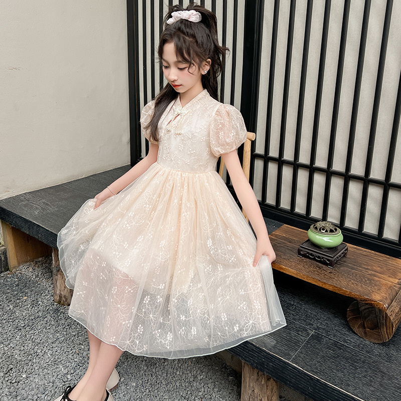 여자 여름 새로운 중국 스타일 원피스 2024 새로운 유행 서양 스타일 큰 아이 버블 소매 청삼 메쉬 공주 원피스
