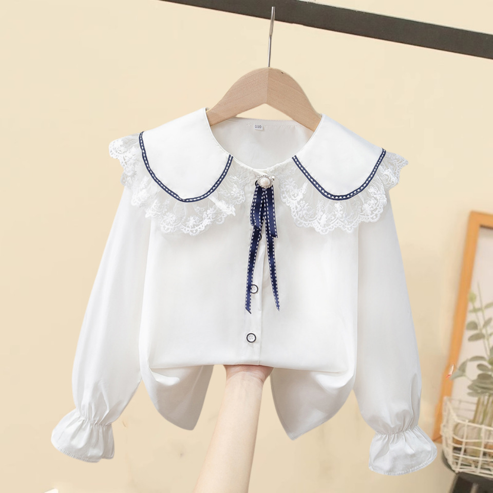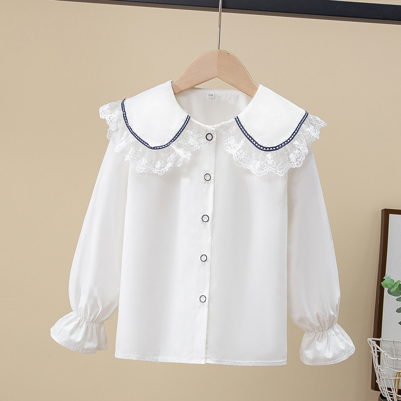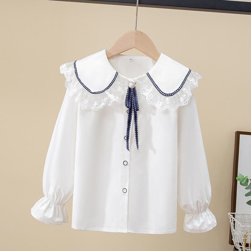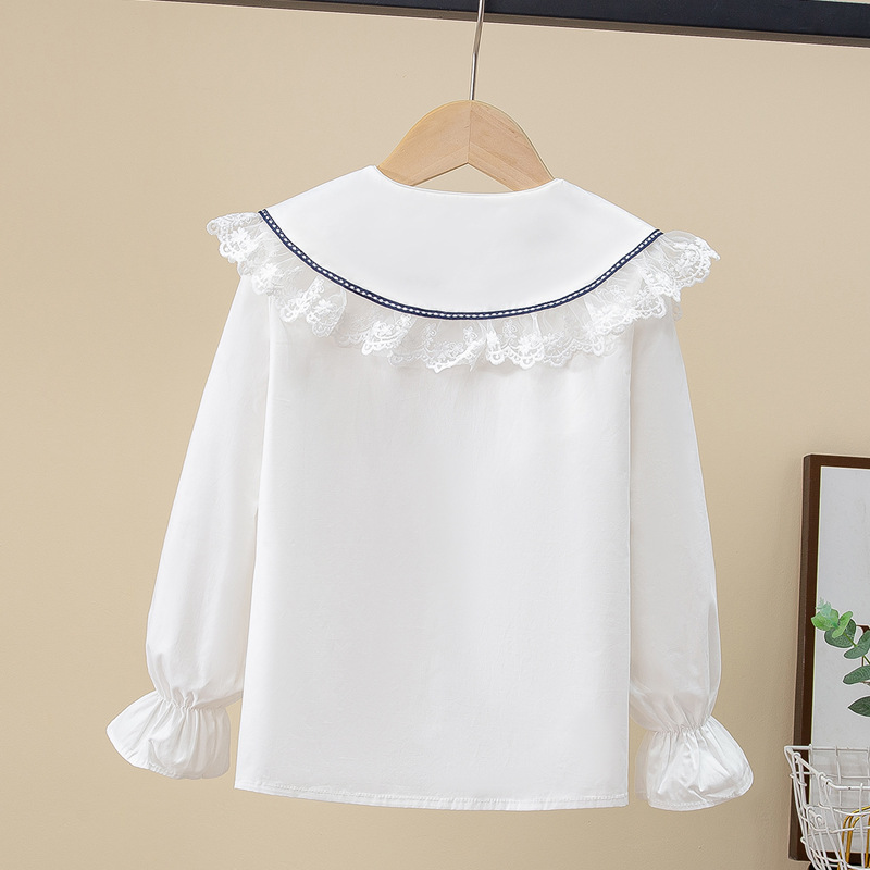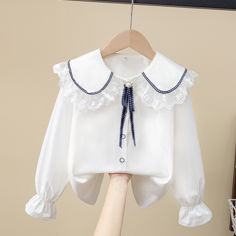 봄 2024 봄 어린이 셔츠 소녀 프랑스 가장자리 칼라 화이트 셔츠 여성 보물 디자인 긴 소매 셔츠