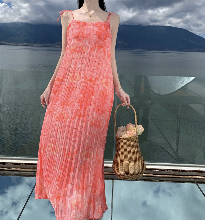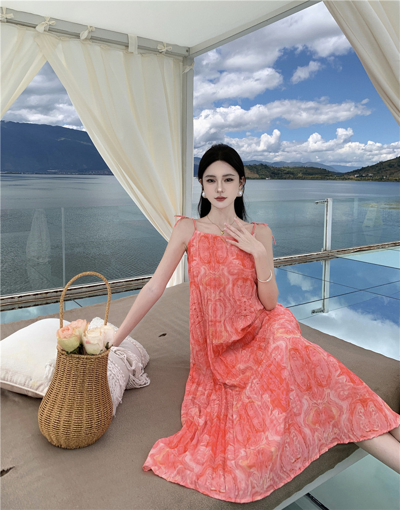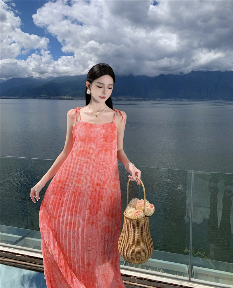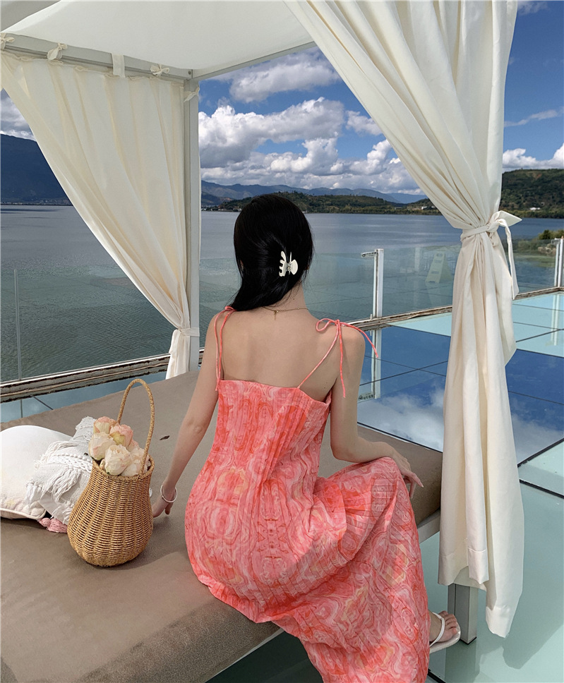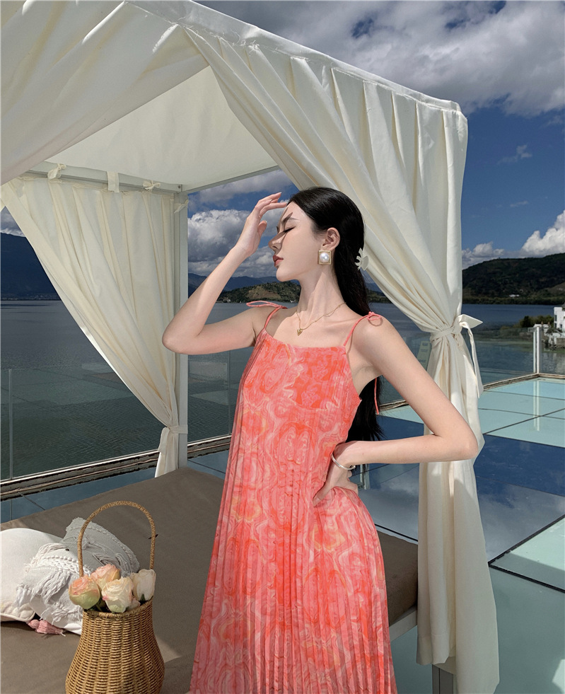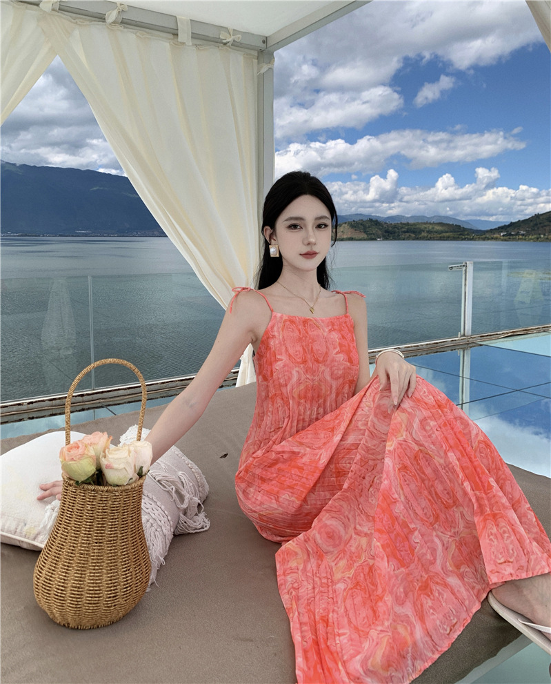 2024 해변 휴가 스타일 도파민 비치 원피스 독특한 슈퍼 니스 핑크 주름 인쇄 슬링 원피스스토어 가기