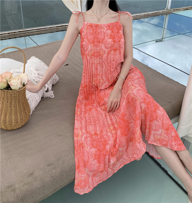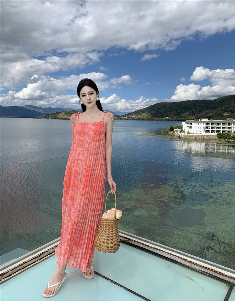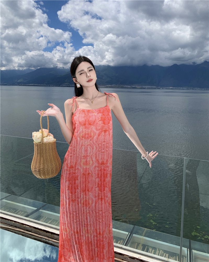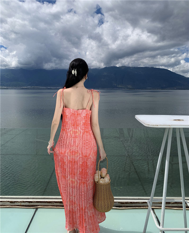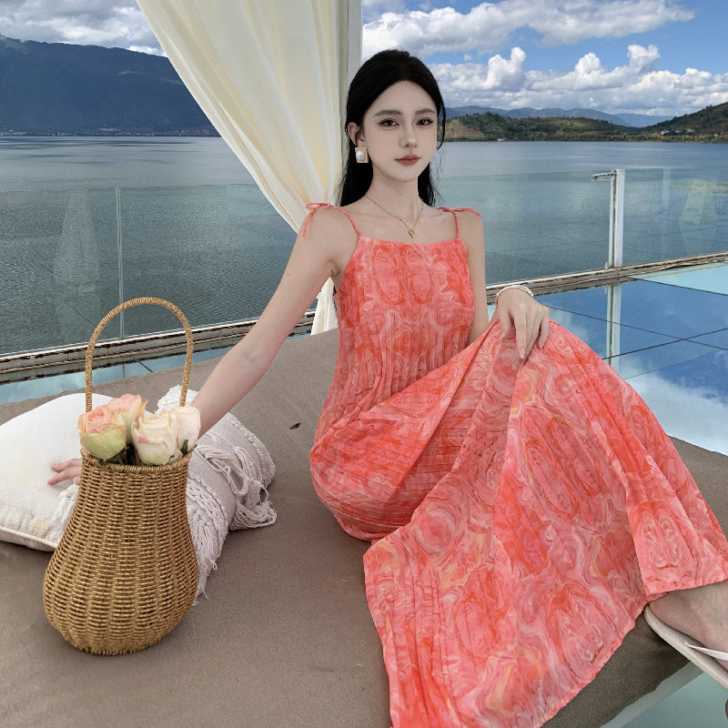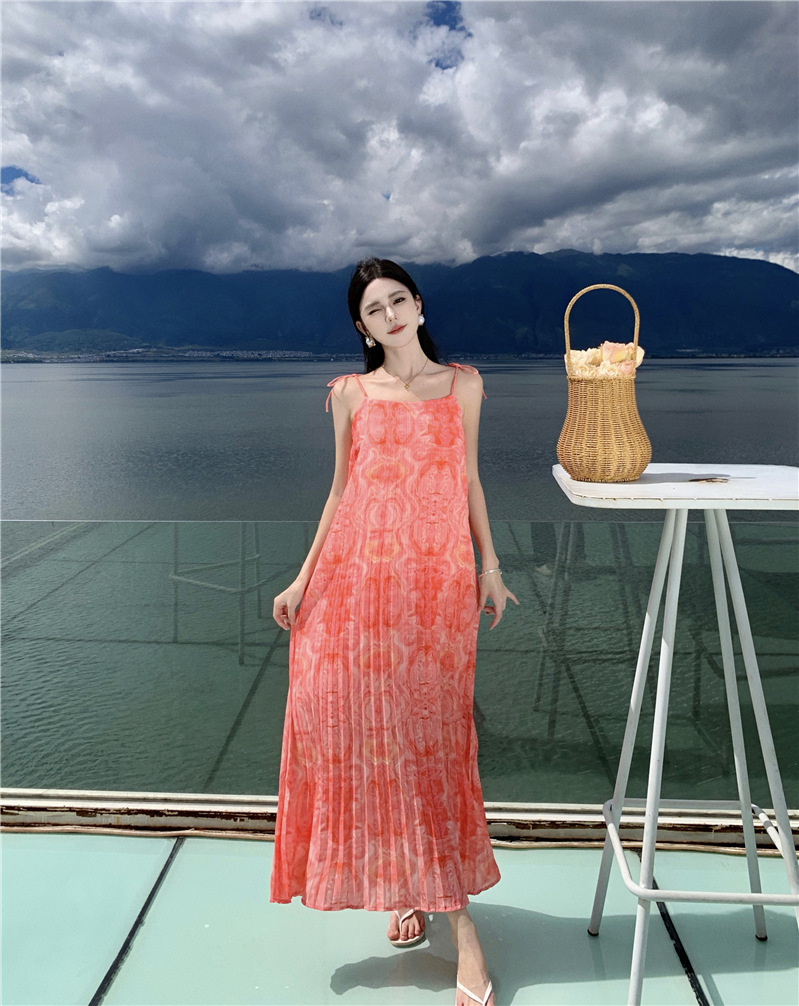 2024 해변 휴가 스타일 도파민 비치 원피스 독특한 슈퍼 니스 핑크 주름 인쇄 슬링 원피스스토어 가기