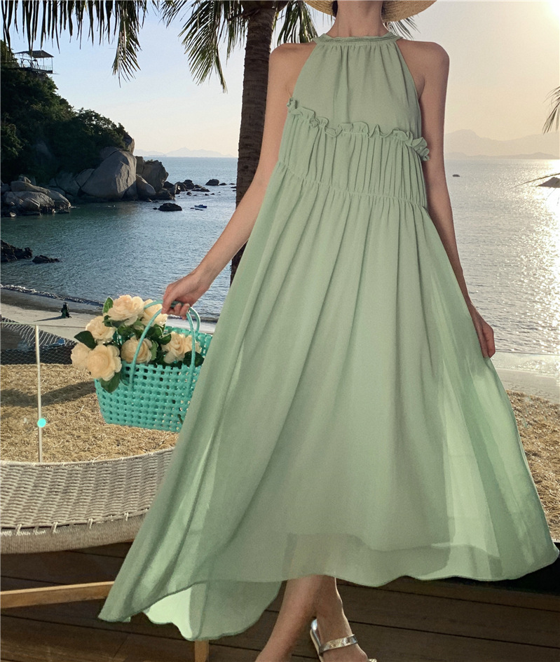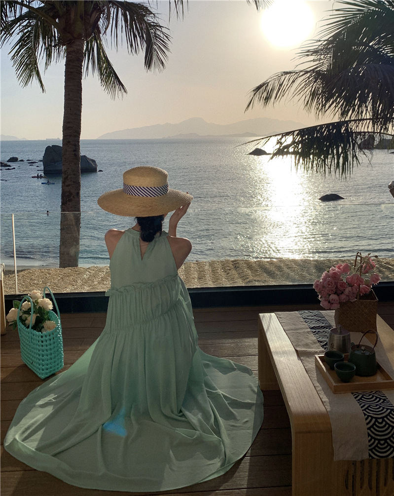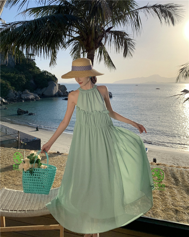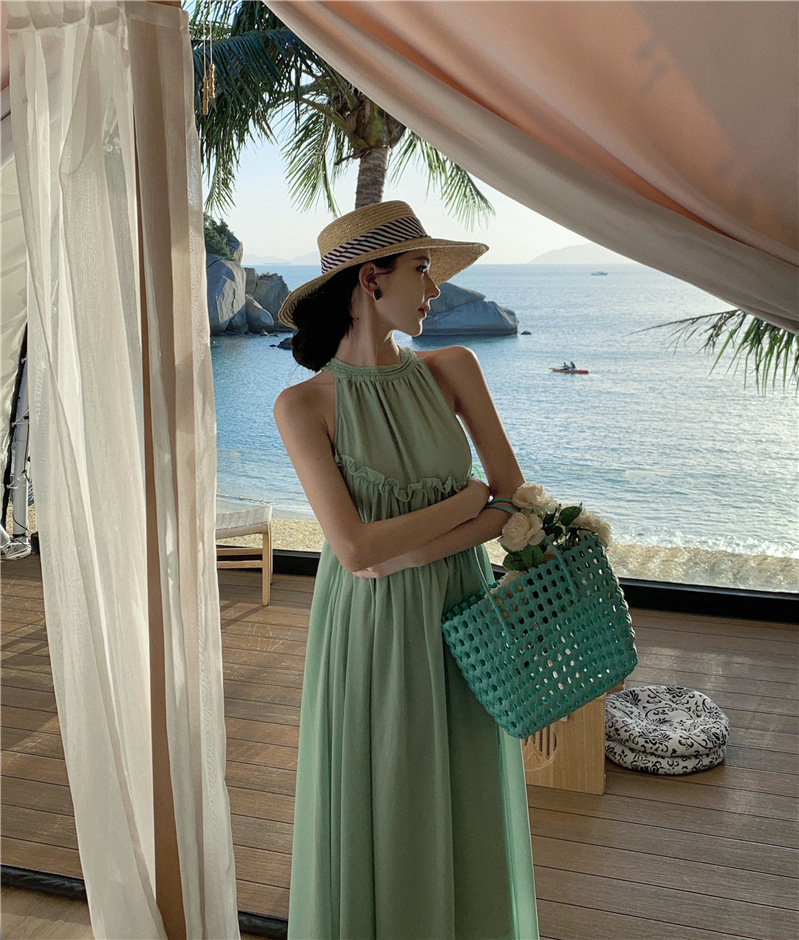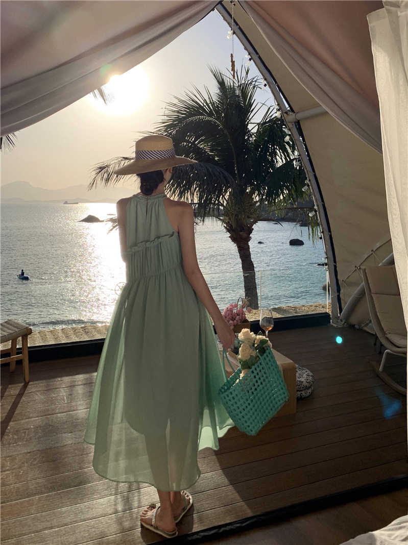프랑스 패션 우아한 포장 된 질감 민소매 목 원피스 흰색 휴일 긴 원피스 주름