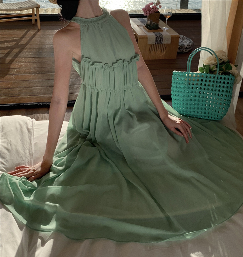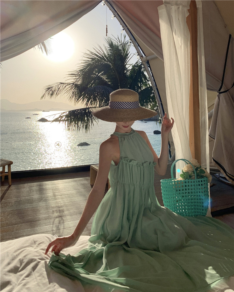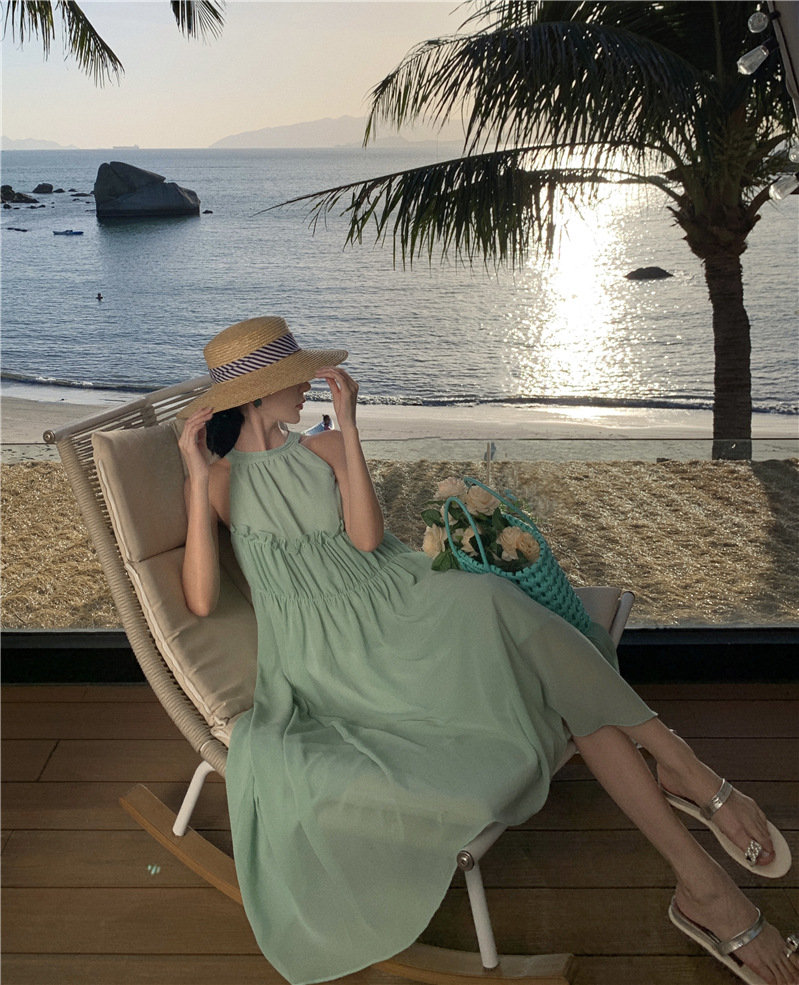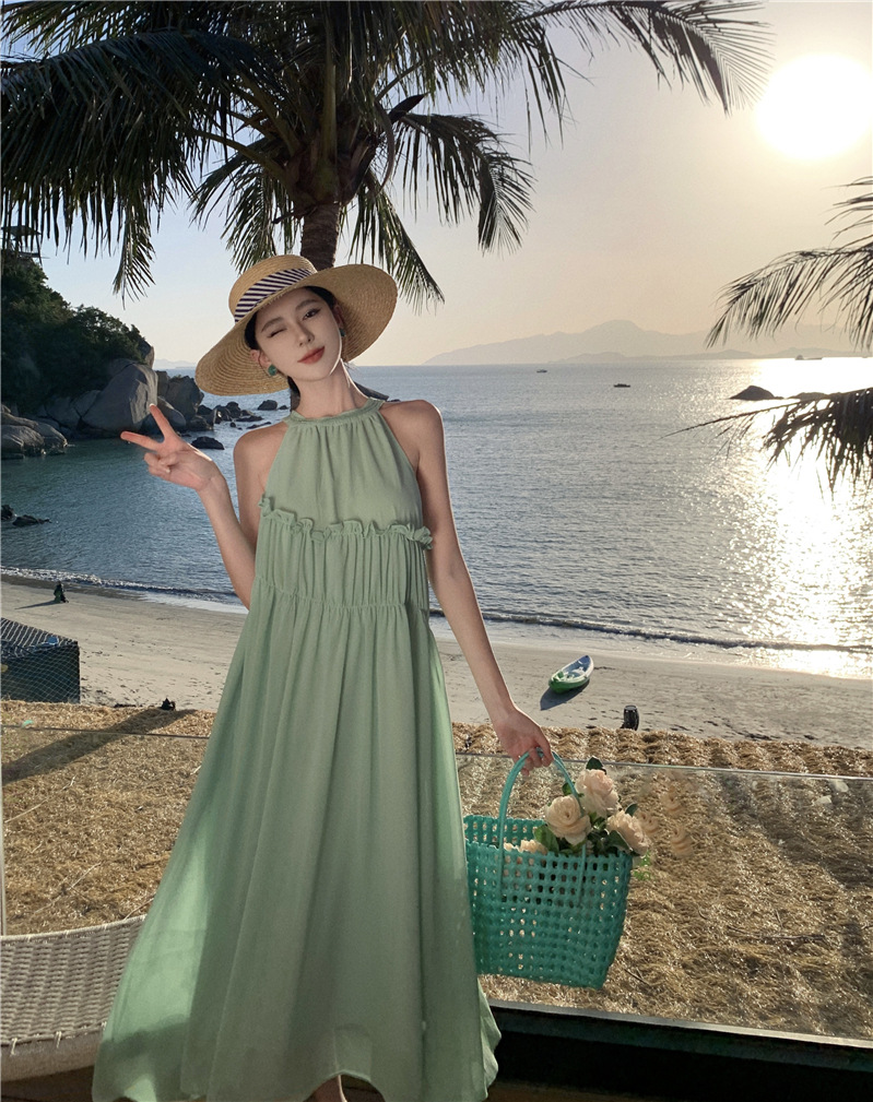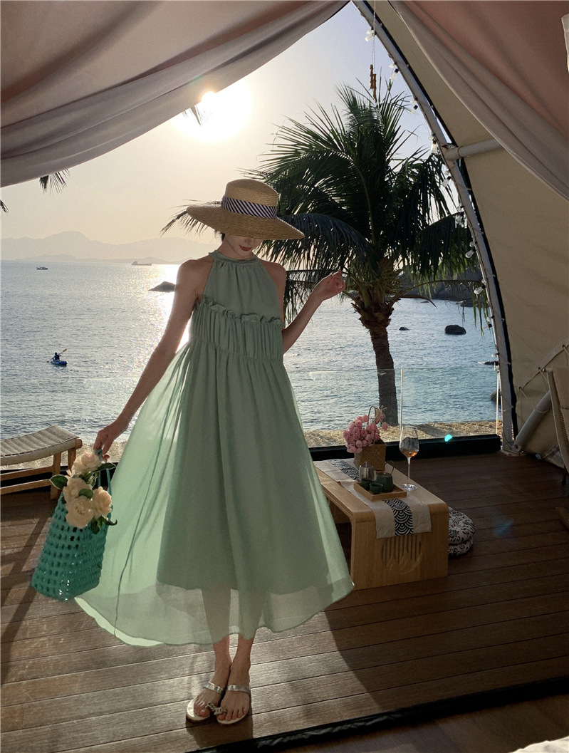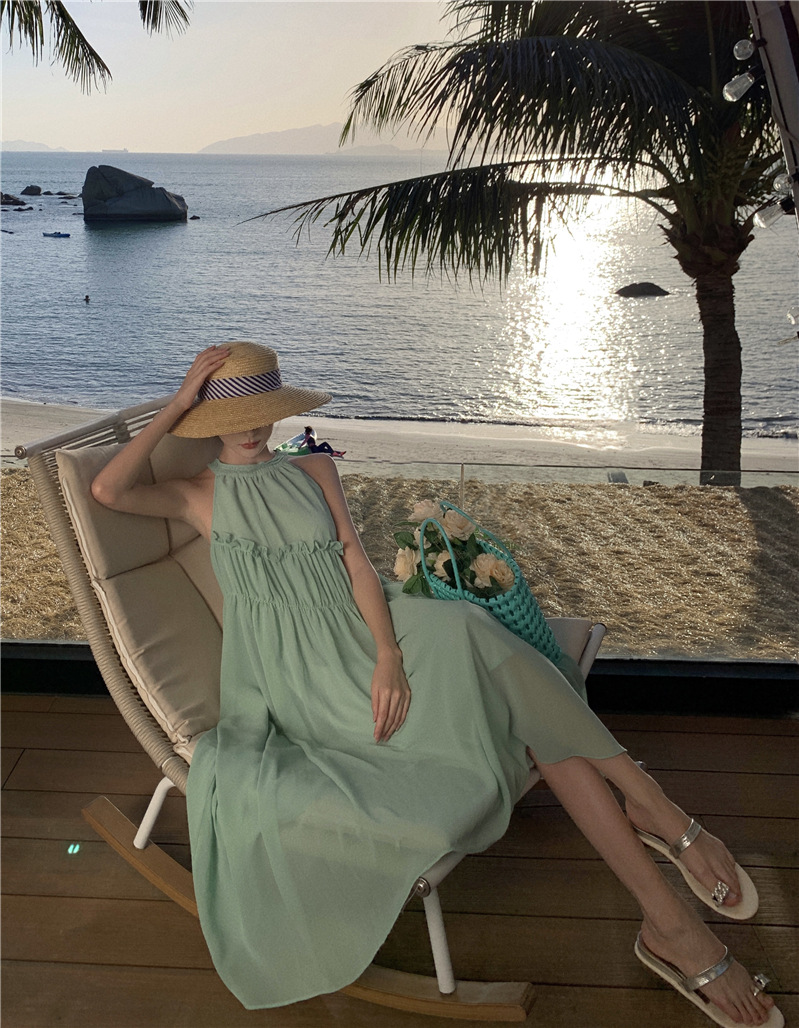 프랑스 패션 우아한 포장 된 질감 민소매 목 원피스 흰색 휴일 긴 원피스 주름