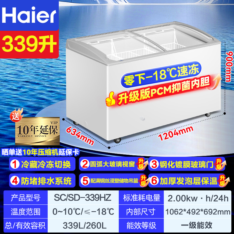 하이얼 냉동고 상업용 수평 339HZ 아이스크림 섬 캐비닛 디스플레이 캐비닛 냉장 투명 유리 도어 냉장고 음료 캐비닛스토어 가기