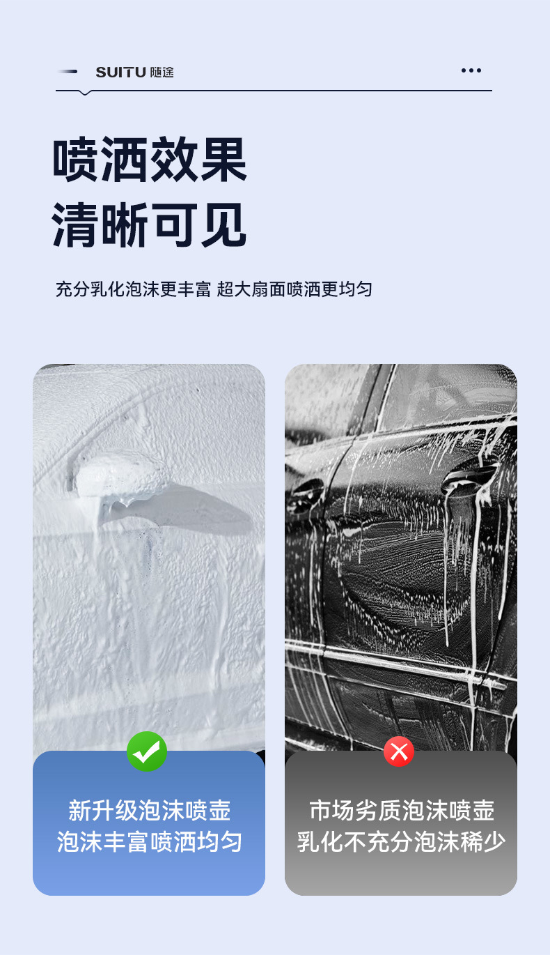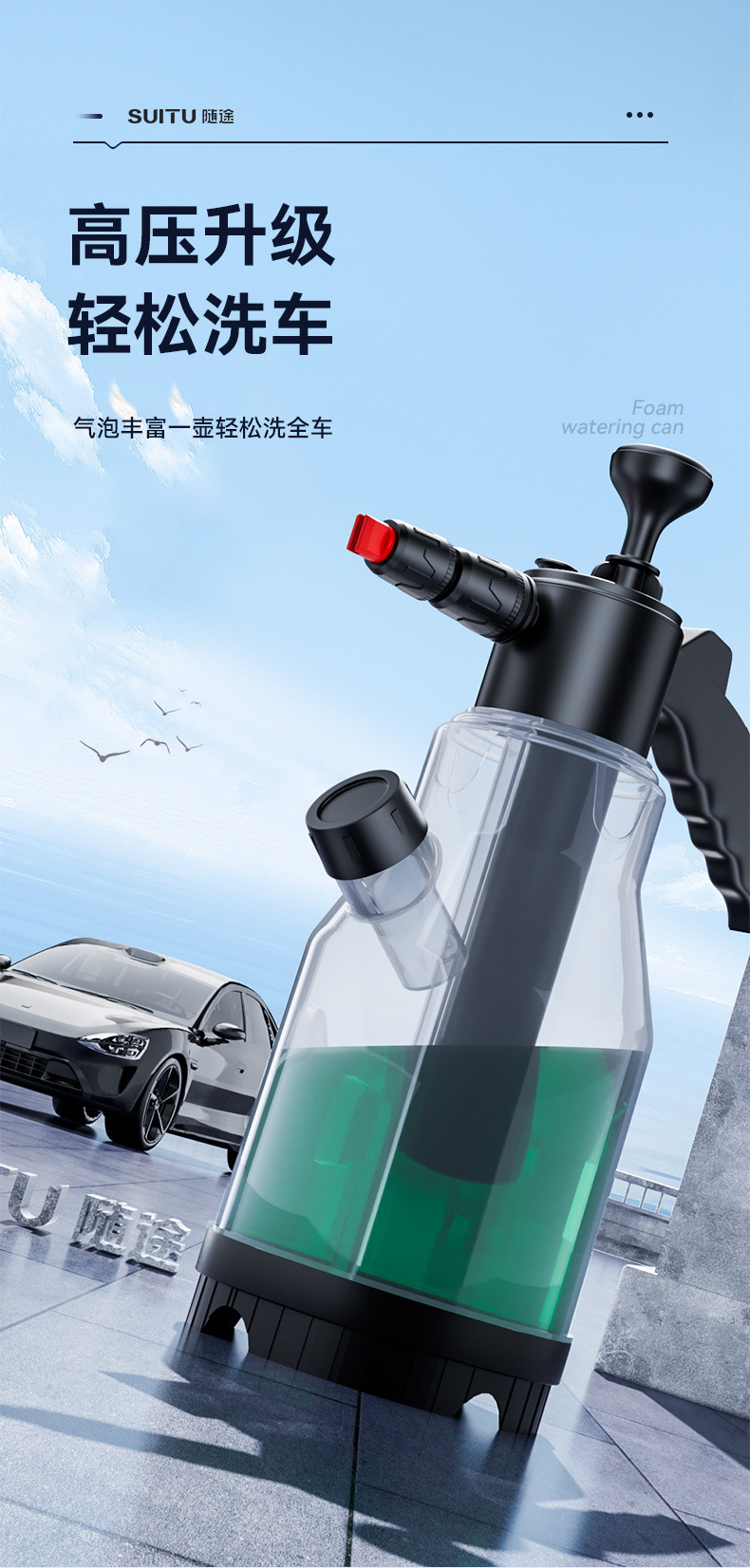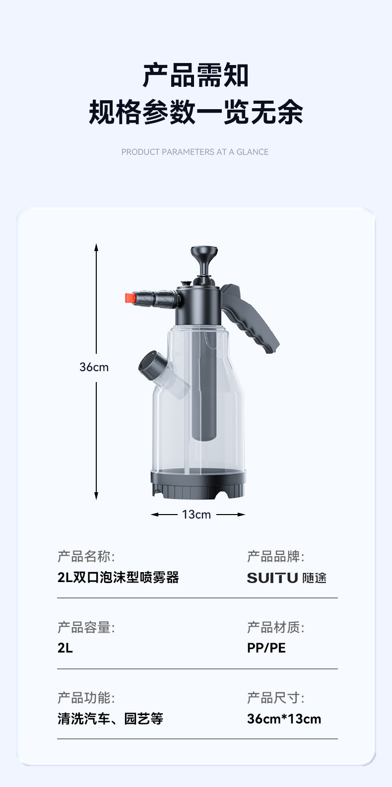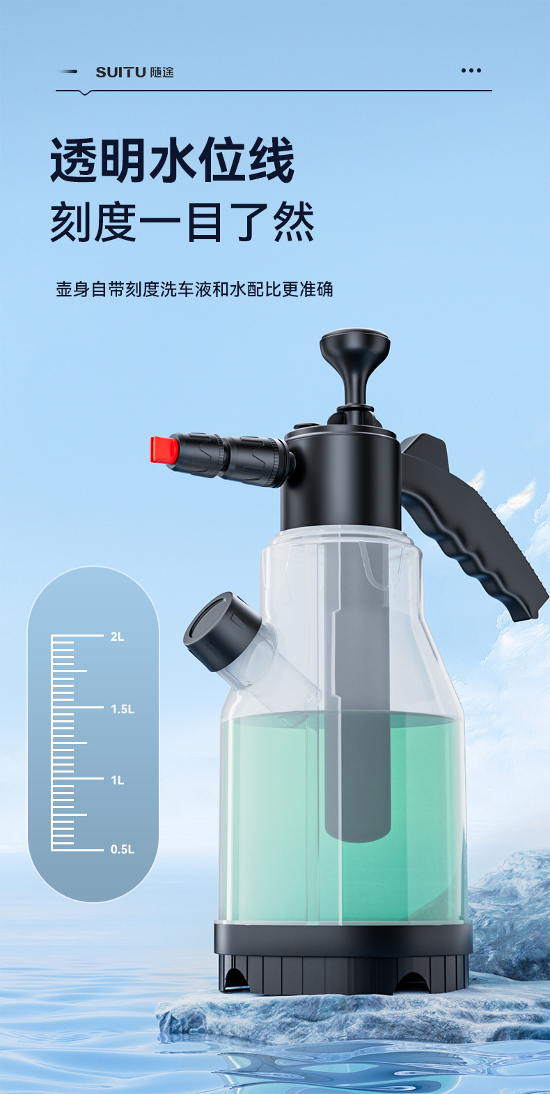 注:泡沫壶壶体有刻度线,加水不能超2L,洗车液和水比列1:50,气泡效果更佳。