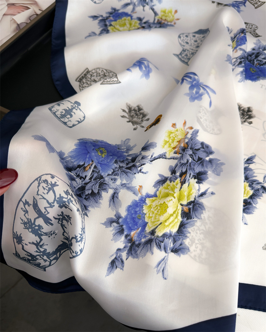 Guofeng 실크 스카프 파란색과 흰색 도자기 스카프 여성 일반 우아한 인쇄 광장 스카프 빈티지 스카프 봄과 여름 새로운 장식 선 스크린스토어 가기