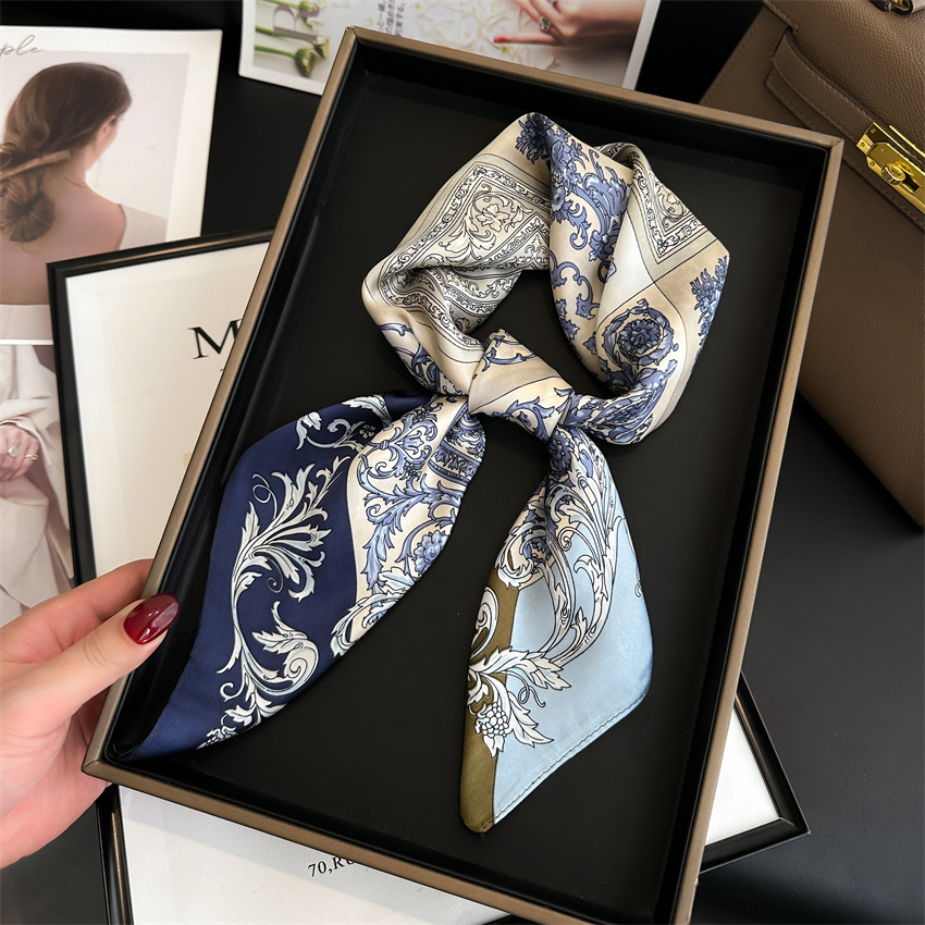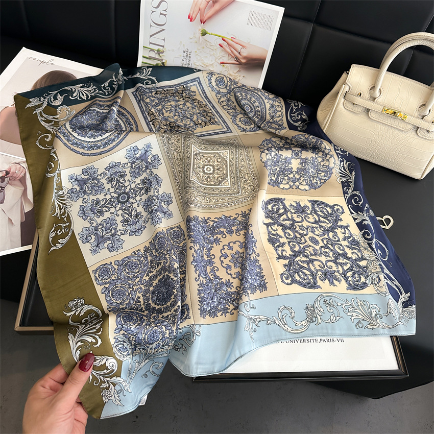 Guofeng 실크 스카프 파란색과 흰색 도자기 스카프 여성 일반 우아한 인쇄 광장 스카프 빈티지 스카프 봄과 여름 새로운 장식 선 스크린