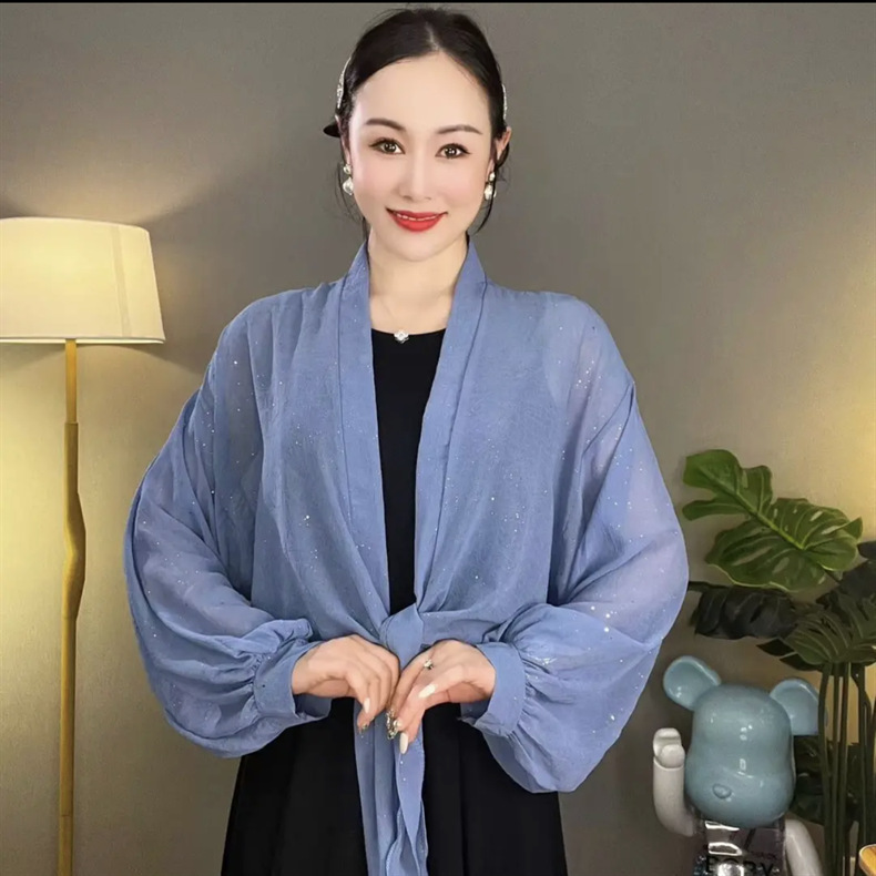 [스타 숄] 스팽글 쉬폰 와이드 소매 선 스크린 의류 여름 얇은 긴 소매 선 스크린 목도리 패션 올 매치