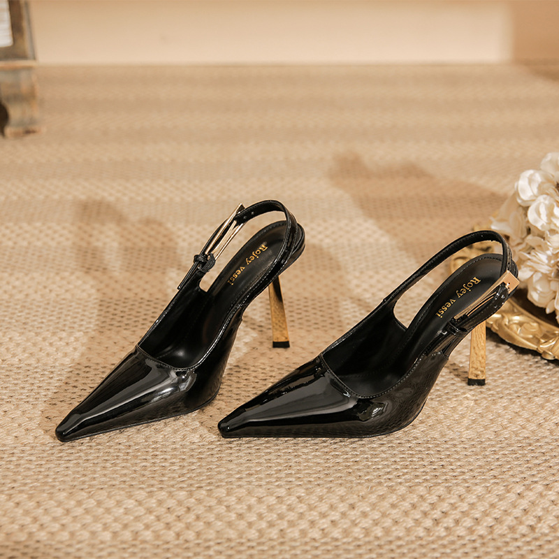 봄 2024 새로운 블랙 작은 골드 스트립 스틸레토 힐 포인트 특허 가죽 우아한 여성용 샌들
