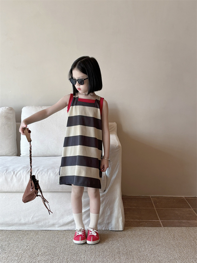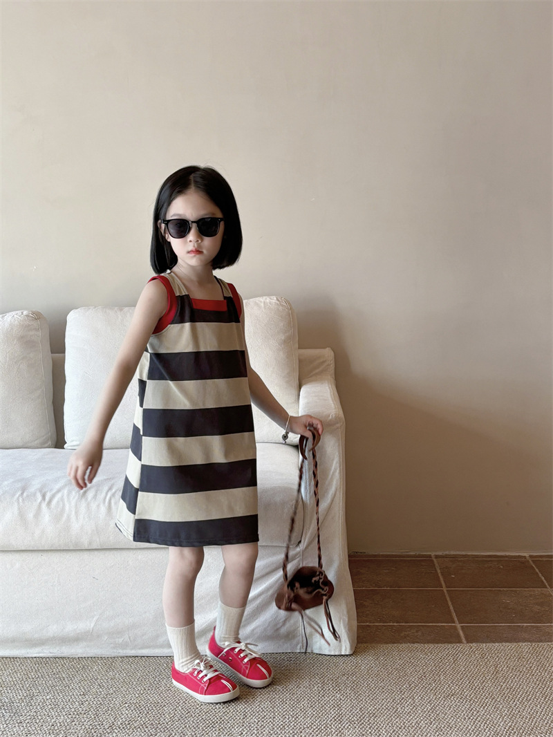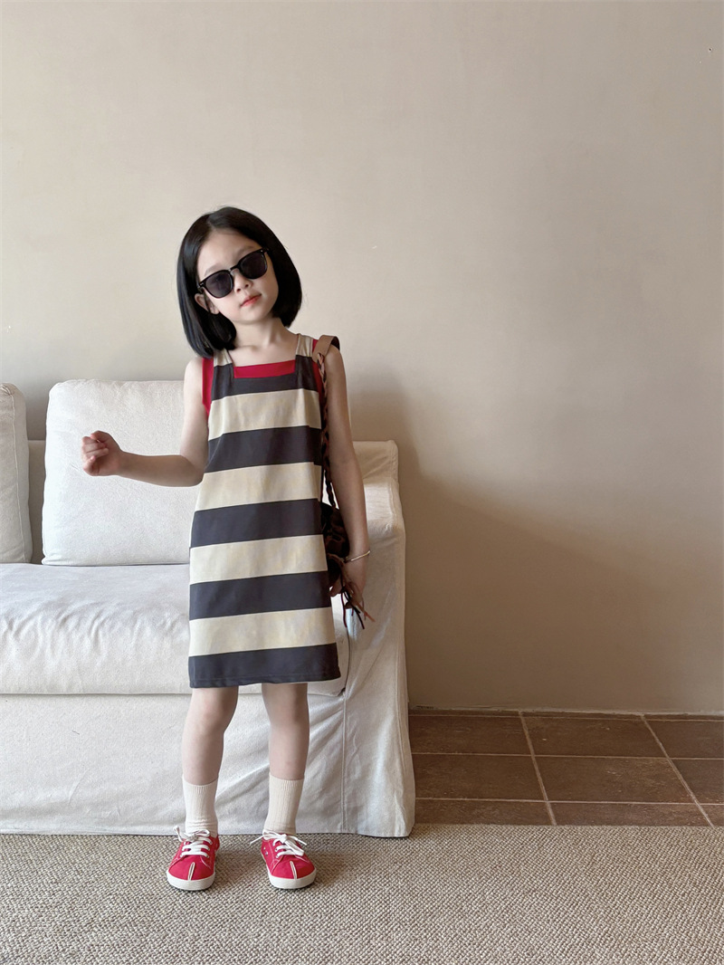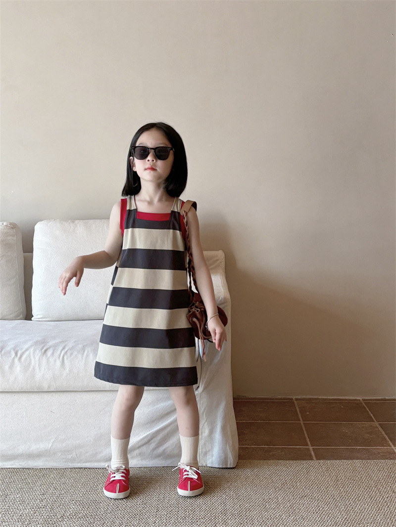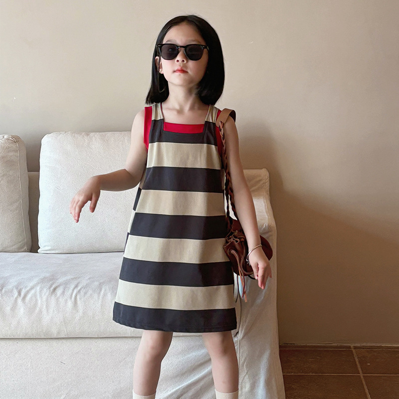 어린이 의류 소녀 원피스 아기 2024 새로운 여름 서양식 스트라이프 콘트라스트 컬러 조끼 치마 어린이 스커트 Q448