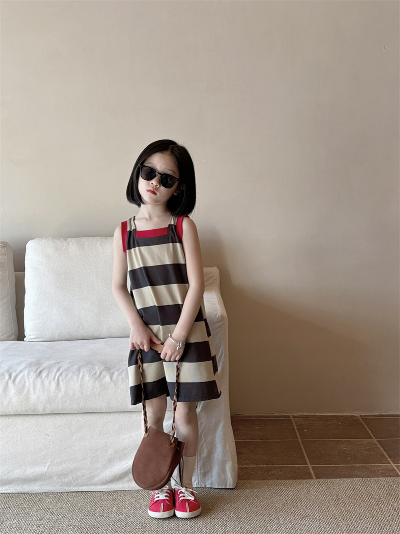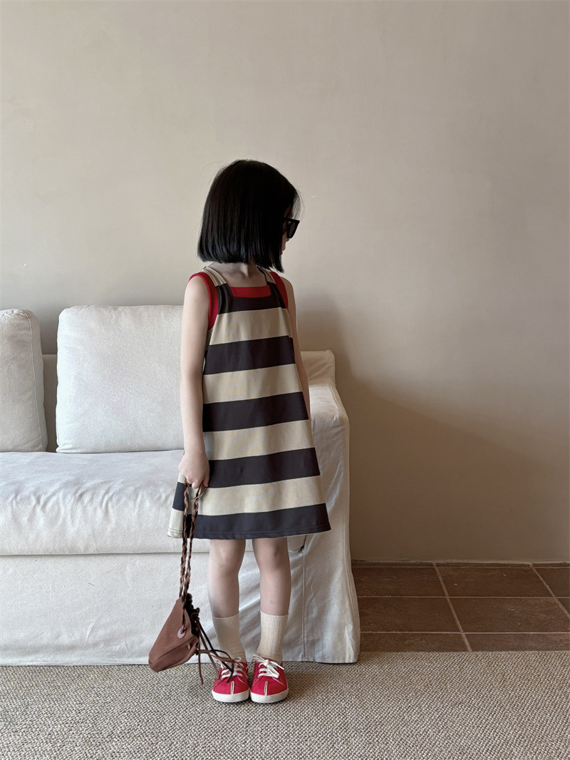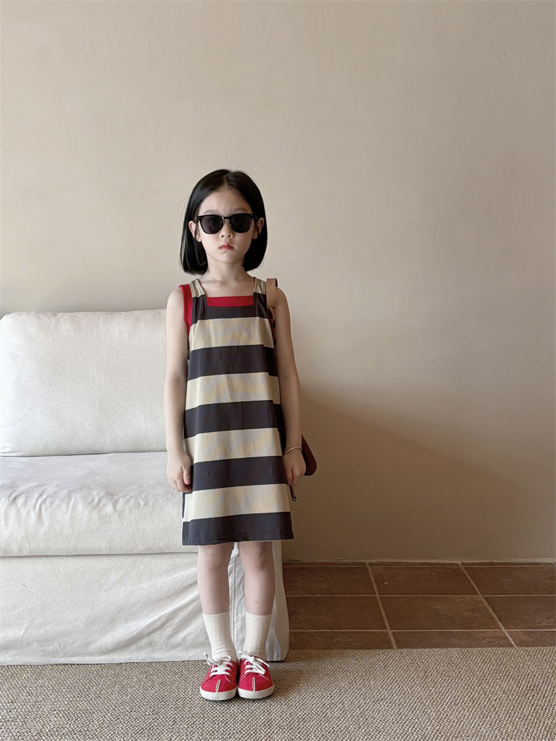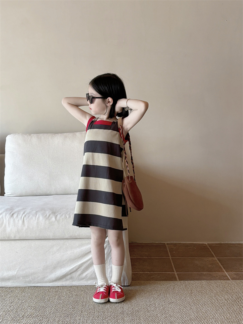 어린이 의류 소녀 원피스 아기 2024 새로운 여름 서양식 스트라이프 콘트라스트 컬러 조끼 치마 어린이 스커트 Q448