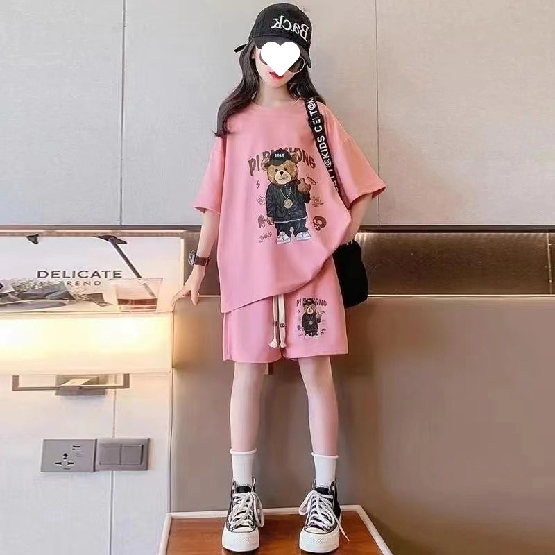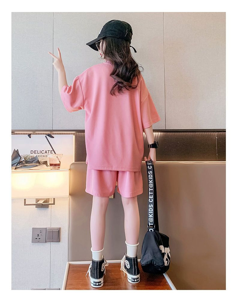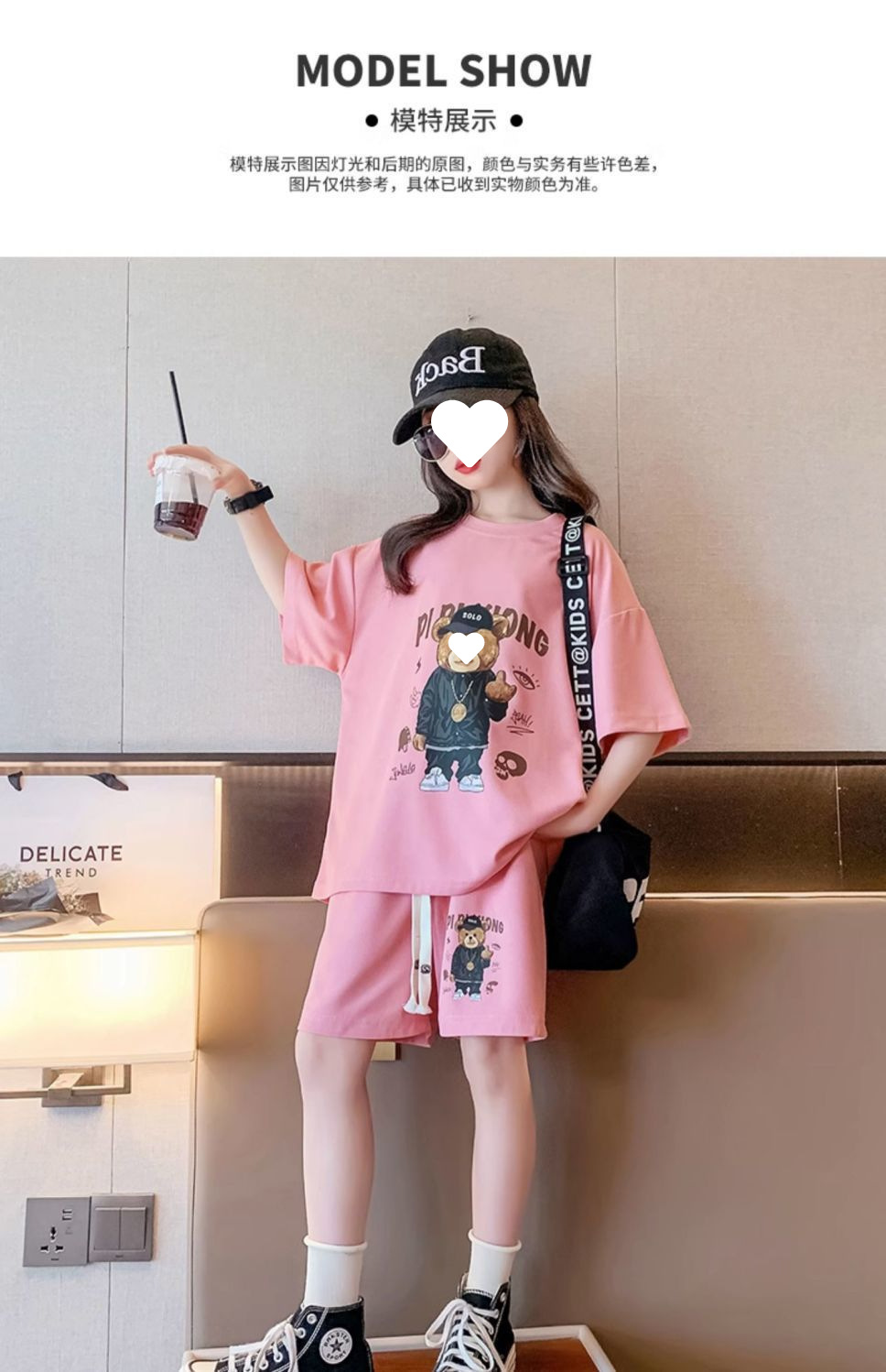 소녀 여름 반팔 티셔츠 세트 2024 새로운 큰 어린이 서양식 만화 탑 바지 스포츠 투피스 세트스토어 가기