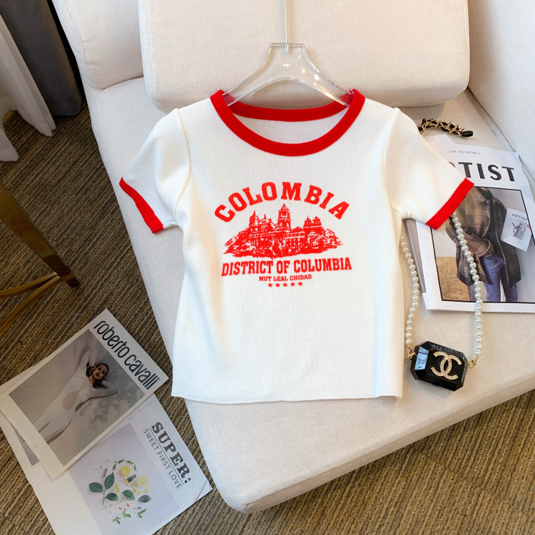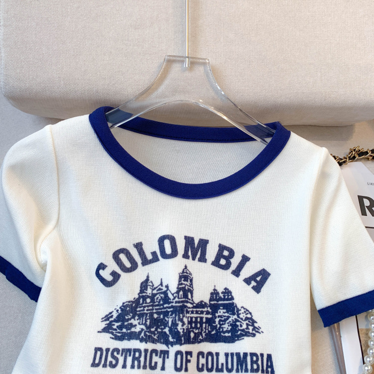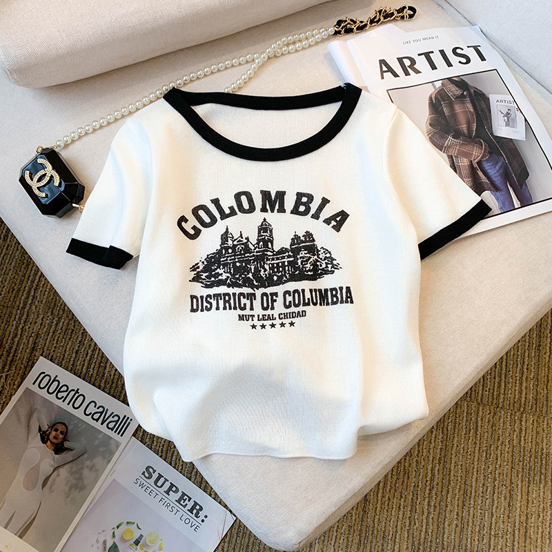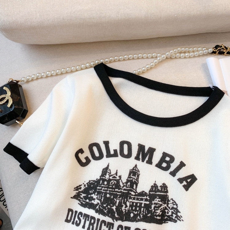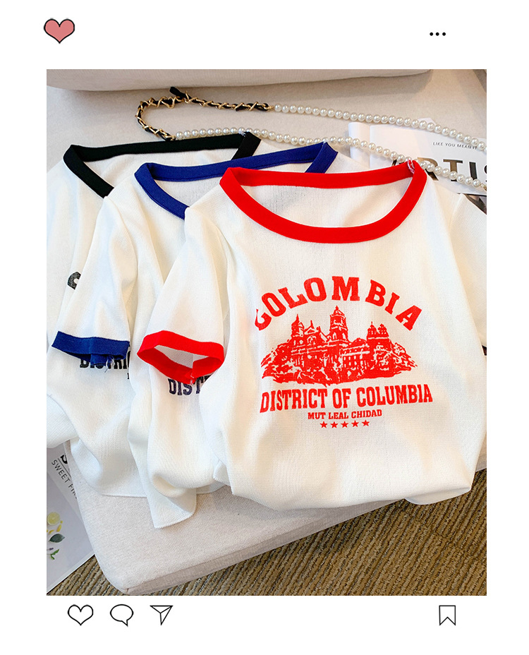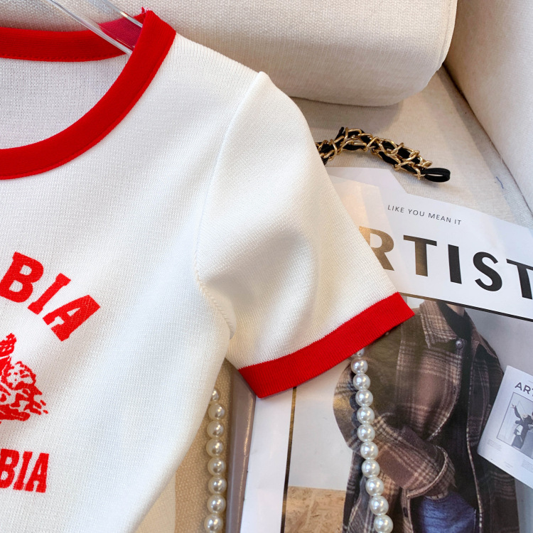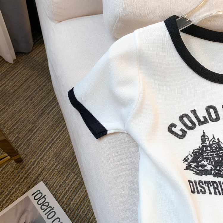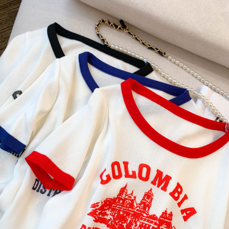 여름 유행 하이 스트리트 게으른 스타일 중장 스티칭 대조 컬러 탑 여성용 퓨어 코튼 반팔 티셔츠 여성용 한국식 니트스토어 가기